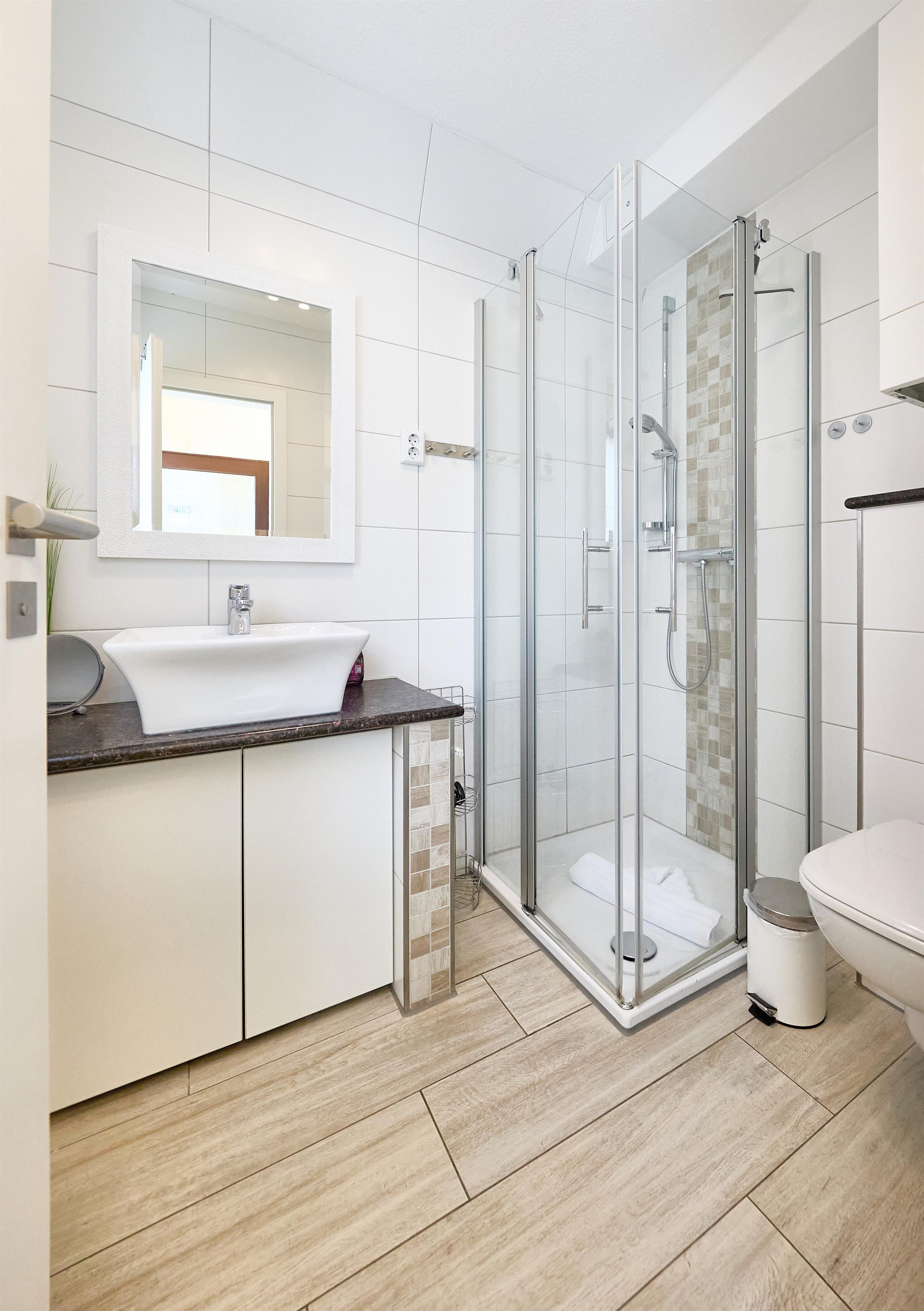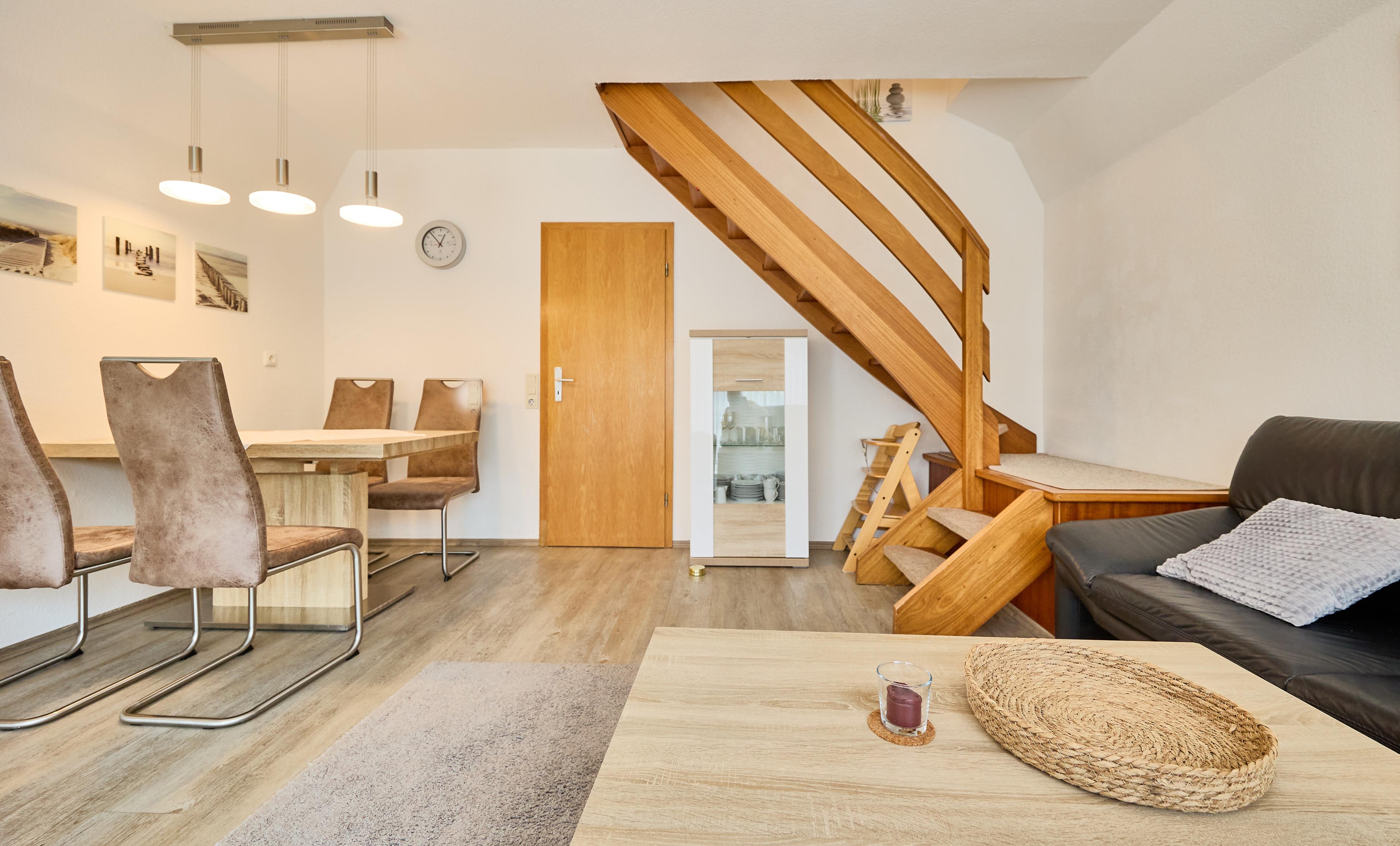 Im Erdgeschoss betreten Sie das Haus durch einen einladenden Windfang und finden eine gut ausgestattete Küche mit Geschirrspüler vor. Das angrenzende Duschbad bietet Ihnen Komfort und als besonderes Detail stehen Ihnen eine Waschmaschine und ein Trockner zur Verfügung – perfekt für einen unbeschwerten Aufenthalt.