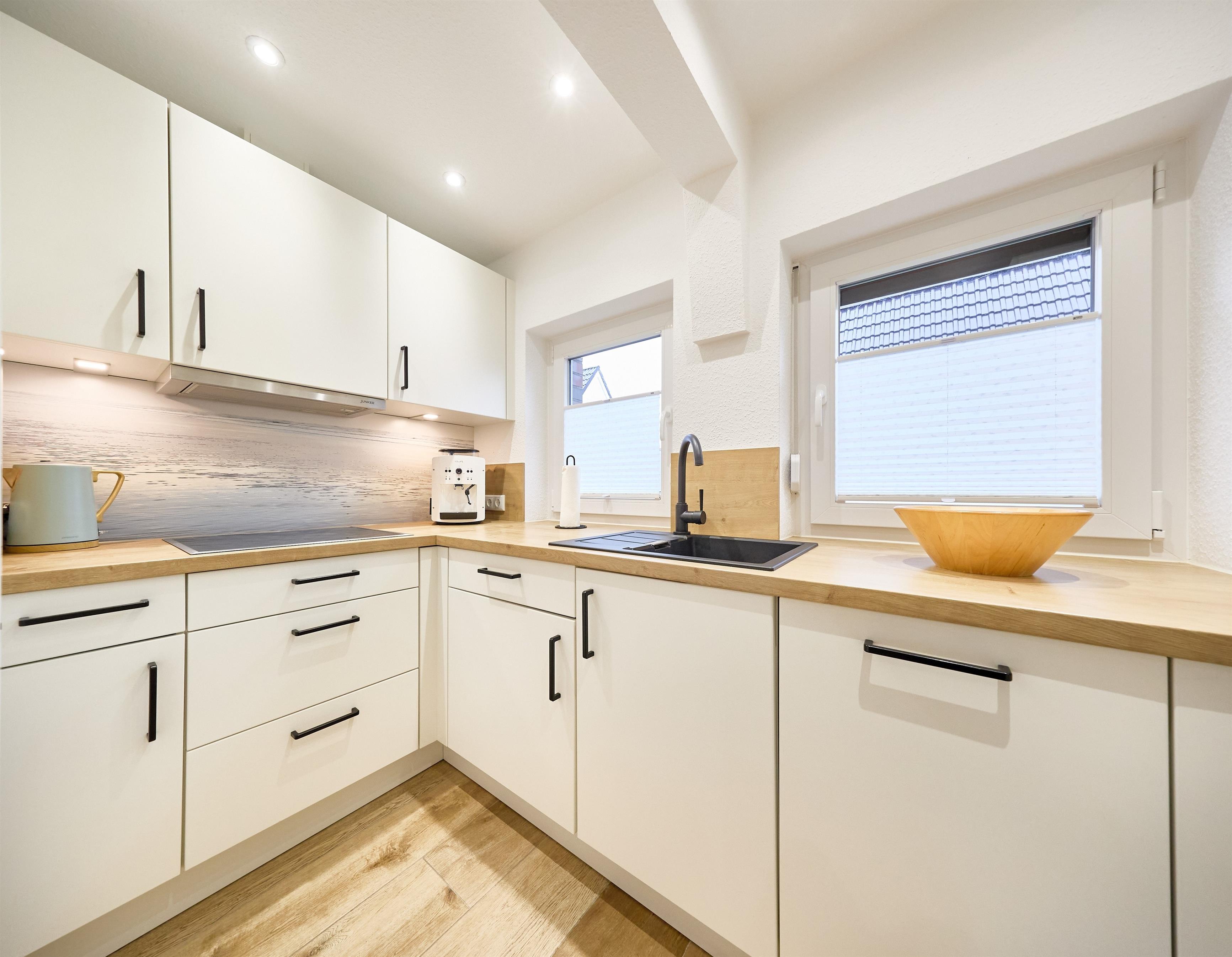 Offene, gut ausgestattete Küche mit Ceranfeld, Backofen, Spülmaschine, Mikrowelle, Kaffeemaschine und Siemens Kaffeevollautomat