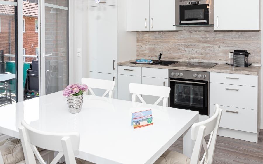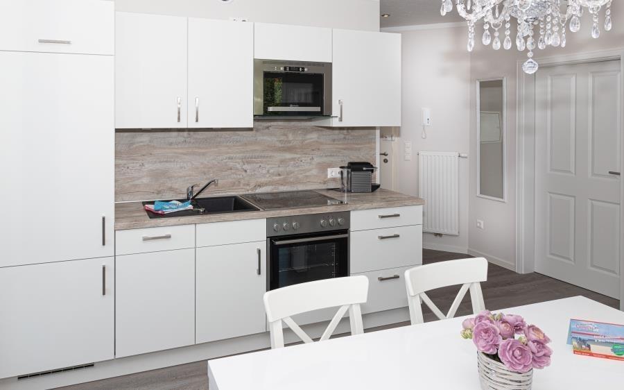 Die gut ausgestattete Küchenzeile fügt sich harmonisch in den Wohnbereich ein und bietet alles, was für eine entspannte Selbstversorgung benötigt wird:
