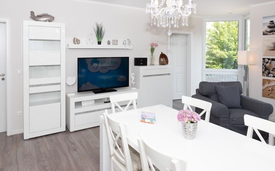 Die Wohnung besticht durch bodentiefe Fenster, viel Tageslicht und eine freundliche Atmosphäre. Der offen gestaltete Wohn- und Essbereich ist geschmackvoll eingerichtet und lädt zu gemeinsamen Stunden ein – ob entspannt auf dem Sofa, beim Essen oder am Abend vor dem Smart-TV. Ein hochwertiges Bose SoundTouch Internetradio sorgt für angenehme Klangqualität, während das kostenfreie WLAN die digitale Kommunikation erleichtert.