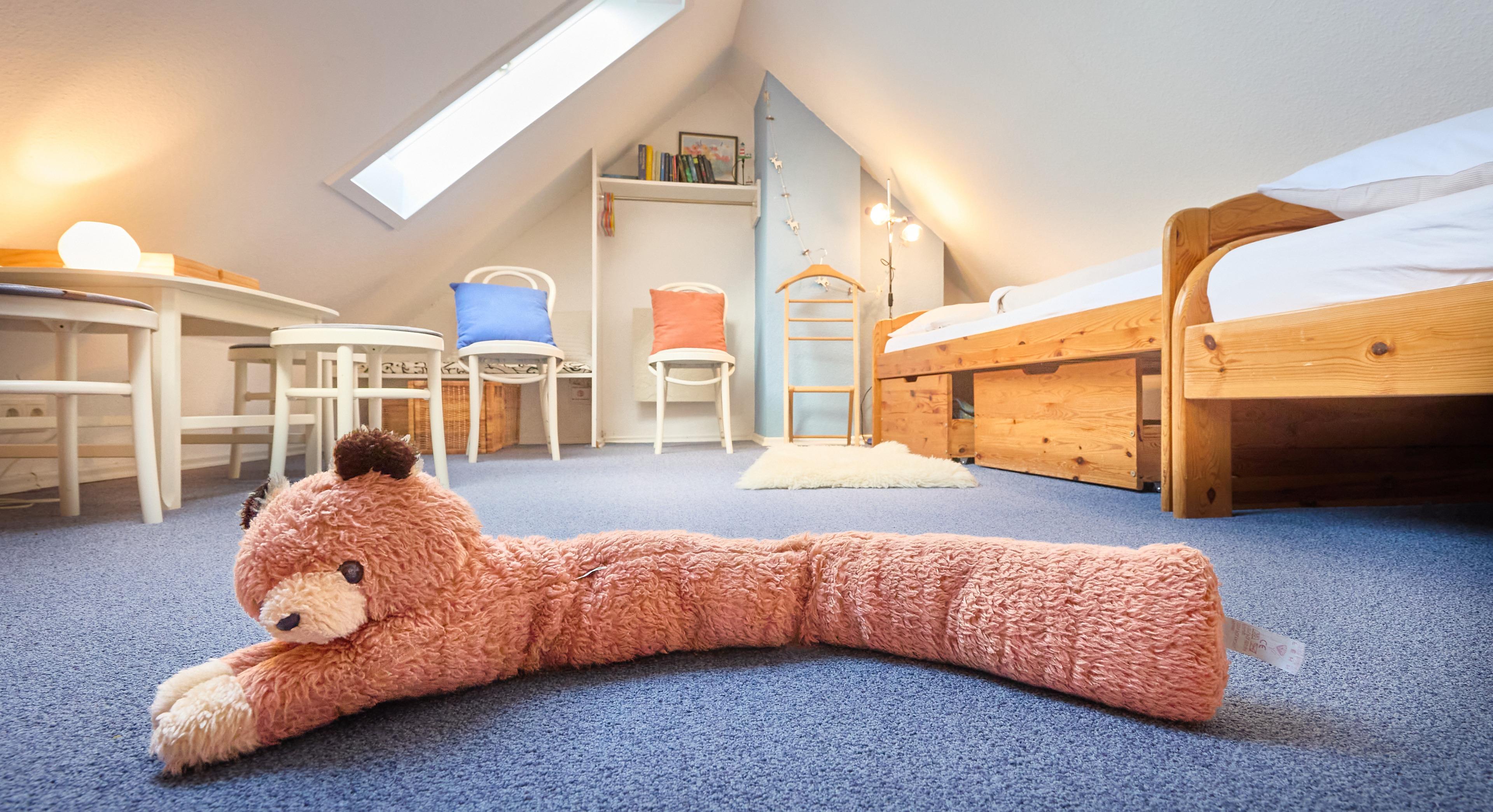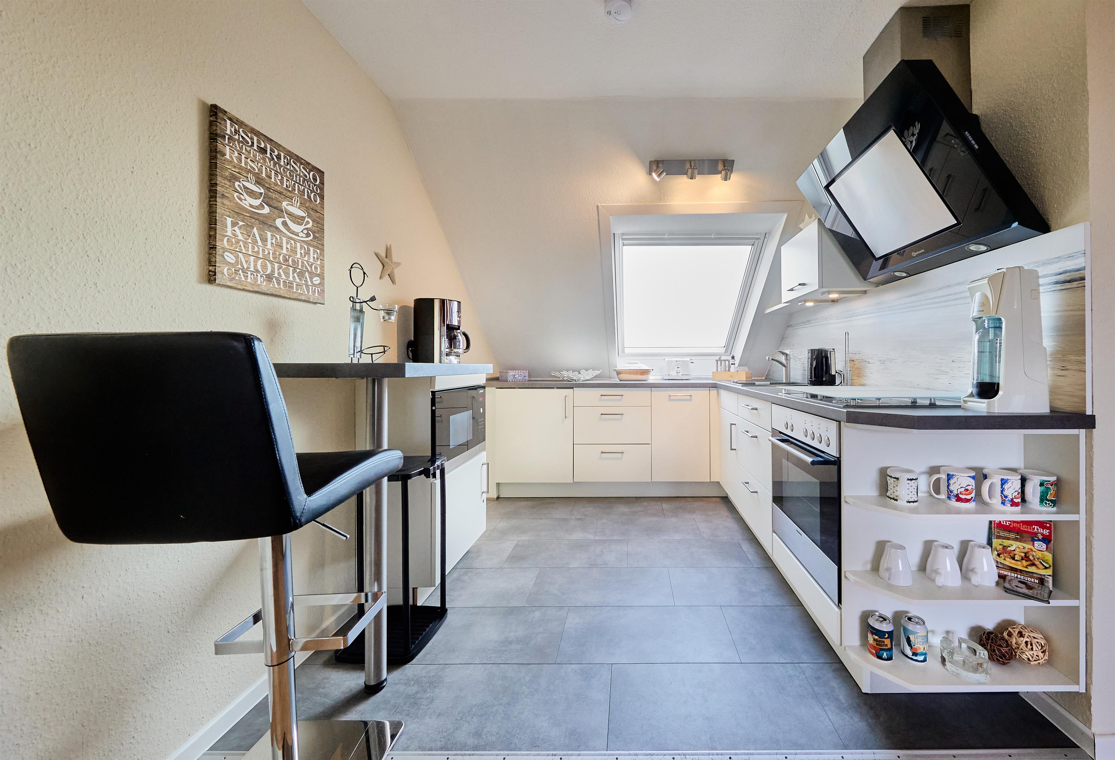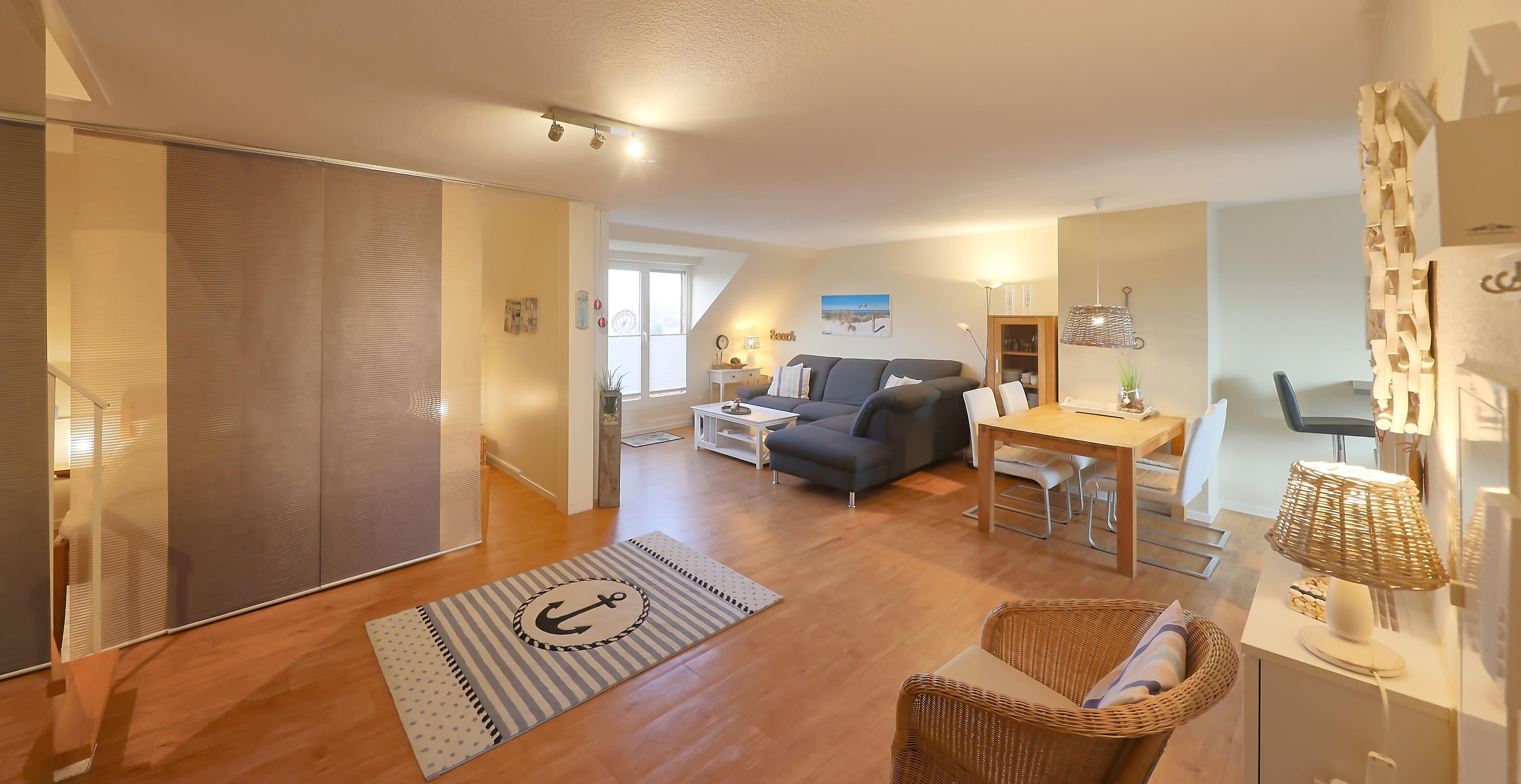 In diesem gemütlichen und schön gelegenen 2-Raum Ferienquartier, inkl. einer tollen Aufteilung für 4 Personen erwarten Sie helle Räume und eine gute Ausstattung. Die Ferienwohnung ist im 2.OG mit Fliesen ausgestattet und im DG, dem Kinderzimmer mit Teppich. Der Wohn- und Essbereich und Schlafbereich ist sehr gut aufgeteilt mit einem großzügigen Küchen- und Essbereich. Der Wohnbereich (mit TV, Radio-CD-USB- Player) ist gemütlich und lässt Sie von dem angrenzendem Süd-West Balkon bis in die Duhner Heide sehen. Der Schlafbereich ist abgetrennt hinter einem Vorhang, so das Sie am Tage nichts wegräumen brauchen. Im ausgebauten DG befindet sich ein Kinderzimmer mit 2 Einzelbetten, sowie ein Radio mit Cassetten und CD- Player. Das Duschbad mit WC hat ein Fenster. Im Haus befindet sich noch eine gemeinschaftlich genutzte, gebührenpflichtige Sauna mit Ruheraum und Kaminzimmer.