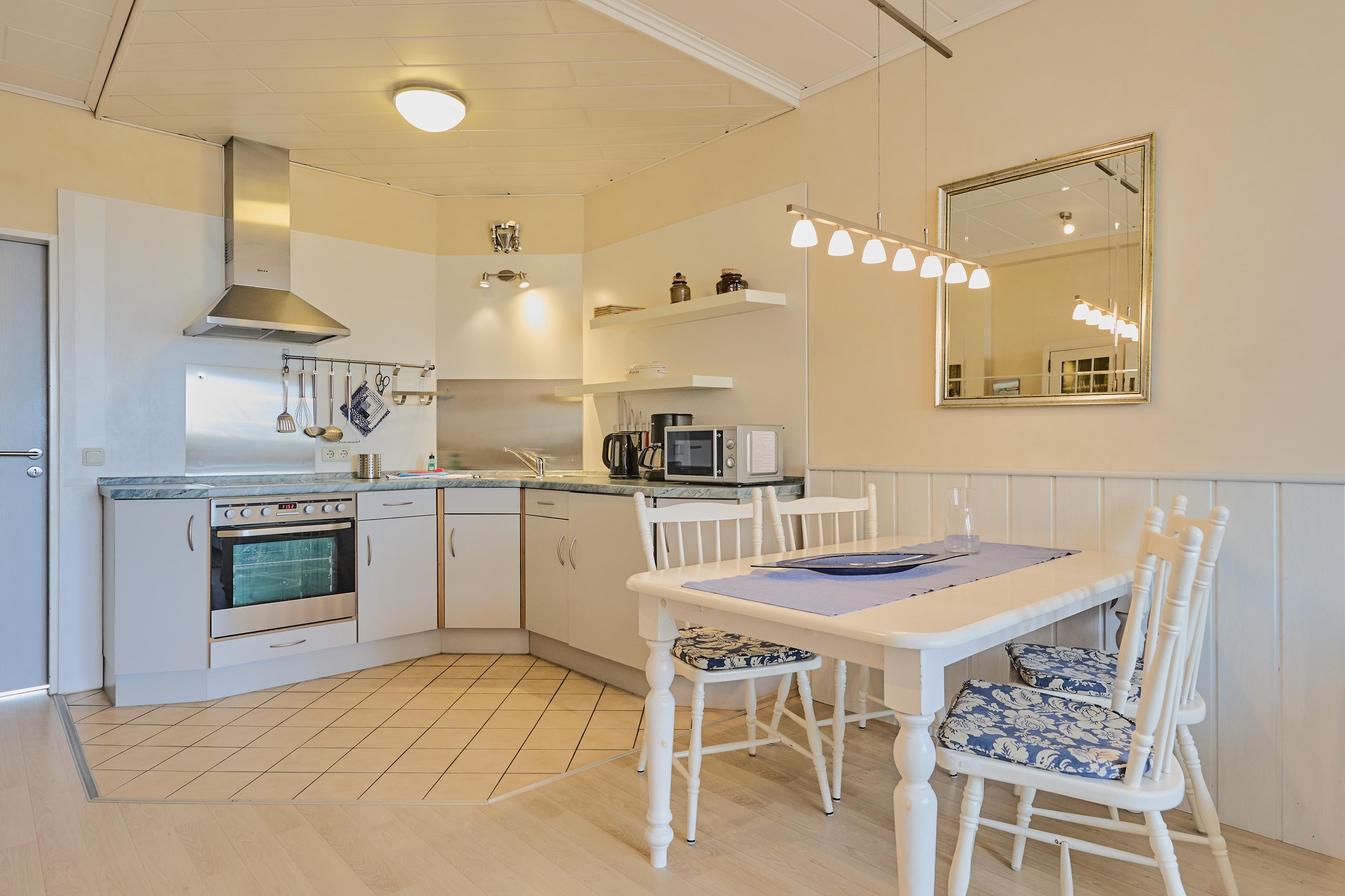 Die gemütliche Couchgarnitur mit einem Sofa und zwei Sesseln lädt zum Entspannen, Fernsehen, Lesen, Spielen oder einfach nur zum "Aus-dem-Fenster-Schauen" ein. Der Essbereich, mit einem ausziehbaren Esstisch und fünf Stühlen, bietet Platz für die ganze Familie. Der Kochbereich in der großzügigen Einbauküche über Eck im Holzdekor verfügt über einen Ceranfeld-Herd, Backofen, teilweise Dunstabzugshaube, Kühlschrank und Edelstahlspüle. Das Kochen macht hier selbst im Urlaub Spaß, dank der vielen praktischen Ausstattungsgegenstände.