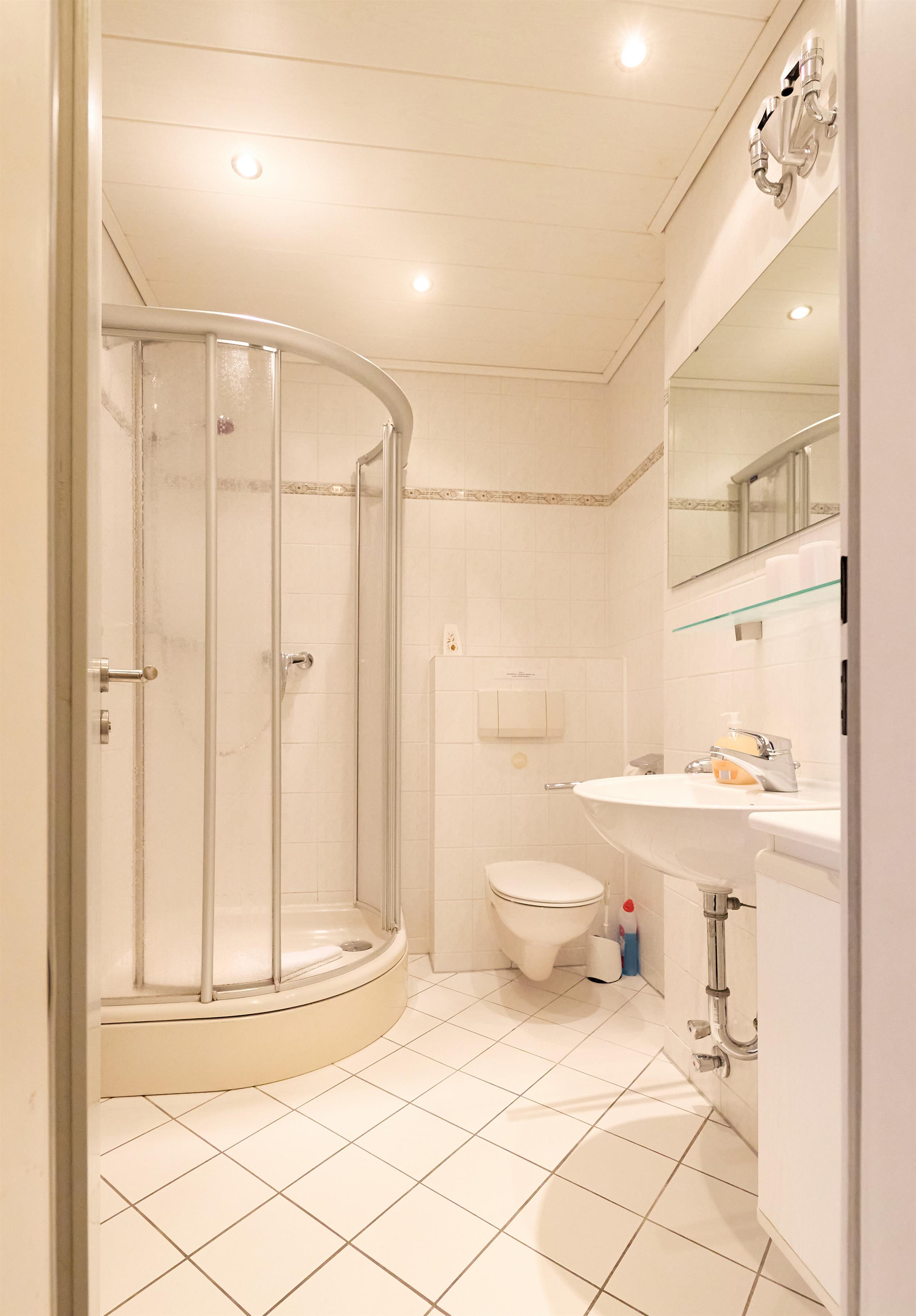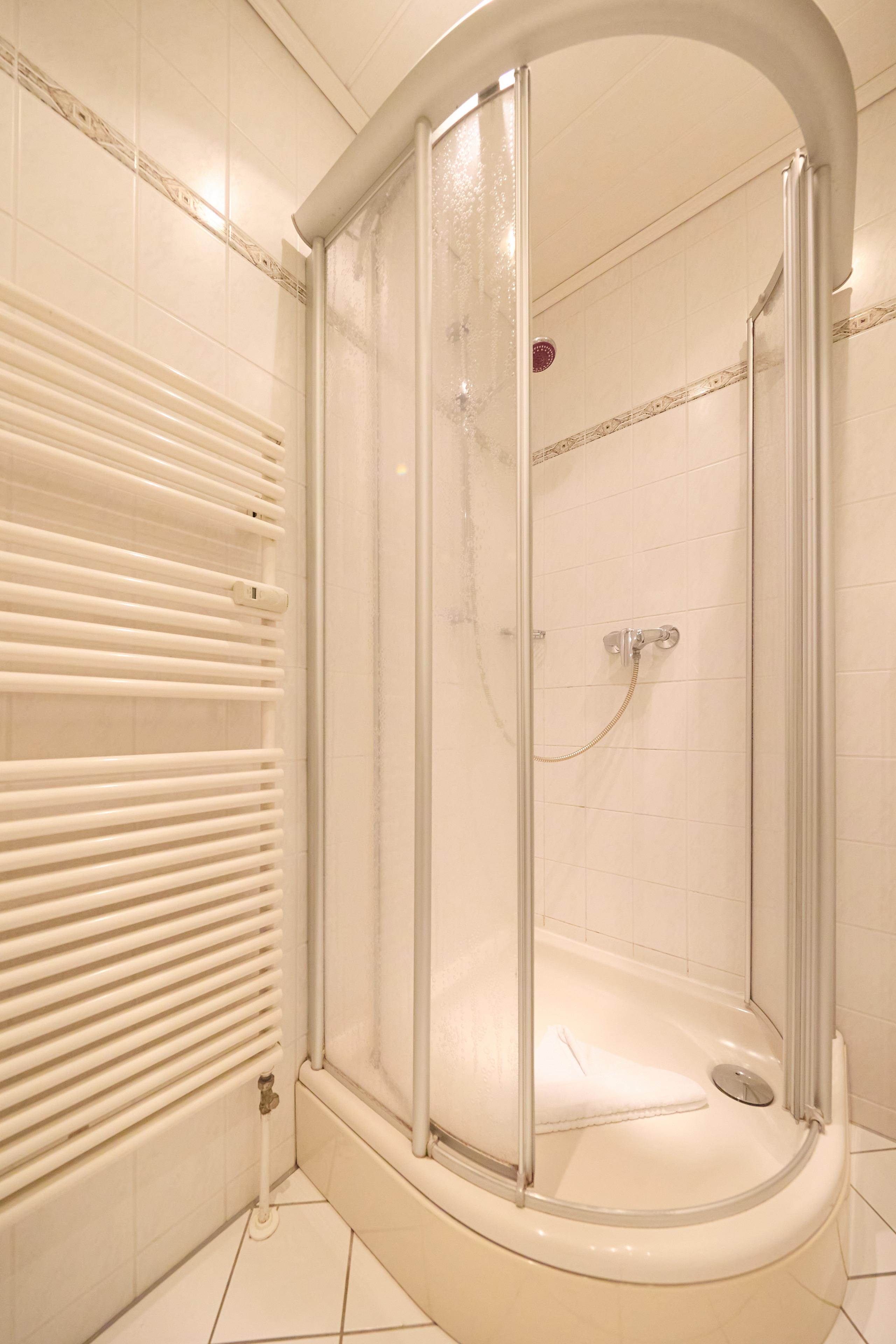 Das moderne Bad ist mit einer Eck-Runddusche, einem großen Handwaschbecken, Hänge-WC und mehreren Ablageschränken ausgestattet. Die hochwertige Fliesenverkleidung an Wänden und Fußboden verleiht dem Raum eine angenehme Atmosphäre. Der Heizkörper dient gleichzeitig als Handtuchtrockner.