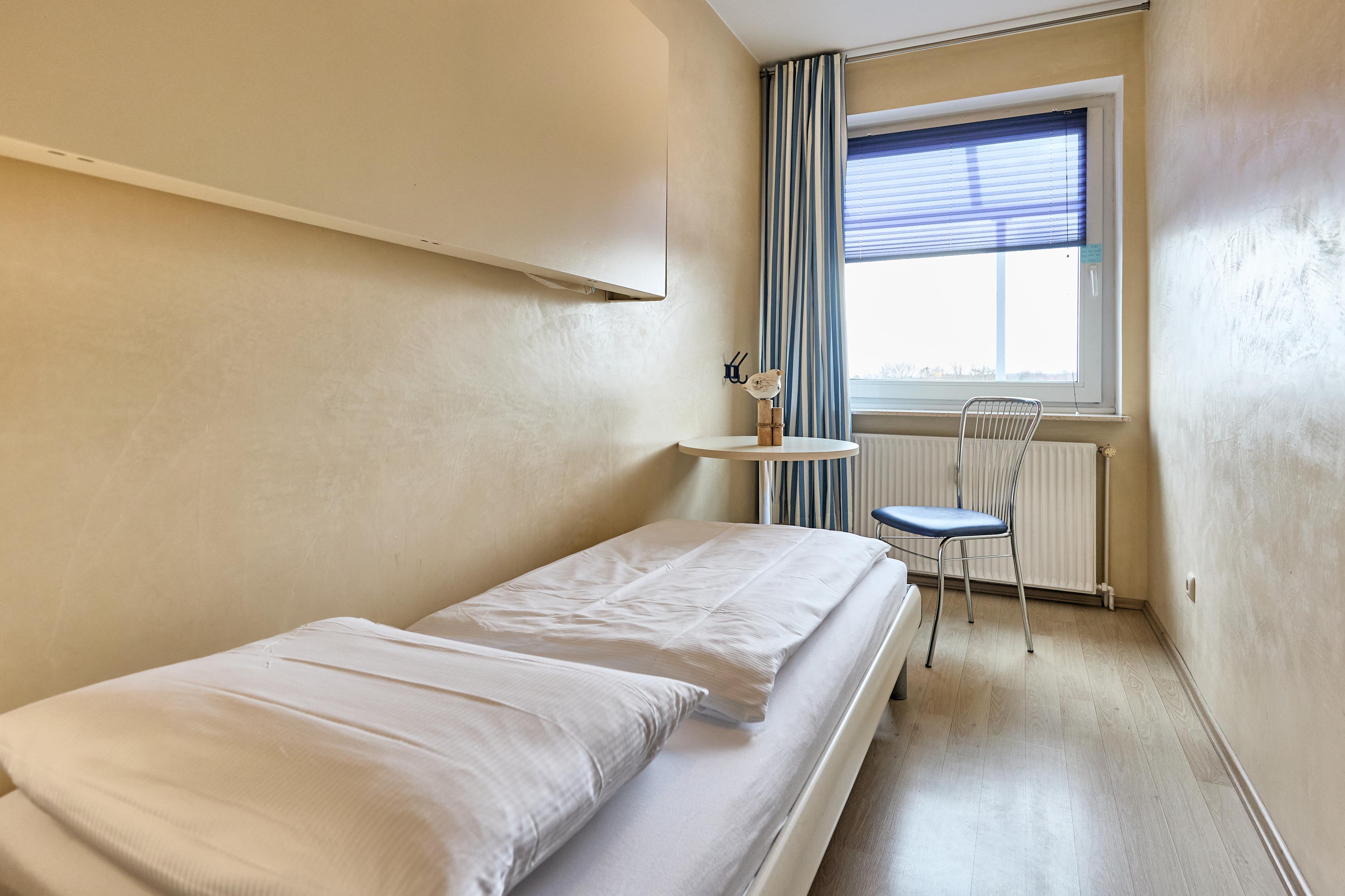 Im zweiten Schlafzimmer gibt es die Besonderheit eines Einzelbetts und eines wandklappbaren Etagenbetts, inspiriert von den großen Fährschiffen. Ein Einbauschrank ergänzt die Einrichtung.