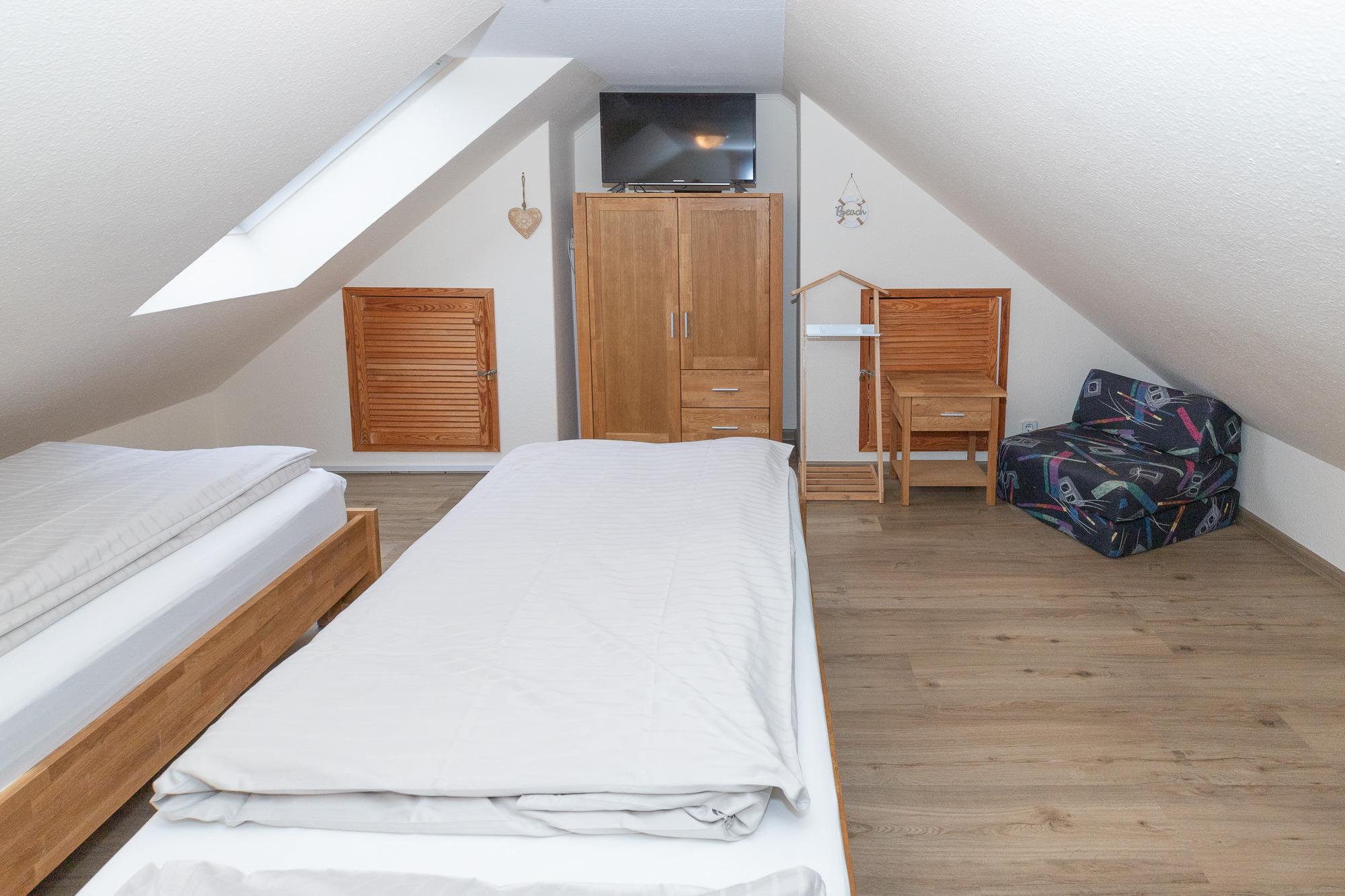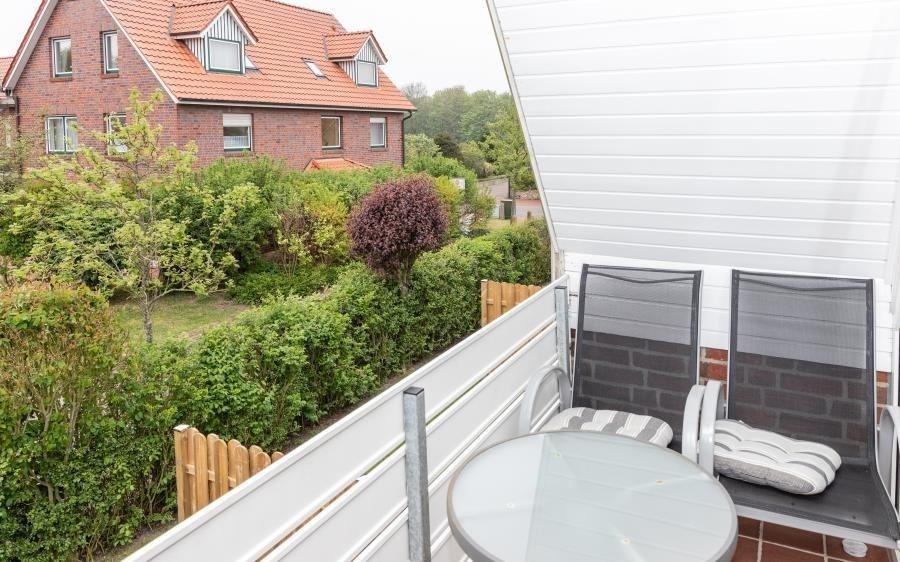 Maike 11b, 4-Raum, ca. 69m², 1. Obrgeschoss und Dachgeschoss, bis zu 5 Personen. Kostenfreier Strandkorb zum wohlfühlen am Duhner Strand. Die gemütlich und modern ausgestattete Ferienwohnung empfängt Sie im 1. Obergeschoss des Hauses und ist aufgeteilt mit einem kleinen Flur, Duschbad (Dusche/WC), Schlafzimmer mit Doppelbett und Kleiderschrank und einem weiteren Schlafbereich mit einem Einzelbett und einer Kommode, dem Wohnbereich mit großem Esstisch und der gut ausgestatteten Einbauküche. Vom Wohnbereich geht es auf den sonnigen Balkon (mit Balkonmöbeln). In dem sehr schönen ausgebauten Dachgeschoss (erreichbar über Treppe mit Sparstufen, für kleinere Kinder nur bedingt geeignet), mit Dielenboden ausgelegt, befindet sich ein weiteres Schlafzimmer mit 2 Einzelbetten und einer Sitzmöglichkeit. In diese Wohnung ist ein Baby-Reisebett leider nur sehr ungünstig zu stellen.