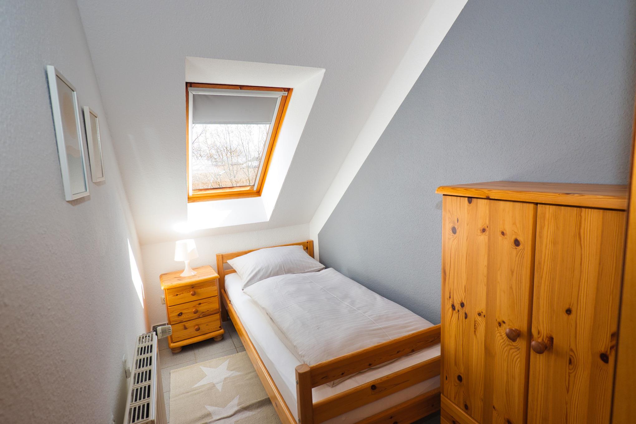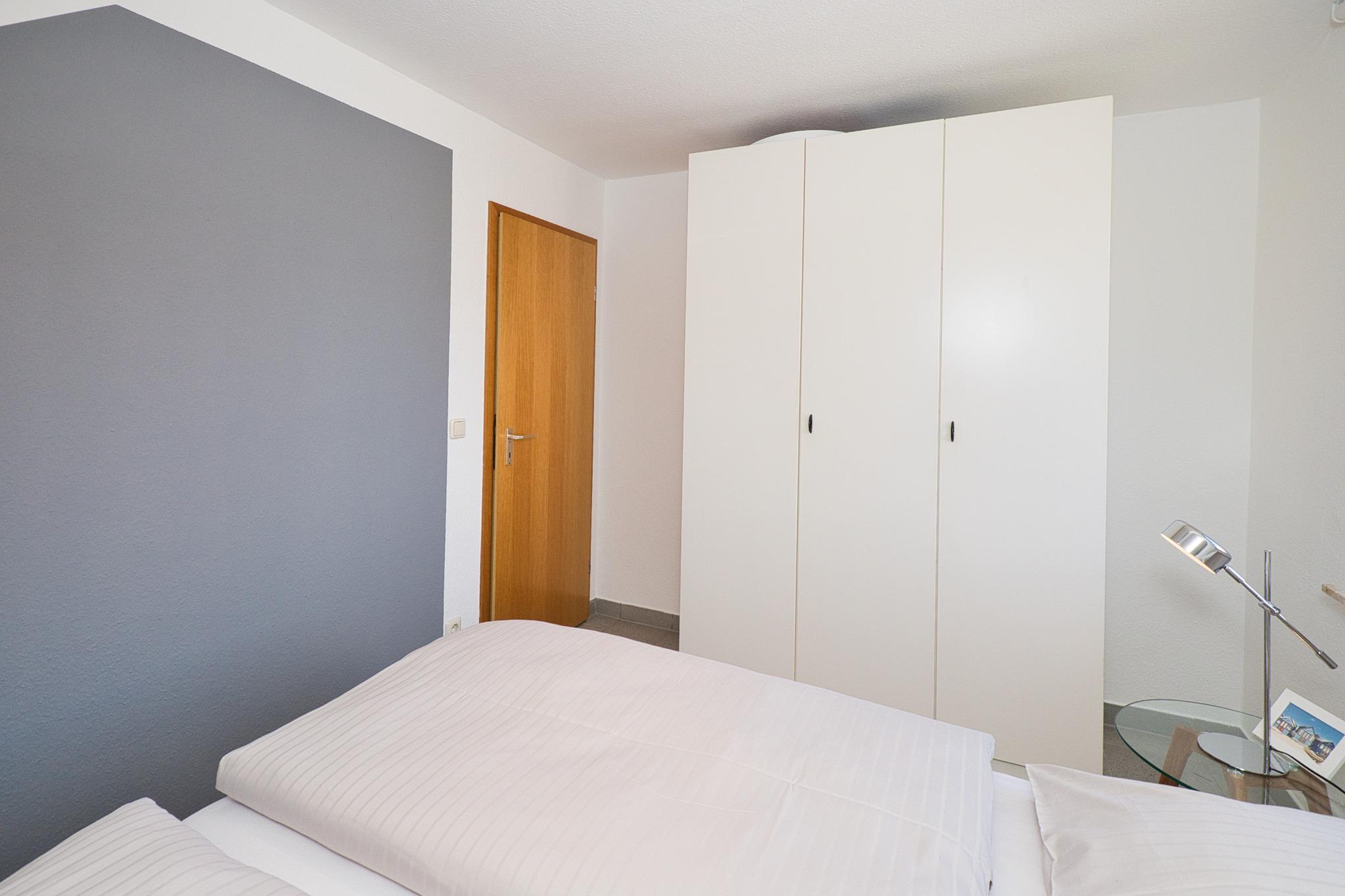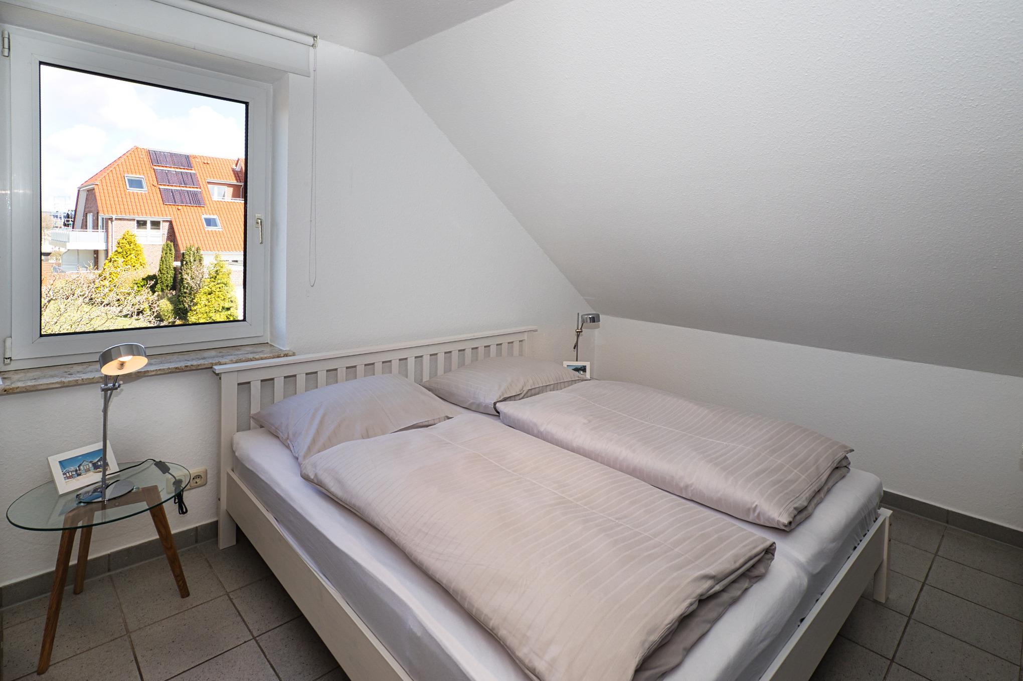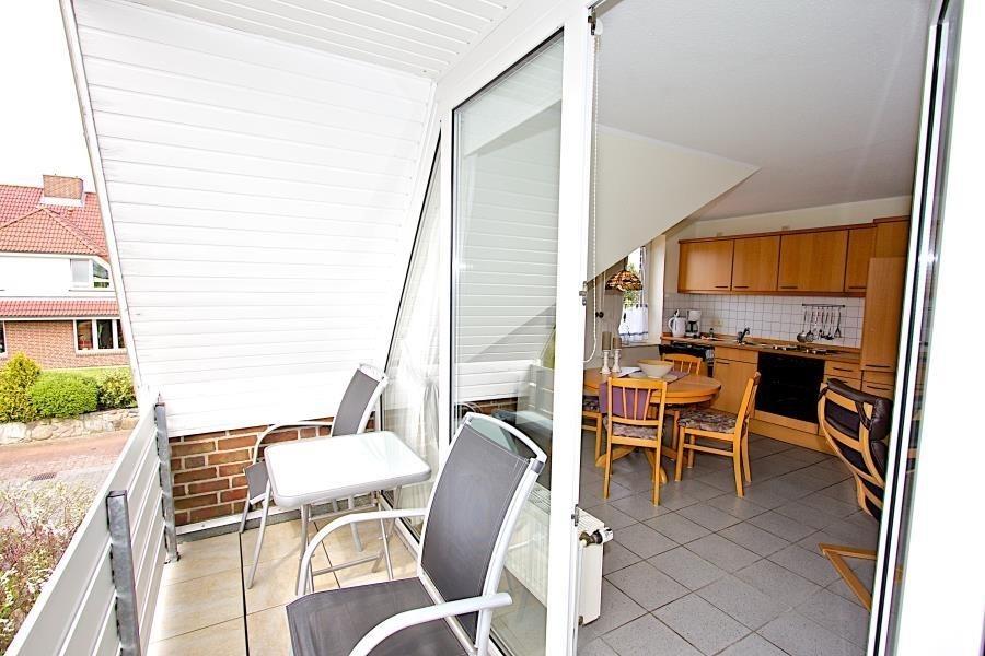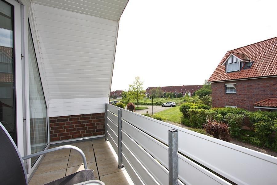 Maike 3b. Die schöne Ferienwohnung für bis zu 3 Personen liegt in der Anlage Maike im 1. OG eines Endreihenhauses und ist aufgeteilt mit einem kleinen Vorflur, Duschbad/WC, Schlafzimmer mit Doppelbett und einem weiteren Schlafbereich mit einem Einzelbett und Kleiderschrank für die 3. Person, dem Wohnbereich mit großem Esstisch und der gut ausgestatteten Küche. Vom Wohnbereich geht es auf den sonnigen Westbalkon. Eine Waschmaschine zur kostenfreien Nutzung steht für Sie im Badbereich zur Verfügung.
