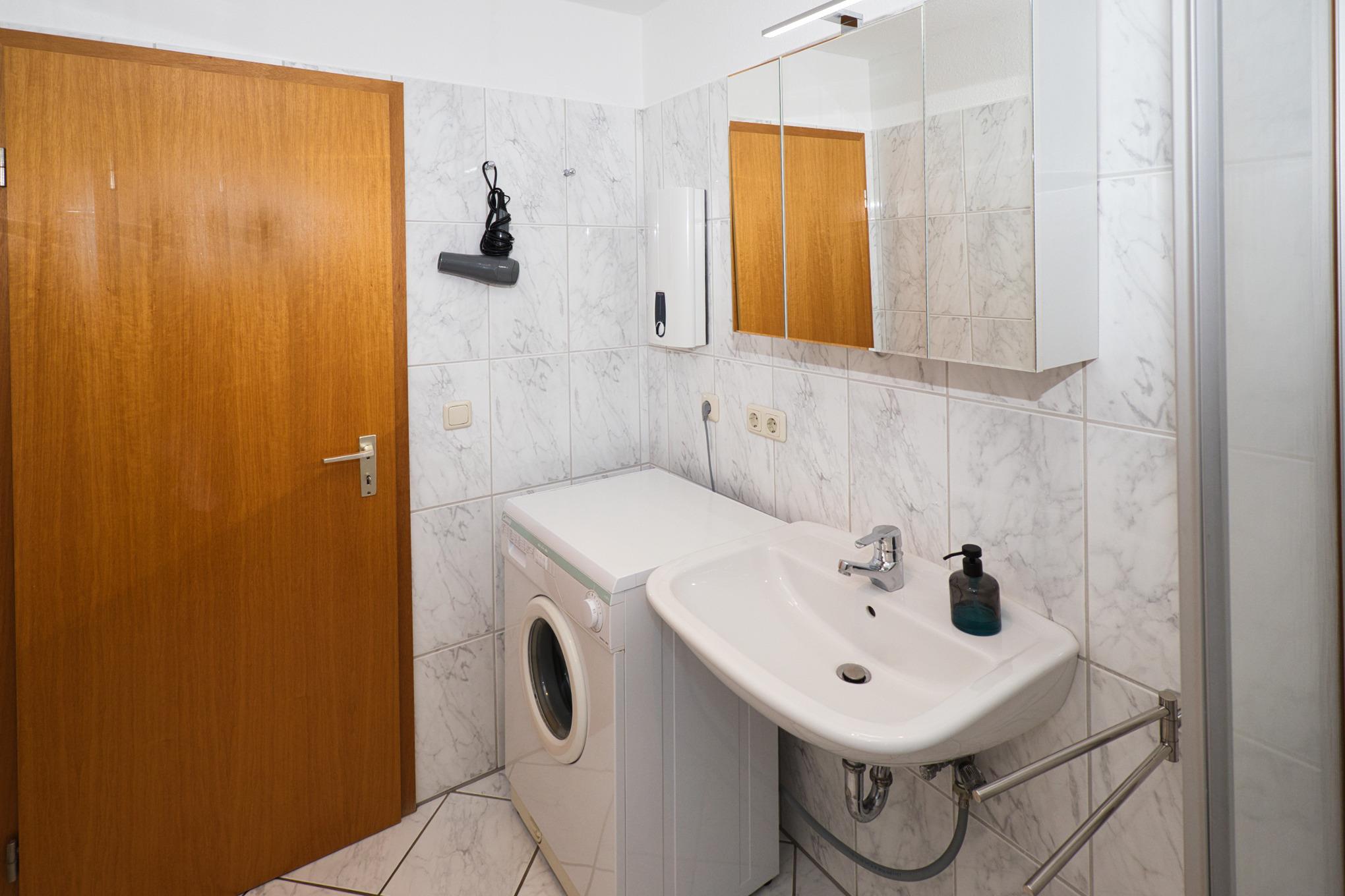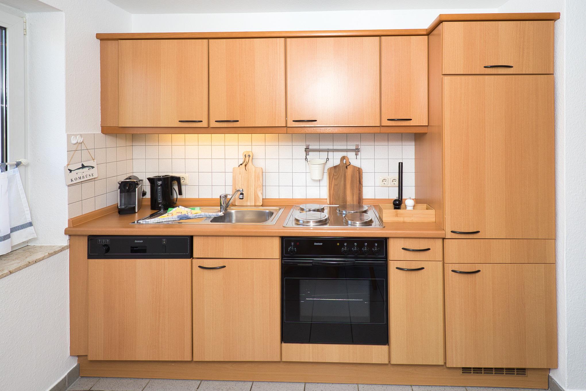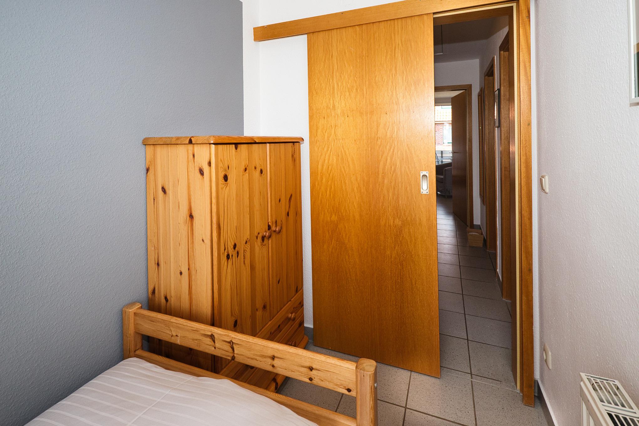 Maike 3b. Die schöne Ferienwohnung für bis zu 3 Personen liegt in der Anlage Maike im 1. OG eines Endreihenhauses und ist aufgeteilt mit einem kleinen Vorflur, Duschbad/WC, Schlafzimmer mit Doppelbett und einem weiteren Schlafbereich mit einem Einzelbett und Kleiderschrank für die 3. Person, dem Wohnbereich mit großem Esstisch und der gut ausgestatteten Küche. Vom Wohnbereich geht es auf den sonnigen Westbalkon. Eine Waschmaschine zur kostenfreien Nutzung steht für Sie im Badbereich zur Verfügung.