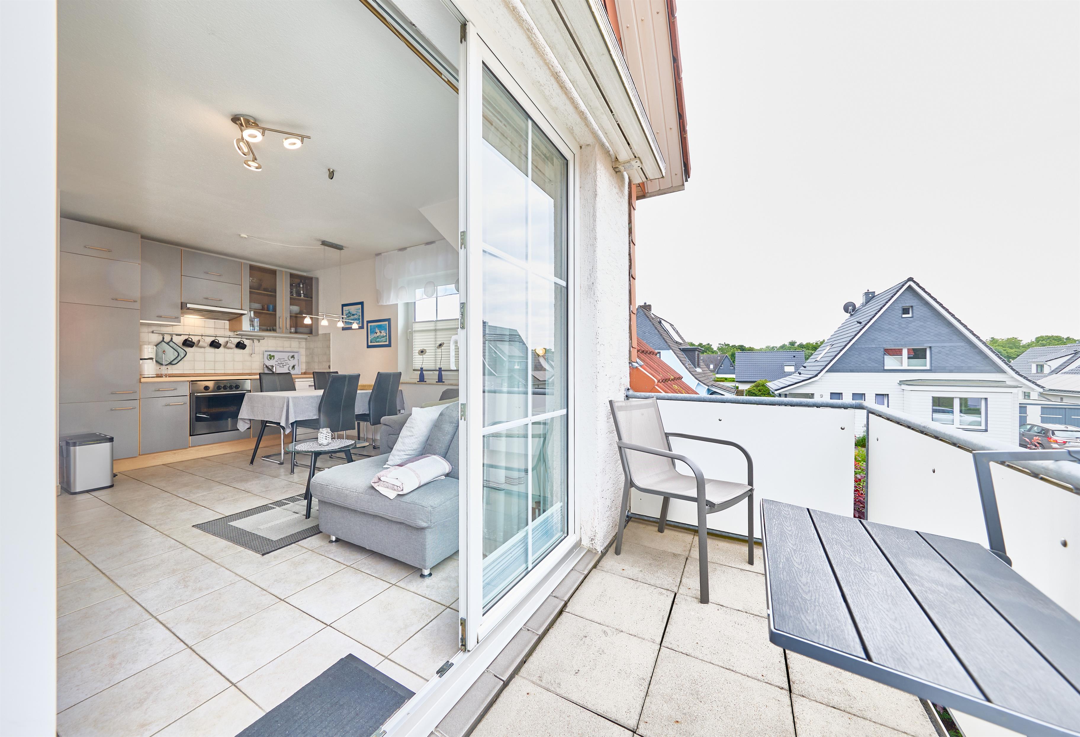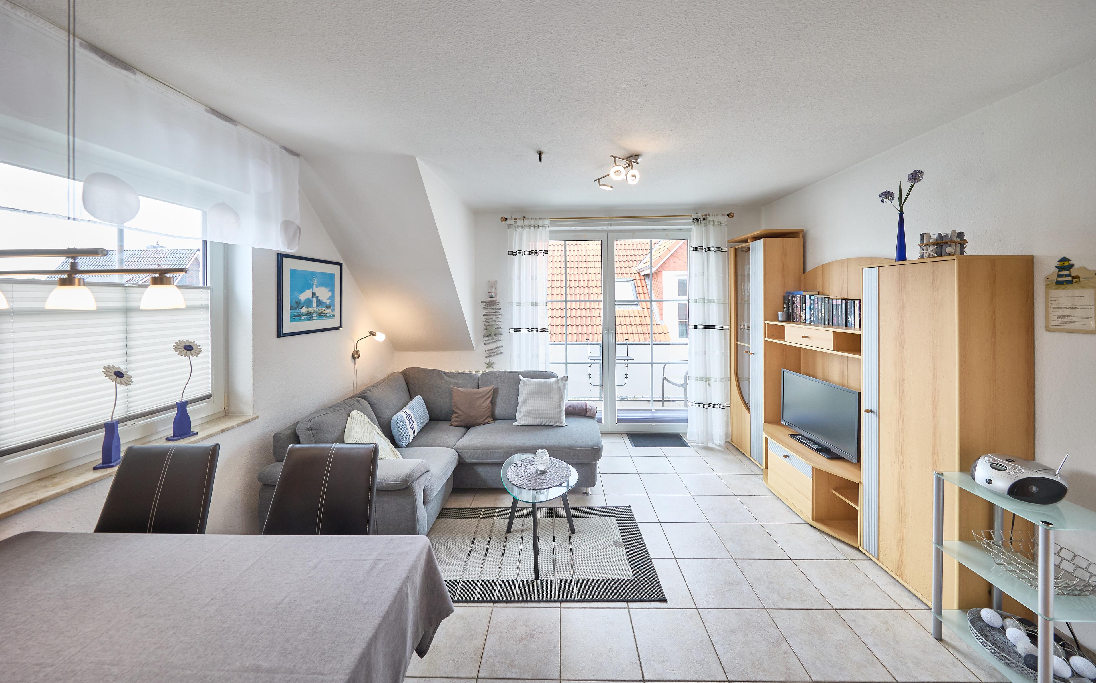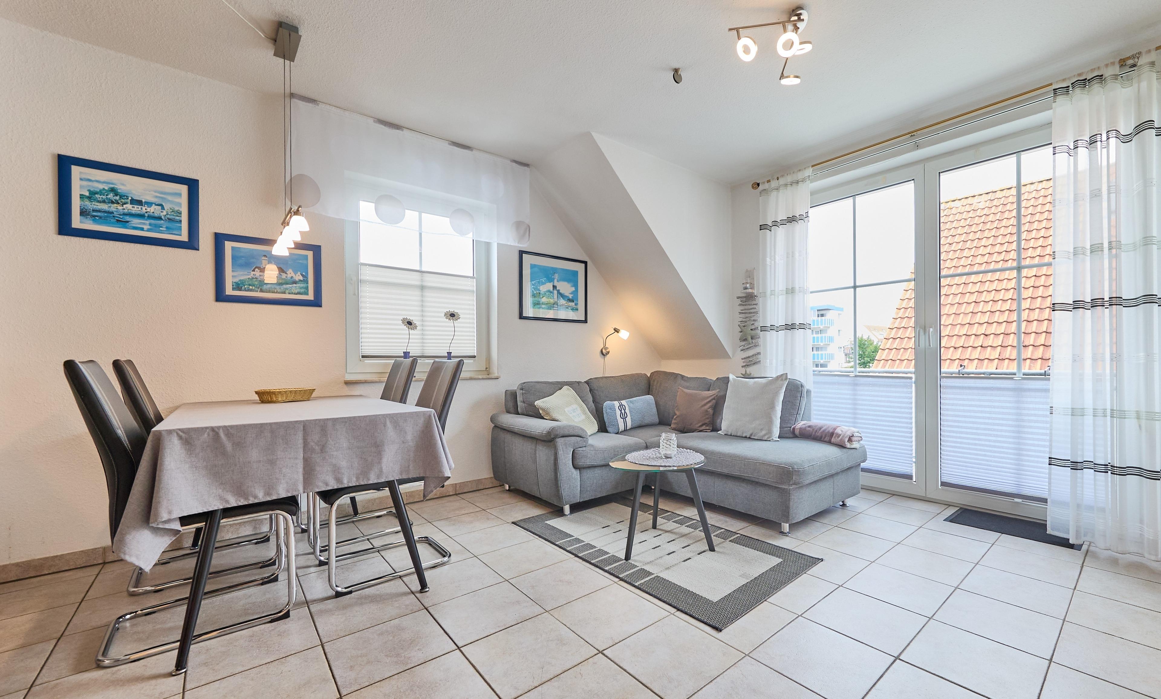 Neptun 10, Whg. 4, 3-Raum, 1.OG + DG, ca. 64m², bis zu 4 Personen, kleiner Spielbereich im Dachgeschoss für die "Kleinen". Die Ferienwohnung ist für bis zu 4 Personen geeignet und ist aufgeteilt mit einem separaten Schlafzimmer mit einem Doppelbett (im 1.OG) und einem "Kinderzimmer" mit 2 Einzelbetten und einem Spielbereich für die "Kleinen" (im ausgebauten DG, Zugang über Spartreppe), einem hellen Duschbad/WC, dem Wohnbereich mit Zugang zum Balkon und dem Essbereich mit der komfortablen Einbauküche. Der gemütliche und sonnige Balkon, mit Balkonmöbeln lädt zum urlauben ein.