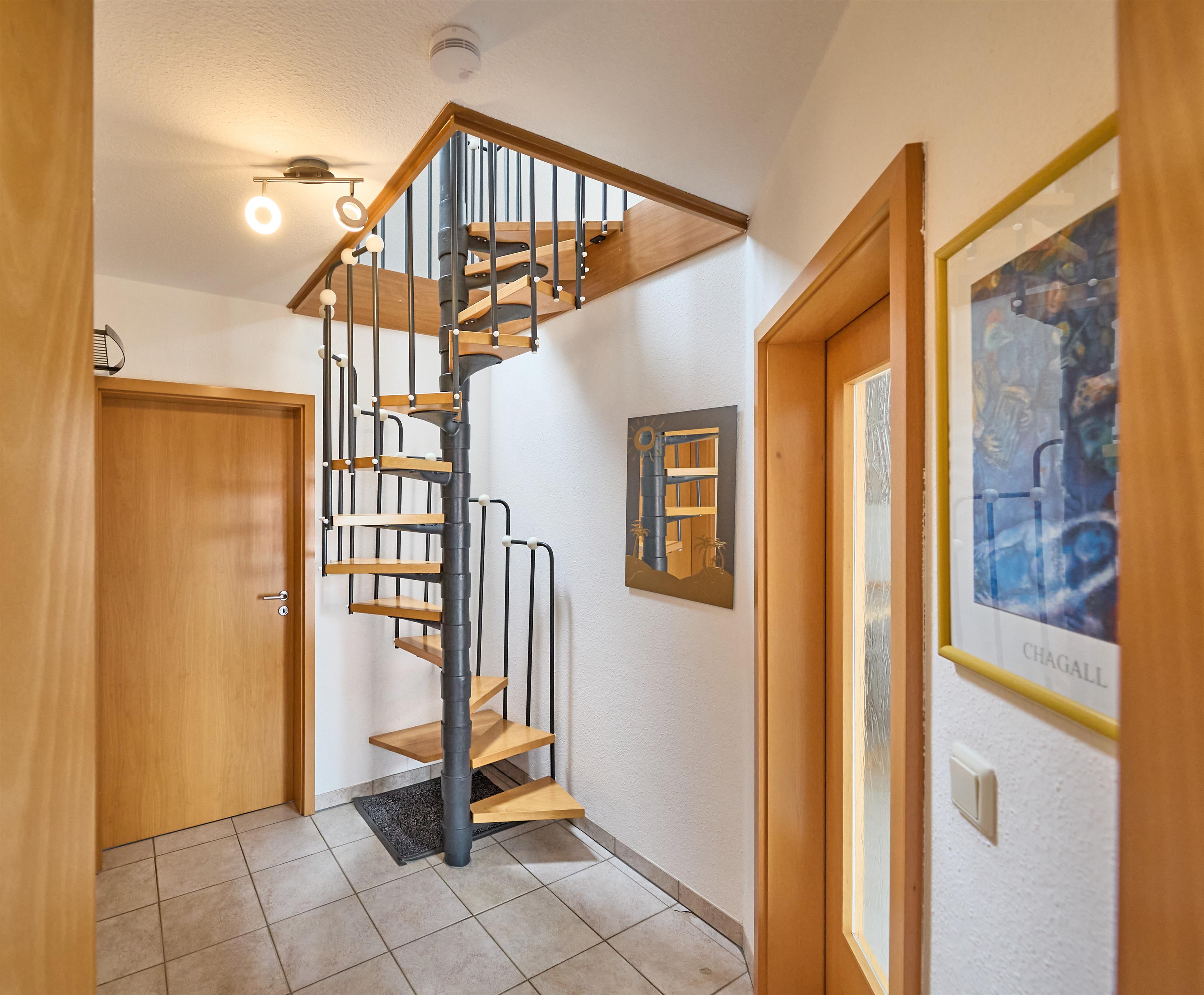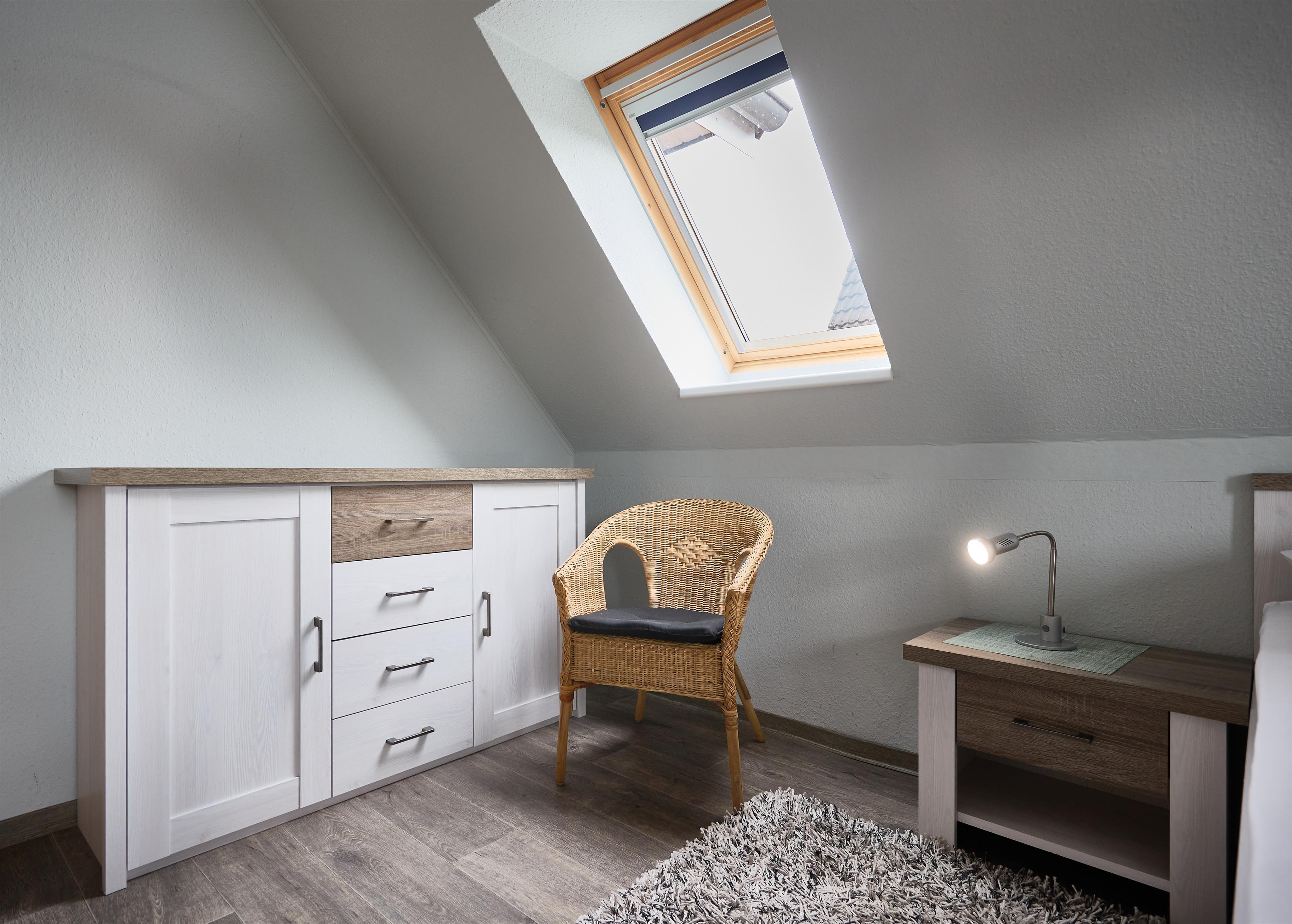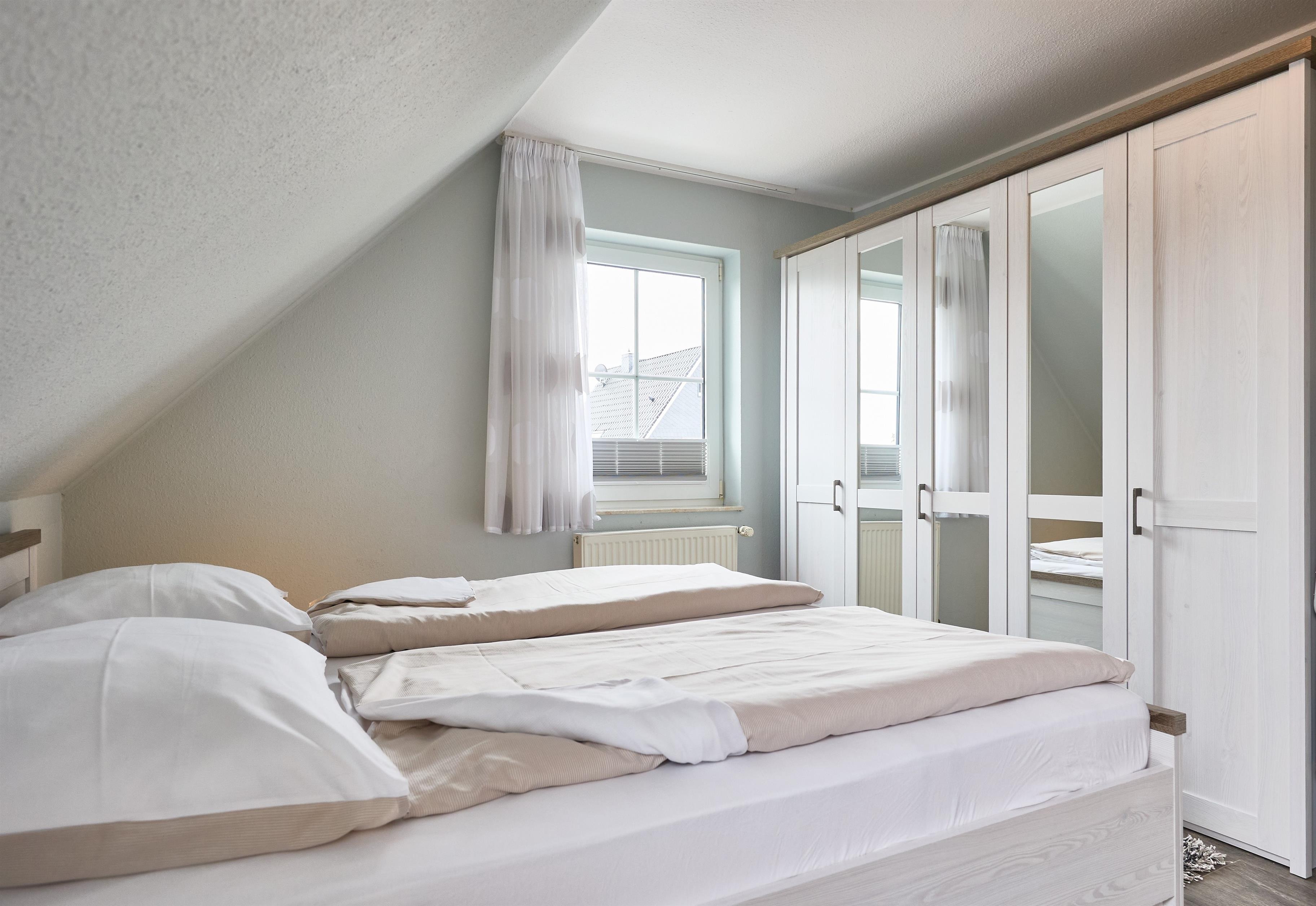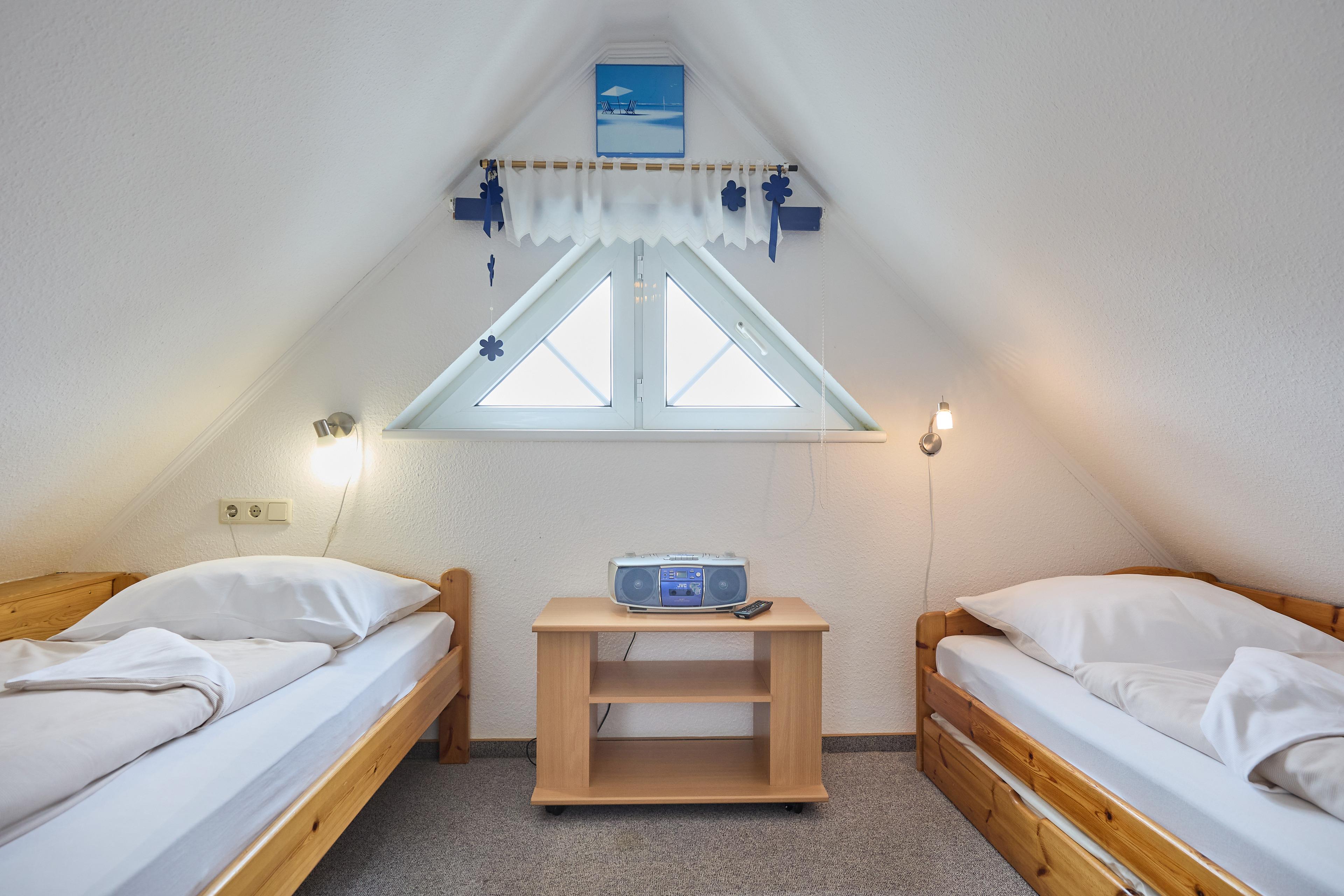 Neptun 10, Whg. 4, 3-Raum, 1.OG + DG, ca. 64m², bis zu 4 Personen, kleiner Spielbereich im Dachgeschoss für die "Kleinen". Die Ferienwohnung ist für bis zu 4 Personen geeignet und ist aufgeteilt mit einem separaten Schlafzimmer mit einem Doppelbett (im 1.OG) und einem "Kinderzimmer" mit 2 Einzelbetten und einem Spielbereich für die "Kleinen" (im ausgebauten DG, Zugang über Spartreppe), einem hellen Duschbad/WC, dem Wohnbereich mit Zugang zum Balkon und dem Essbereich mit der komfortablen Einbauküche. Der gemütliche und sonnige Balkon, mit Balkonmöbeln lädt zum urlauben ein.