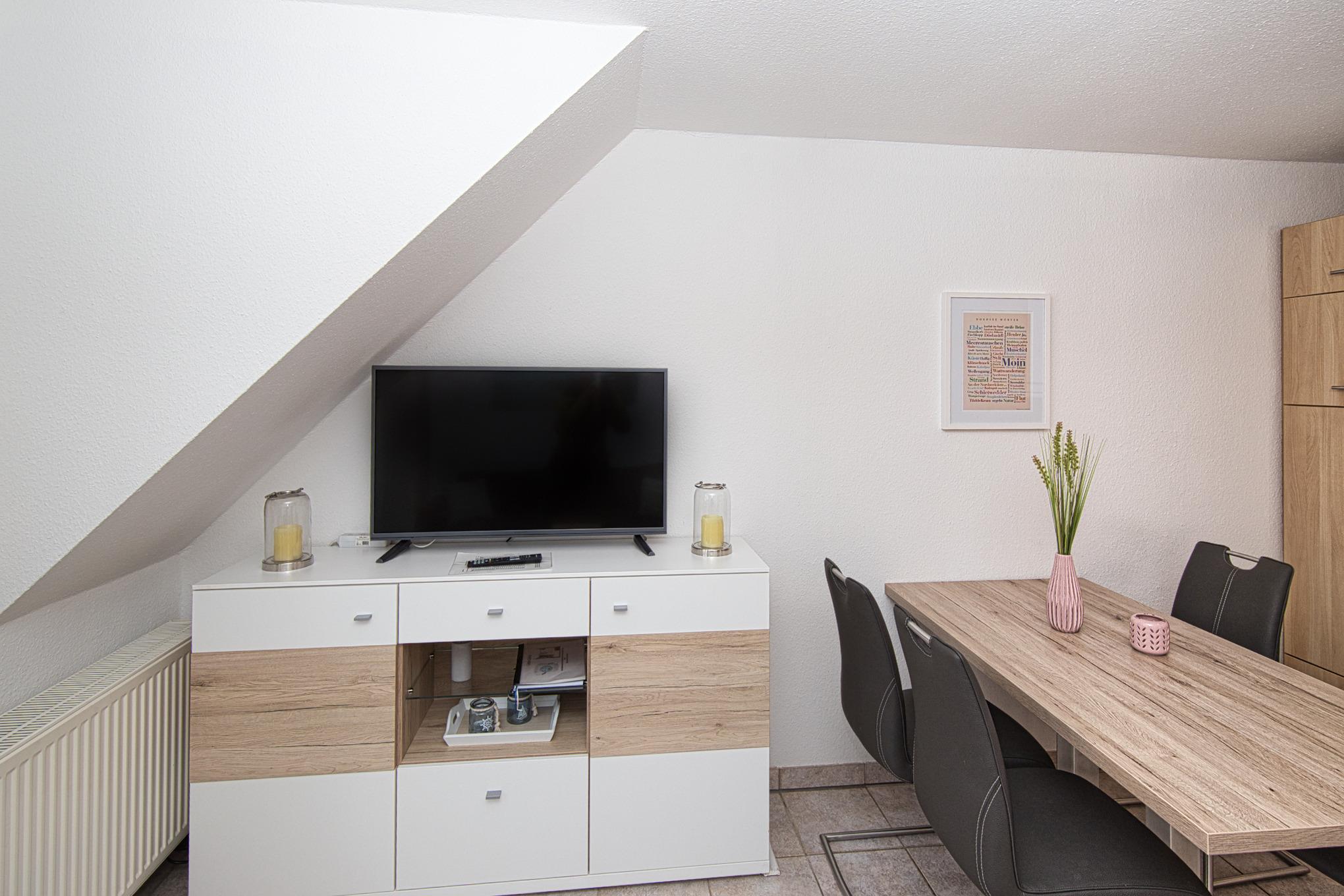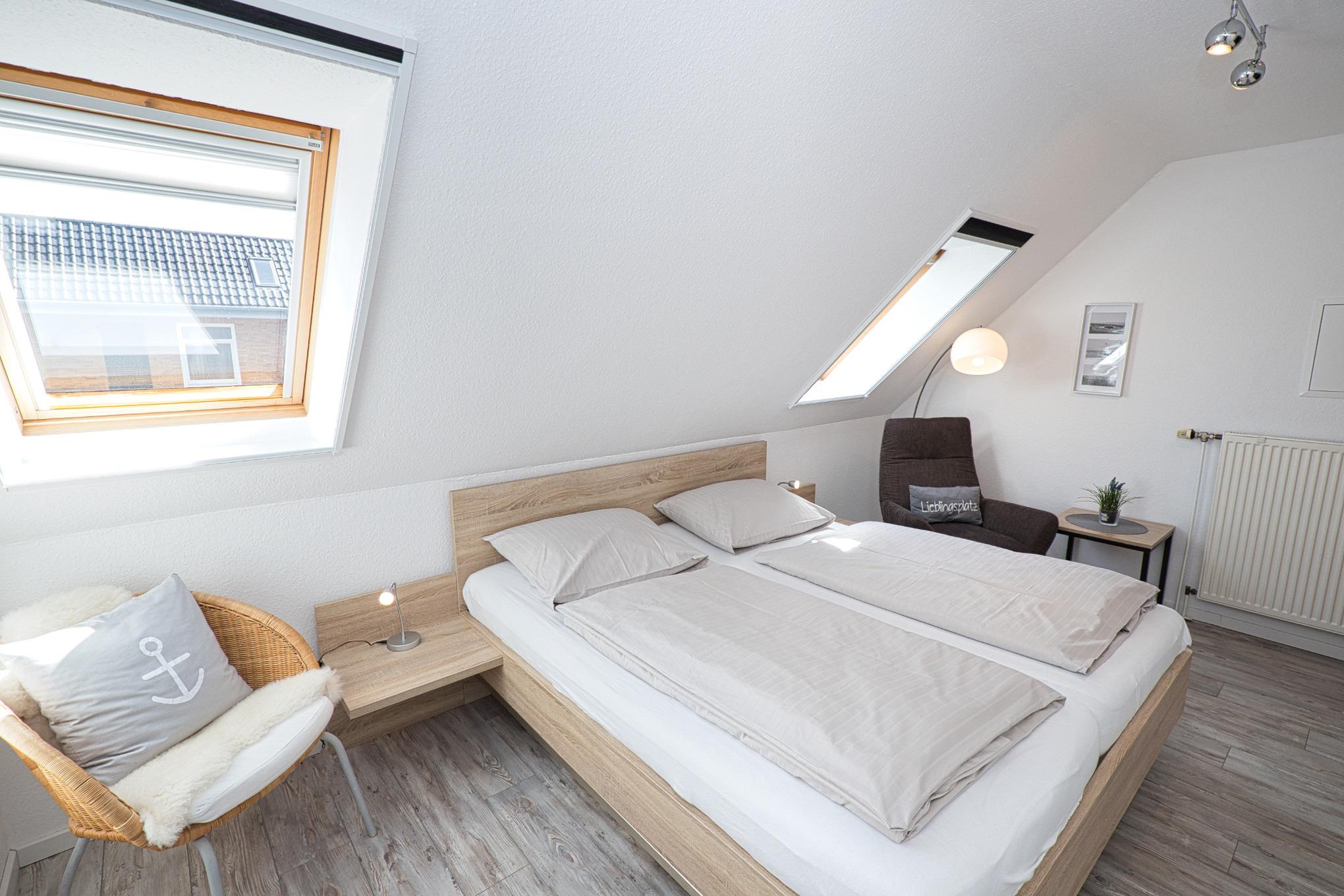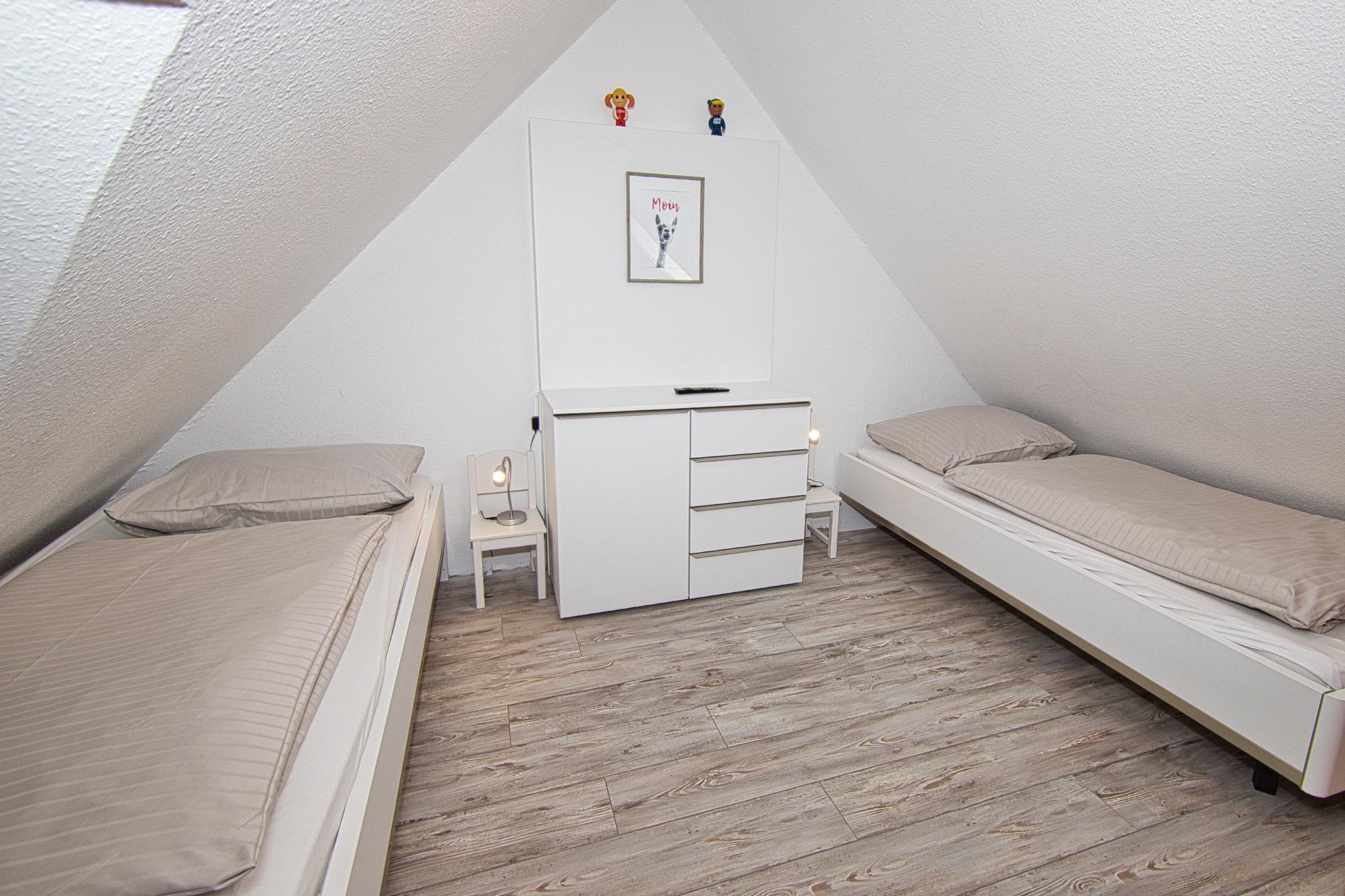 Die Ferienwohnung präsentiert sich in zeitgemäßem Stil und ist perfekt auf die Bedürfnisse von bis zu 4 Personen abgestimmt. Im 1. Obergeschoss erwartet Sie ein separates Schlafzimmer mit einem gemütlichen Doppelbett. Im ausgebauten Dachgeschoss finden Sie einen weiteren behaglichen Schlafbereich mit 2 Einzelbetten (90cmx200cm), ideal für die "jungen" Urlaubsgäste.