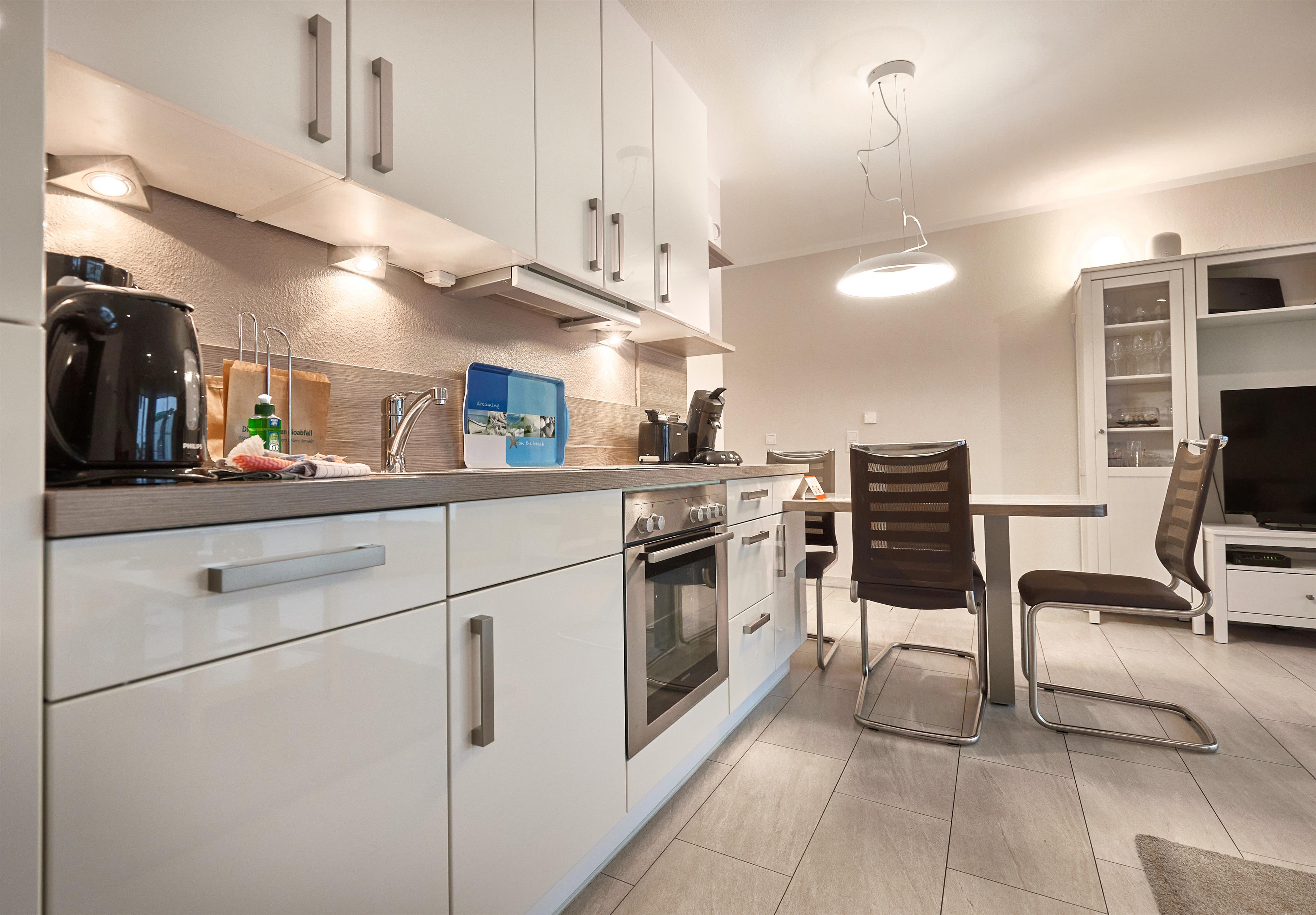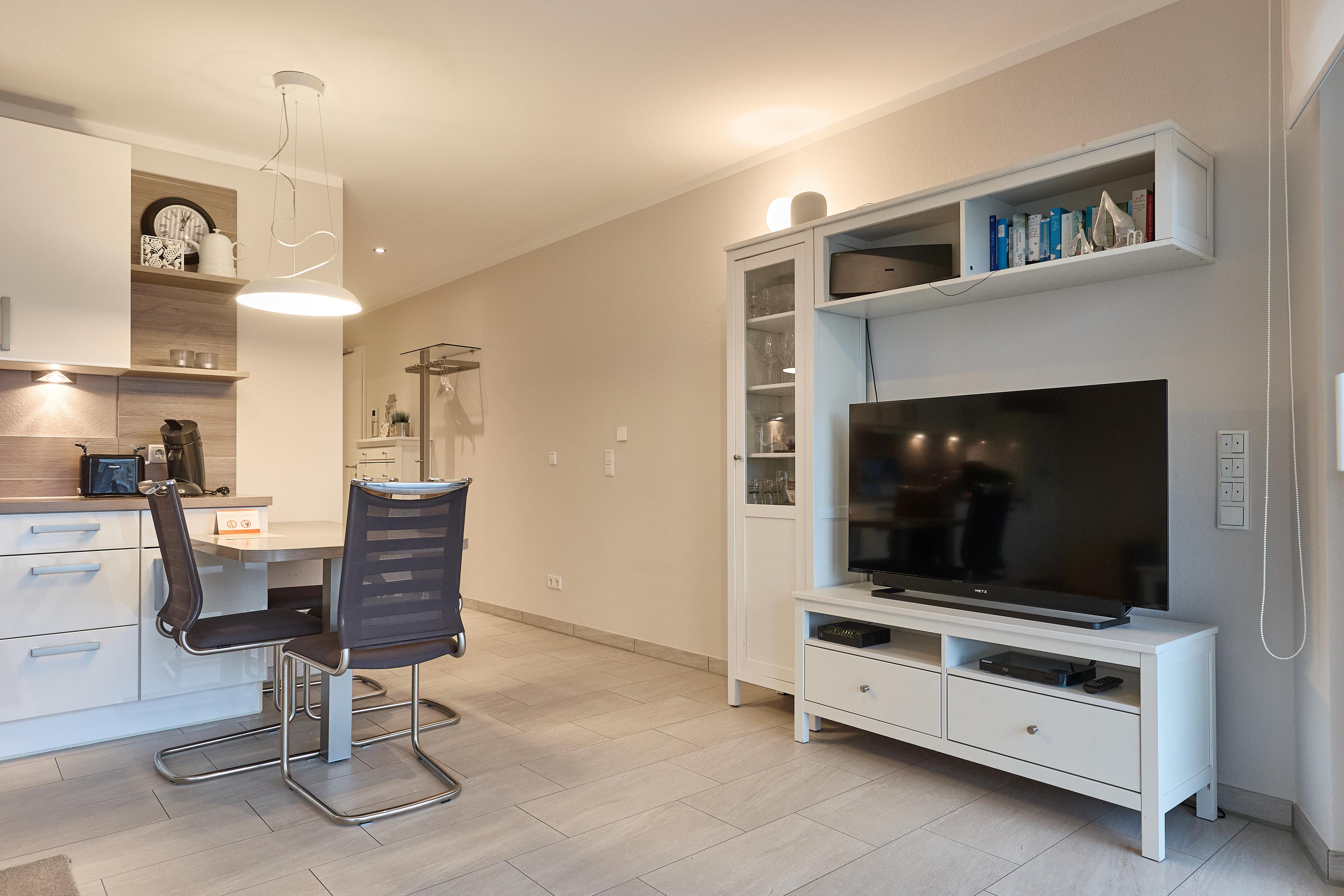Die Ferienwohnung verfügt über einen lichtdurchfluteten Wohn- und Essbereich mit einer erstklassigen Küche, ein stilvolles Duschbad mit WC, ein erstklassiges Schlafzimmer mit Doppelbett (1,80 x 2,00m) und großem Kleiderschrank sowie ein angrenzendes Kinderzimmer mit einem komfortablen Sofa-Tandembett (Einzelbett mit Ausschubbett, 90x200cm, auch als Sofa nutzbar).