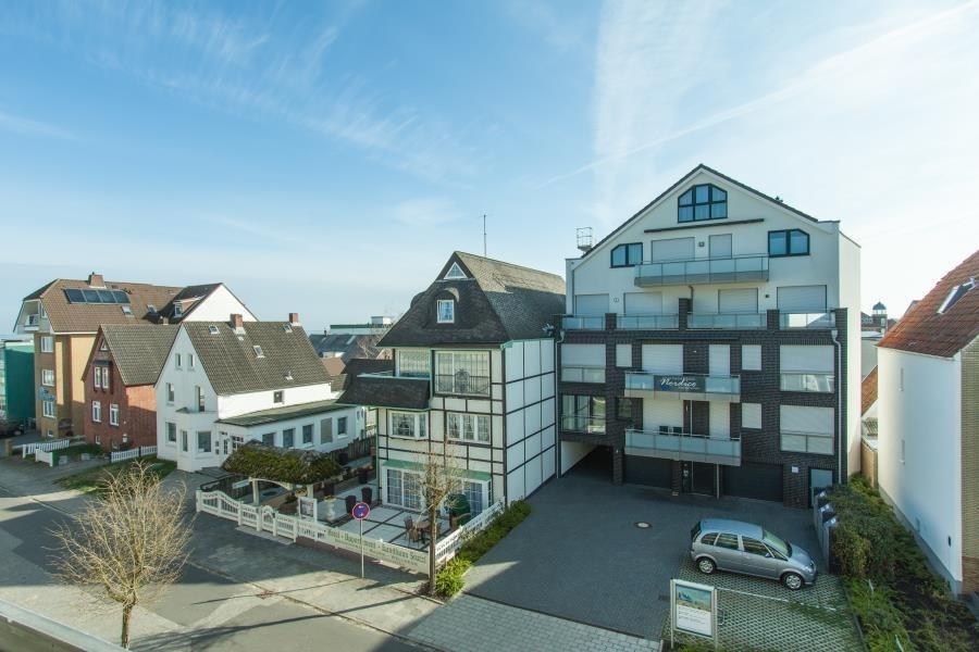 Ein wahres Highlight ist die großzügige Dachterrasse mit hochwertigem Bangkirai-Boden, Strandkorb, Teak-Tisch und gemütlichen Stühlen. Egal bei welchem Wetter, hier können Sie sich entspannen – die Terrasse ist teilweise überdacht. Genießen Sie Ihr Frühstück in der gesunden Nordseeluft!