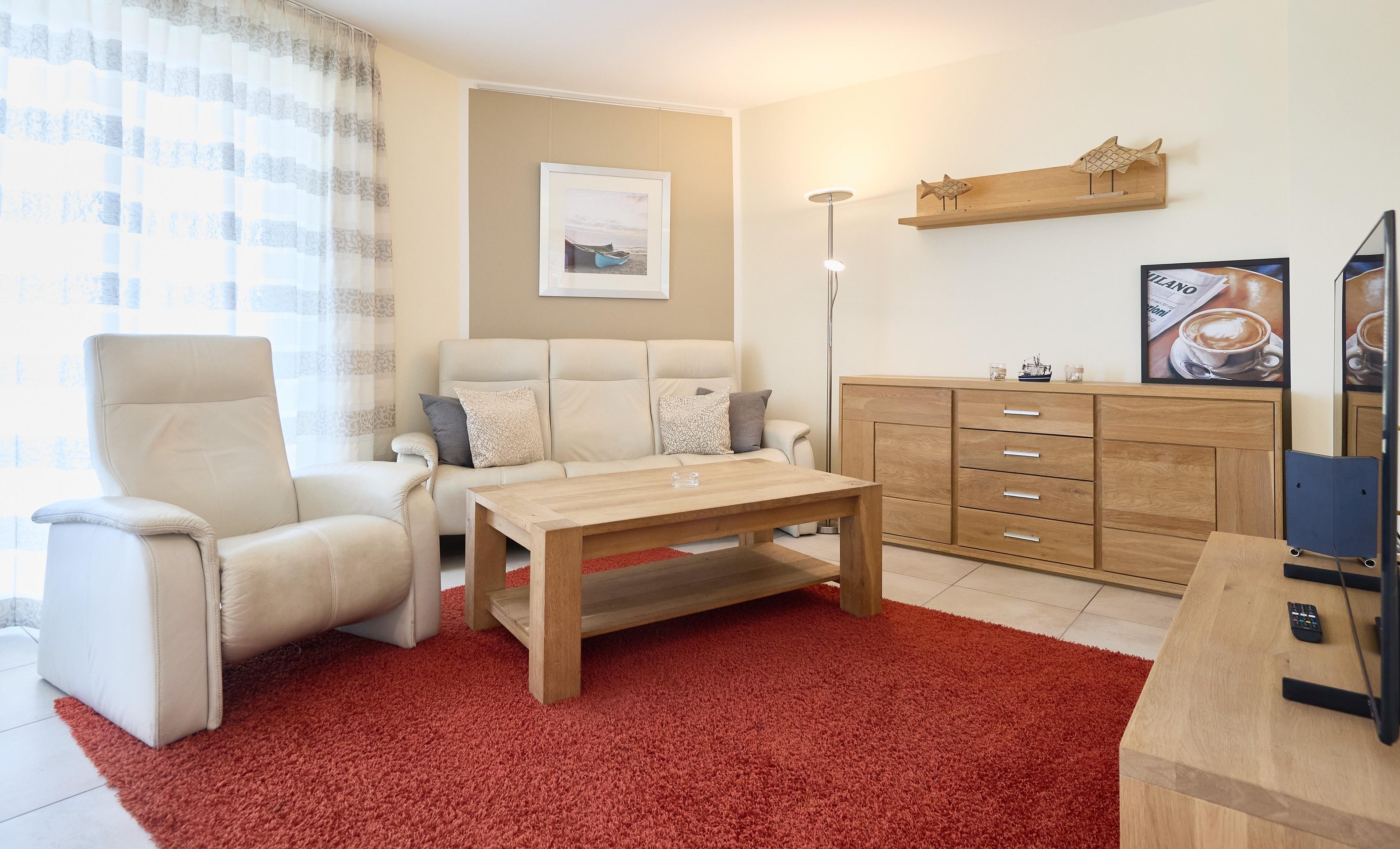 Der überdachte Balkon auf der Rückseite, sowie ein zweiter Balkon, der vom Schlafbereich aus begehbar ist ermöglicht Ihnen, der Sonne zu folgen. Vom Flur mit Garderobe gelangen Sie zu einem Duschbad mit WC, einem Gäste-WC und zwei weiteren voll ausgestatteten Schlafbereichen. Beide Schlafzimmer verfügen über ein komfortables Doppelbett und einen geräumigen Kleiderschrank. Diese Ferienwohnung ist perfekt für einen entspannten Familienurlaub - nah am Strand und dennoch ruhig gelegen.