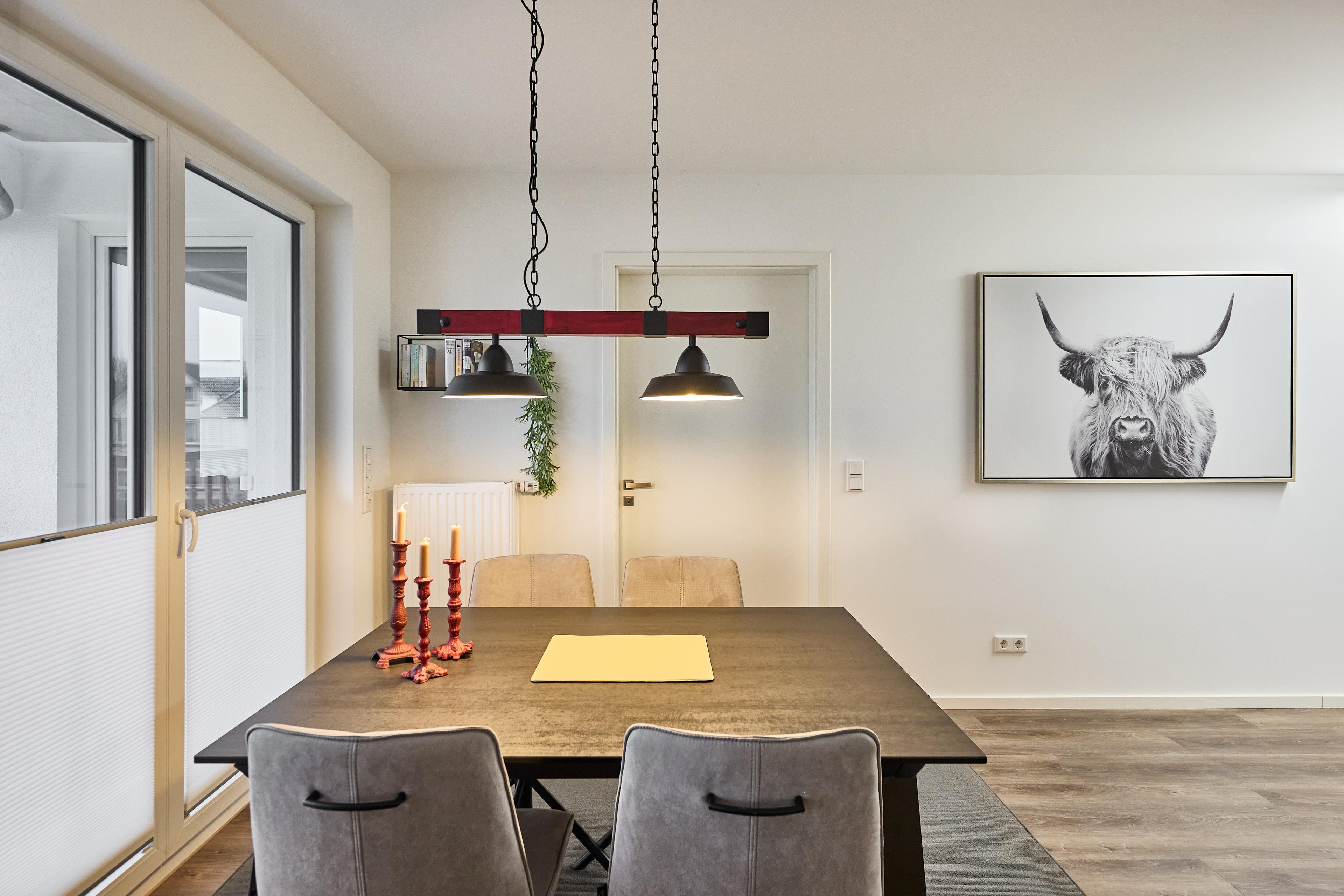 Der zentrale Wohn- und Essbereich ist perfekt für gemeinschaftliche Stunden. Hier finden Sie einen TV, DAB+ Radio und kostenfreies WLAN, damit Sie sich rundum wohlfühlen. Die komfortable Einbauküche ist voll ausgestattet und lässt keine Wünsche offen – ideal für die Zubereitung von Mahlzeiten, die Sie im Essbereich genießen können.