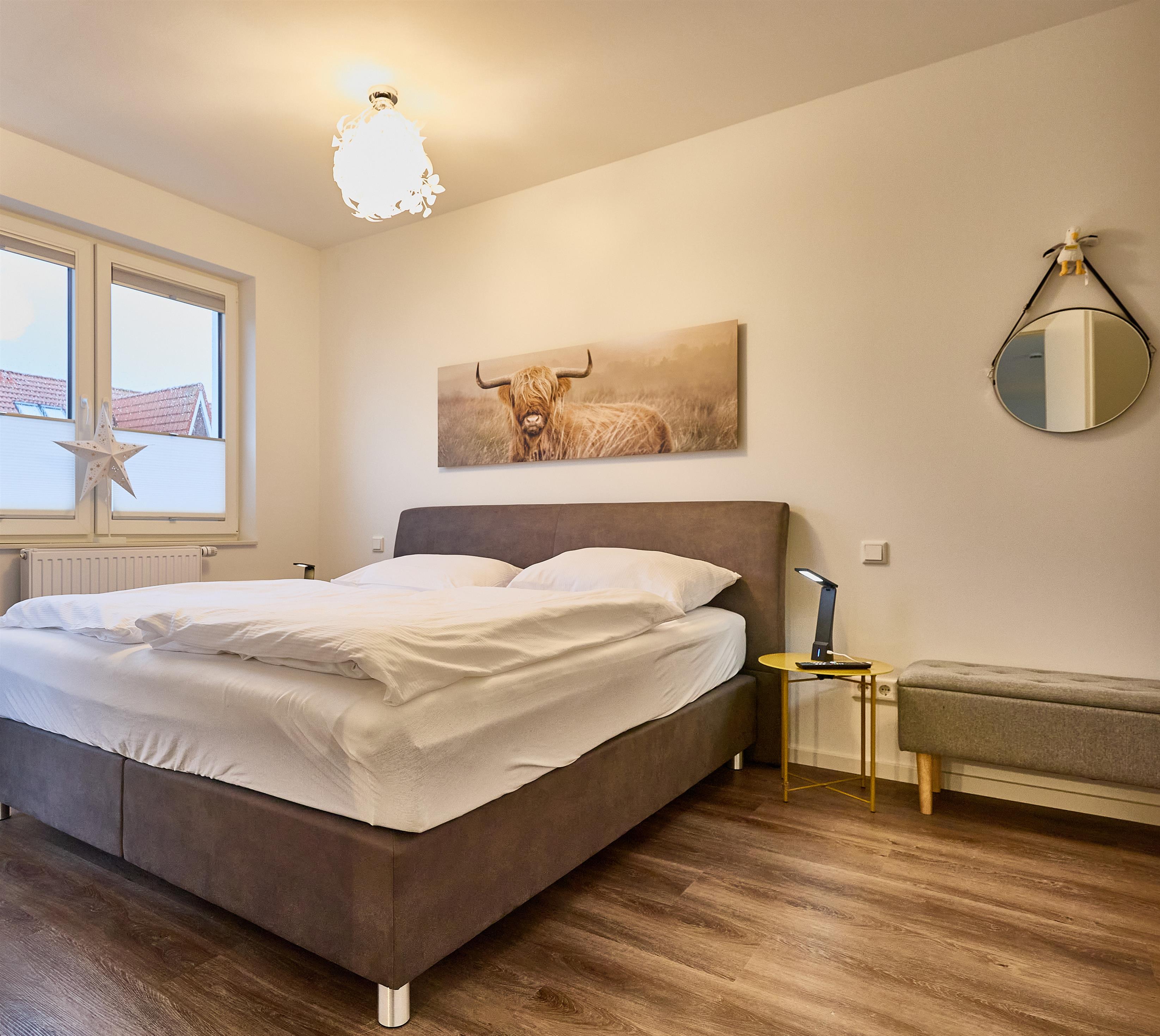 Die großzügige Wohnung bietet auf ca. 82 m² Platz für bis zu 4 Personen und umfasst zwei gemütliche Schlafzimmer. Das erste Schlafzimmer ist mit einem Doppelbett und einem begehbaren Kleiderschrank ausgestattet, während das zweite Schlafzimmer ebenfalls ein komfortables Doppelbett bietet. Beide Schlafzimmer haben direkten Zugang zum West-Balkon, von dem aus Sie den Abend bei einem atemberaubenden Blick ausklingen lassen können.