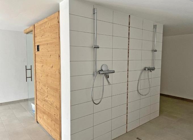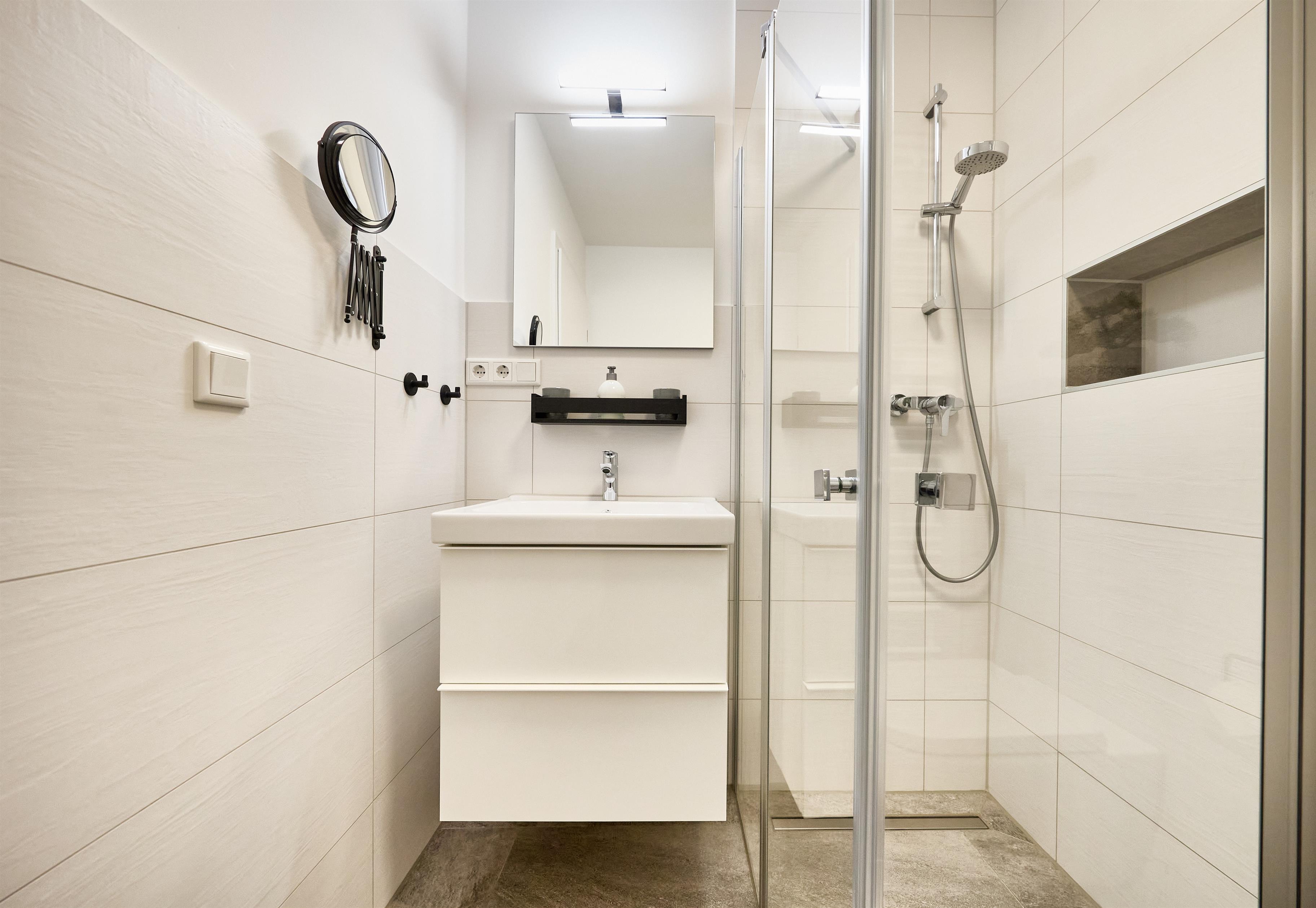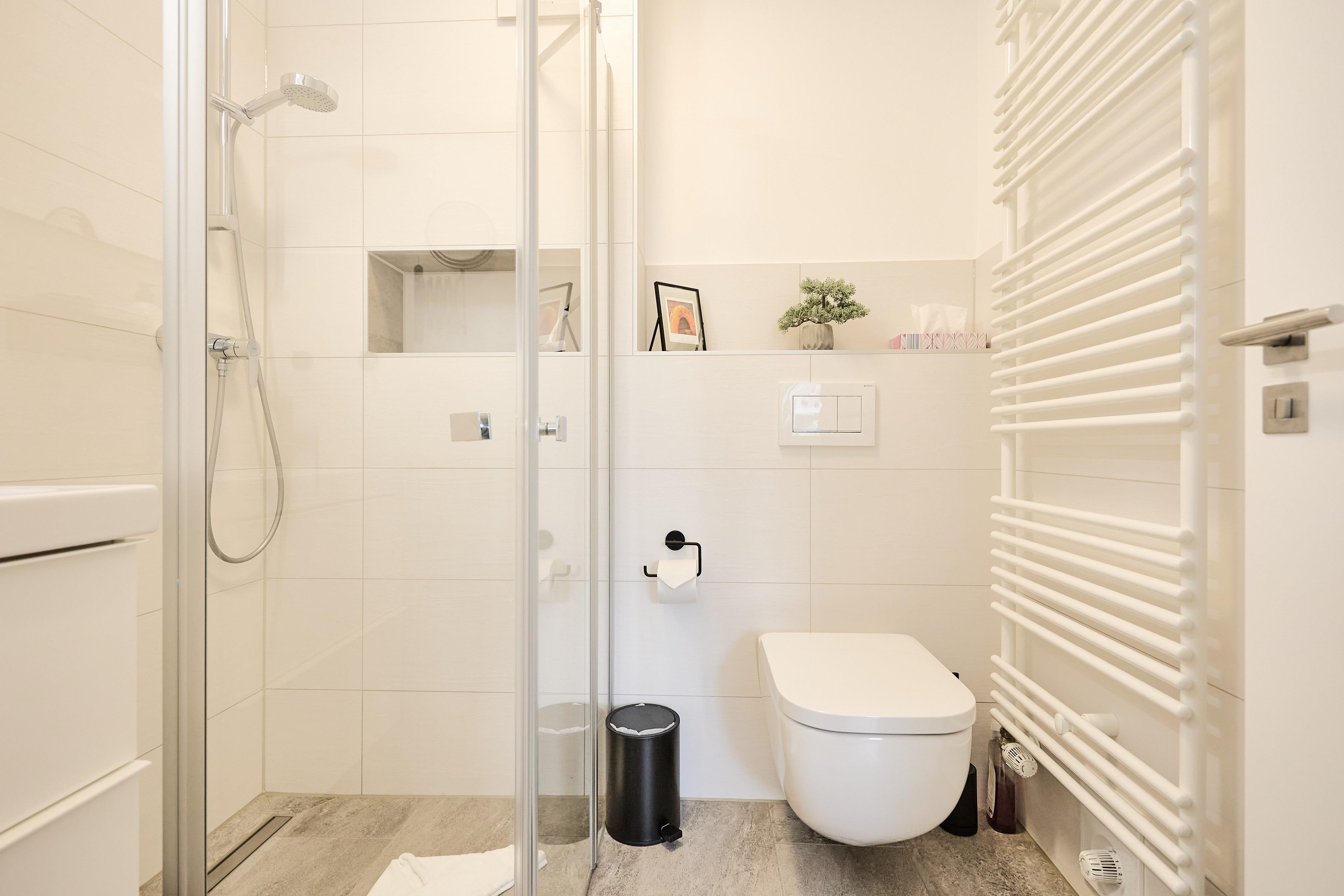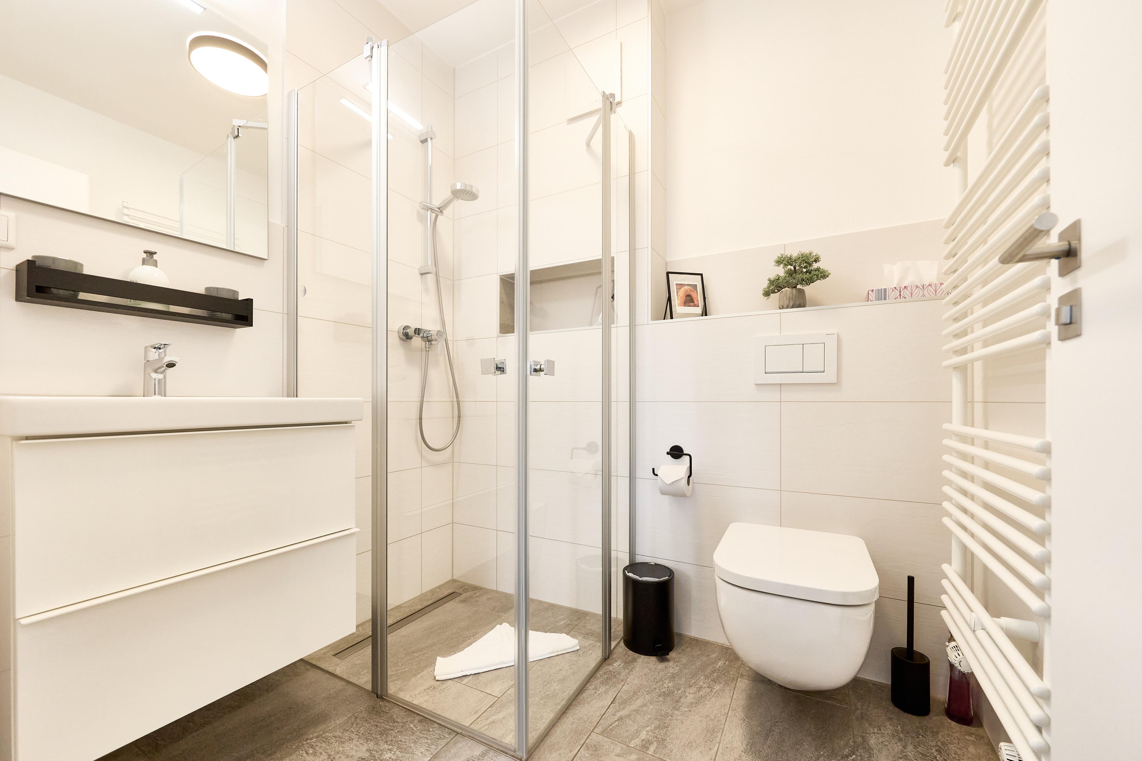 Duschbad: Modernes Bad mit ebenerdiger Dusche, WC, Handtuchheizkörper