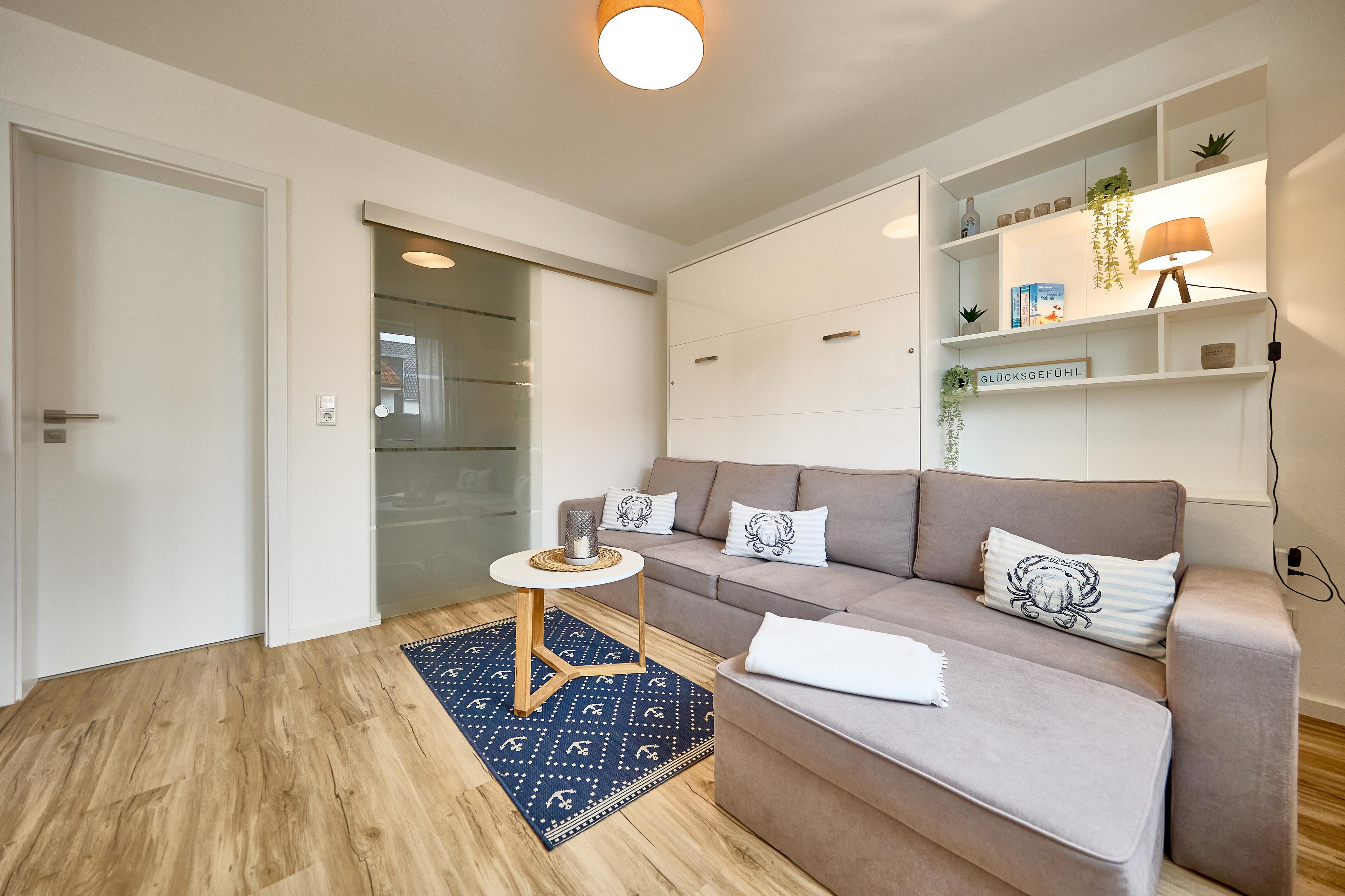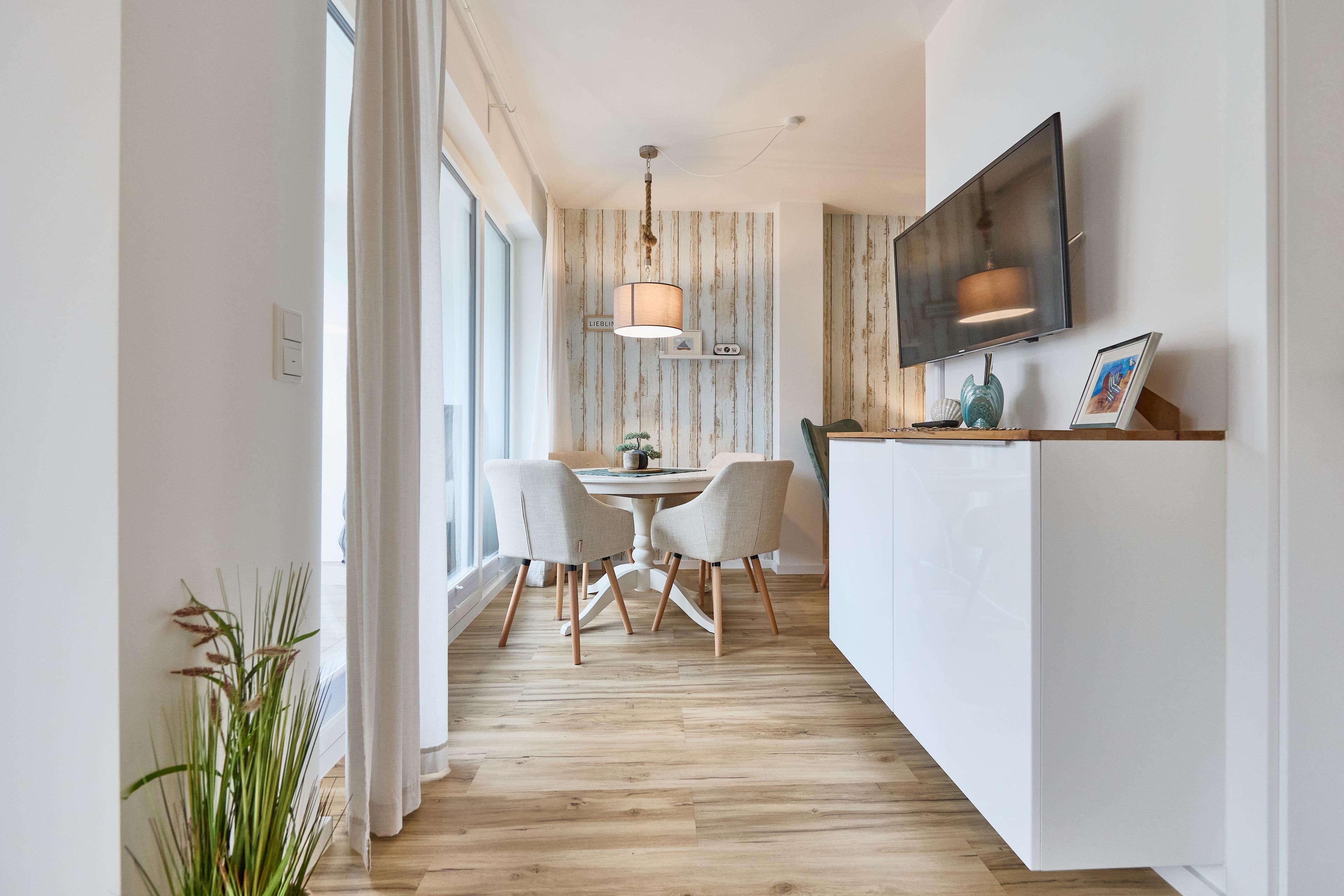 Die Ferienwohnung bietet mit ca. 38 m² eine durchdachte Aufteilung und hochwertig ausgestattete Räume. Der offene Wohnbereich mit Sofa, TV und DAB+ Radio lädt zum Entspannen ein. Die gut ausgestattete Küche mit Essbereich bietet alles, was Sie für eine angenehme Selbstversorgung benötigen.