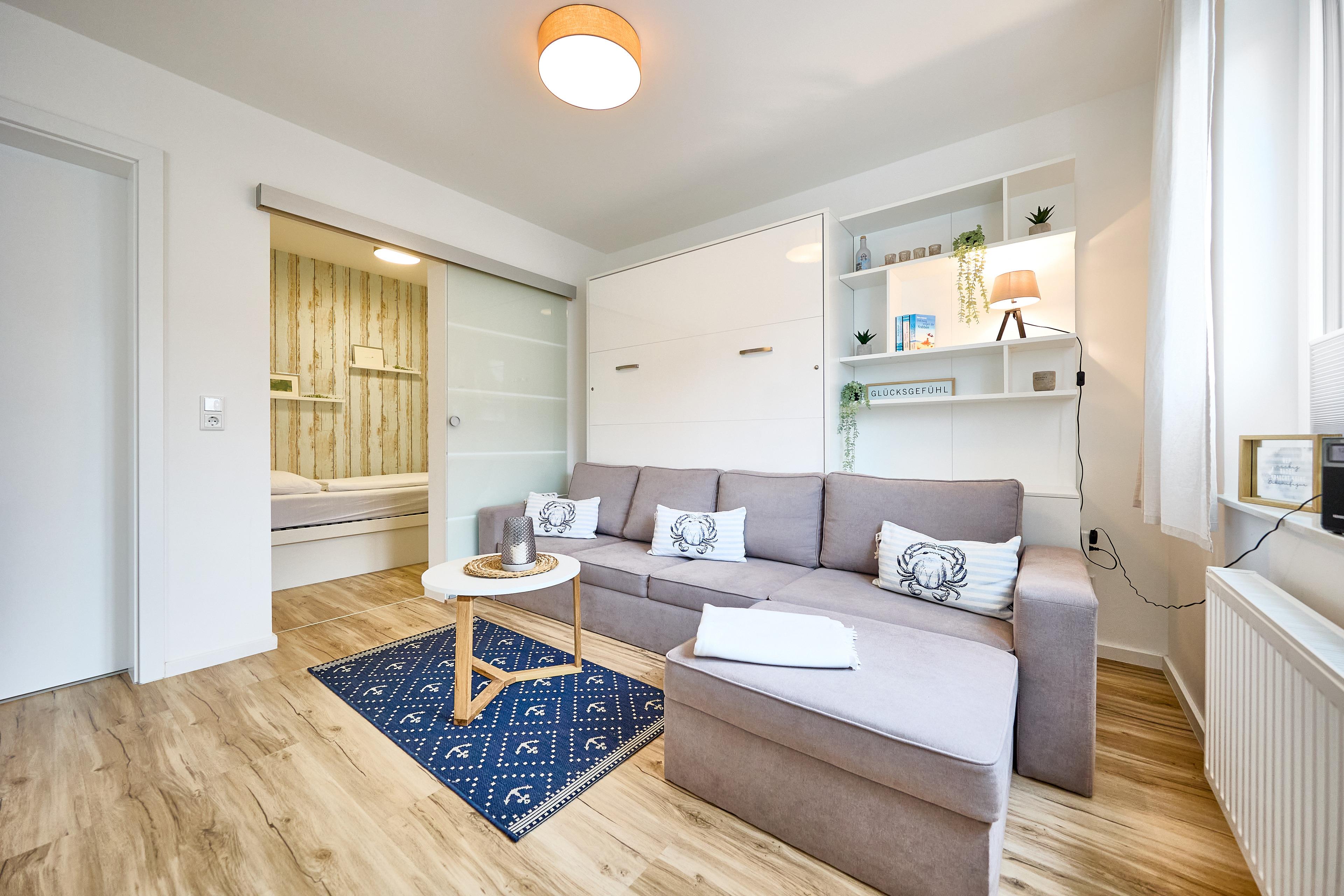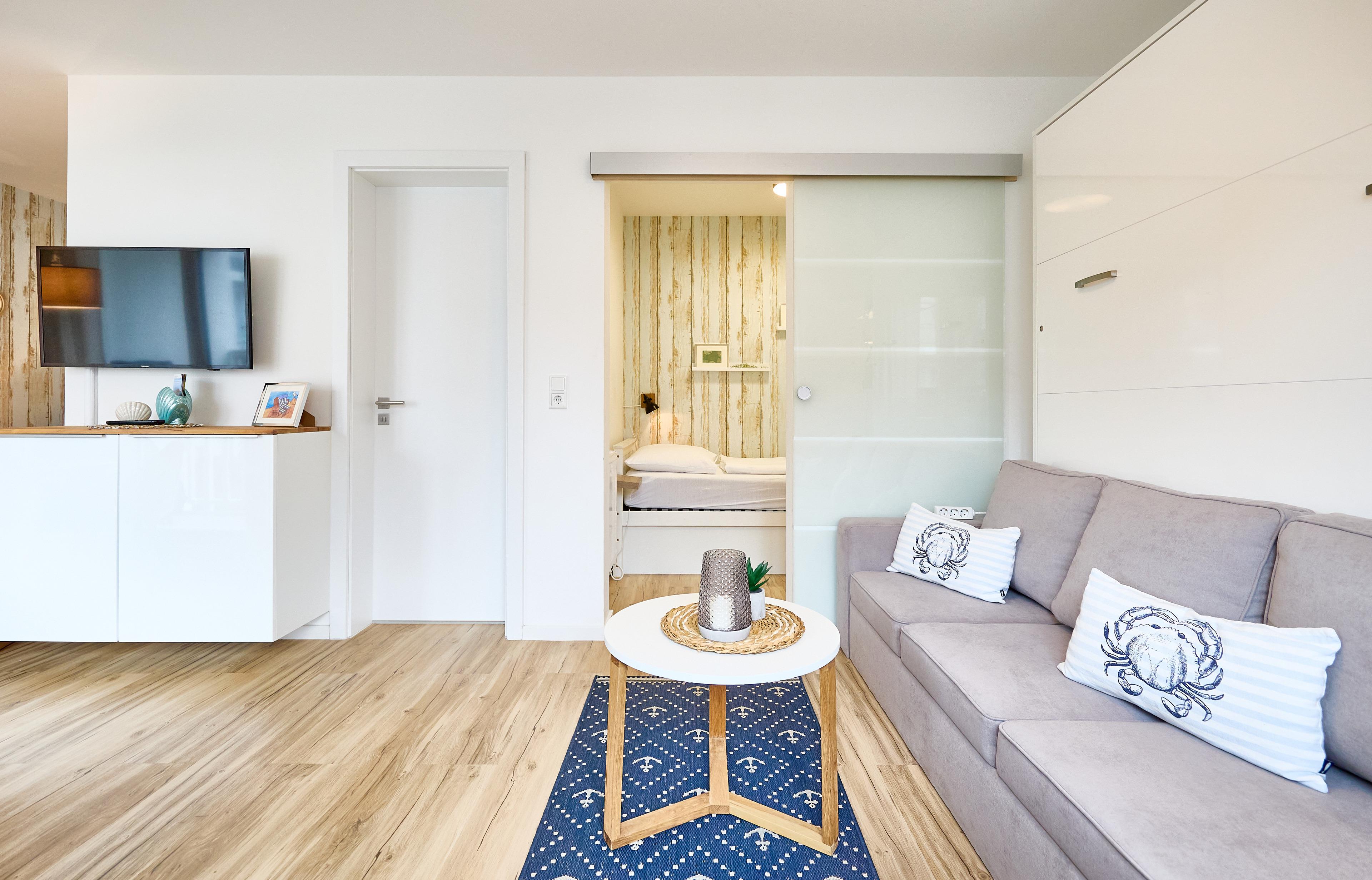 Wohnbereich: Schrankbett (160x200cm), TV, DAB+ Radio, kostenfreies WLAN