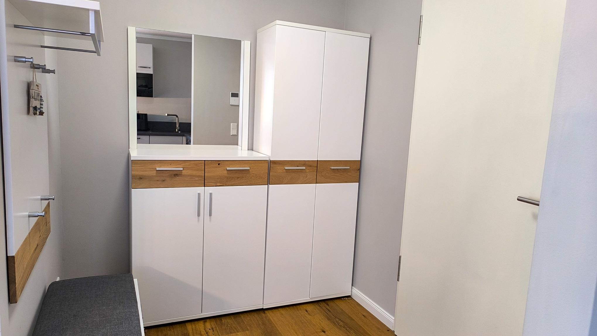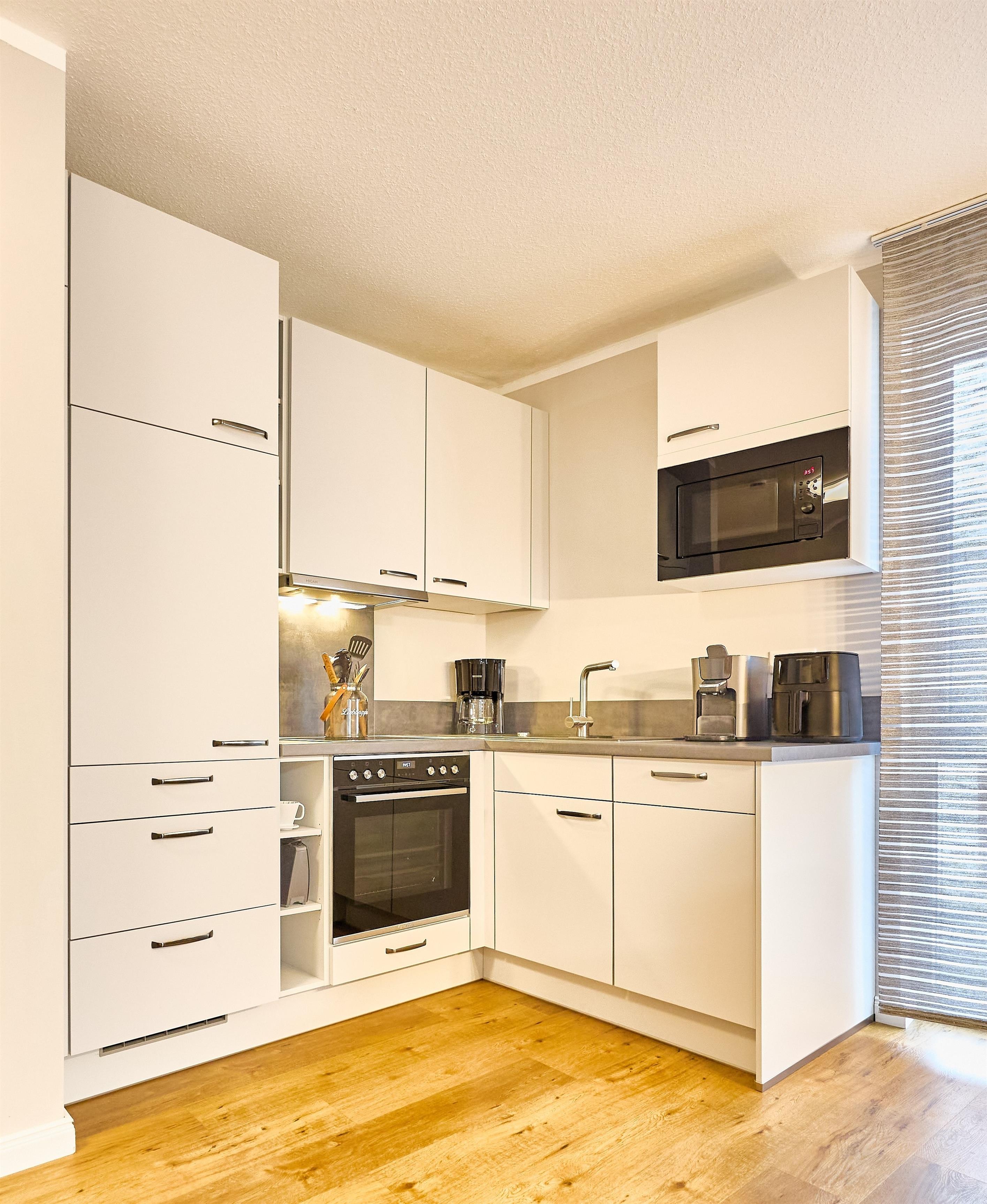 Komfortabel ausgestattete Küchenzeile mit Geschirrspüler, Mikrowelle, Ceranfeld und Kühlschrank