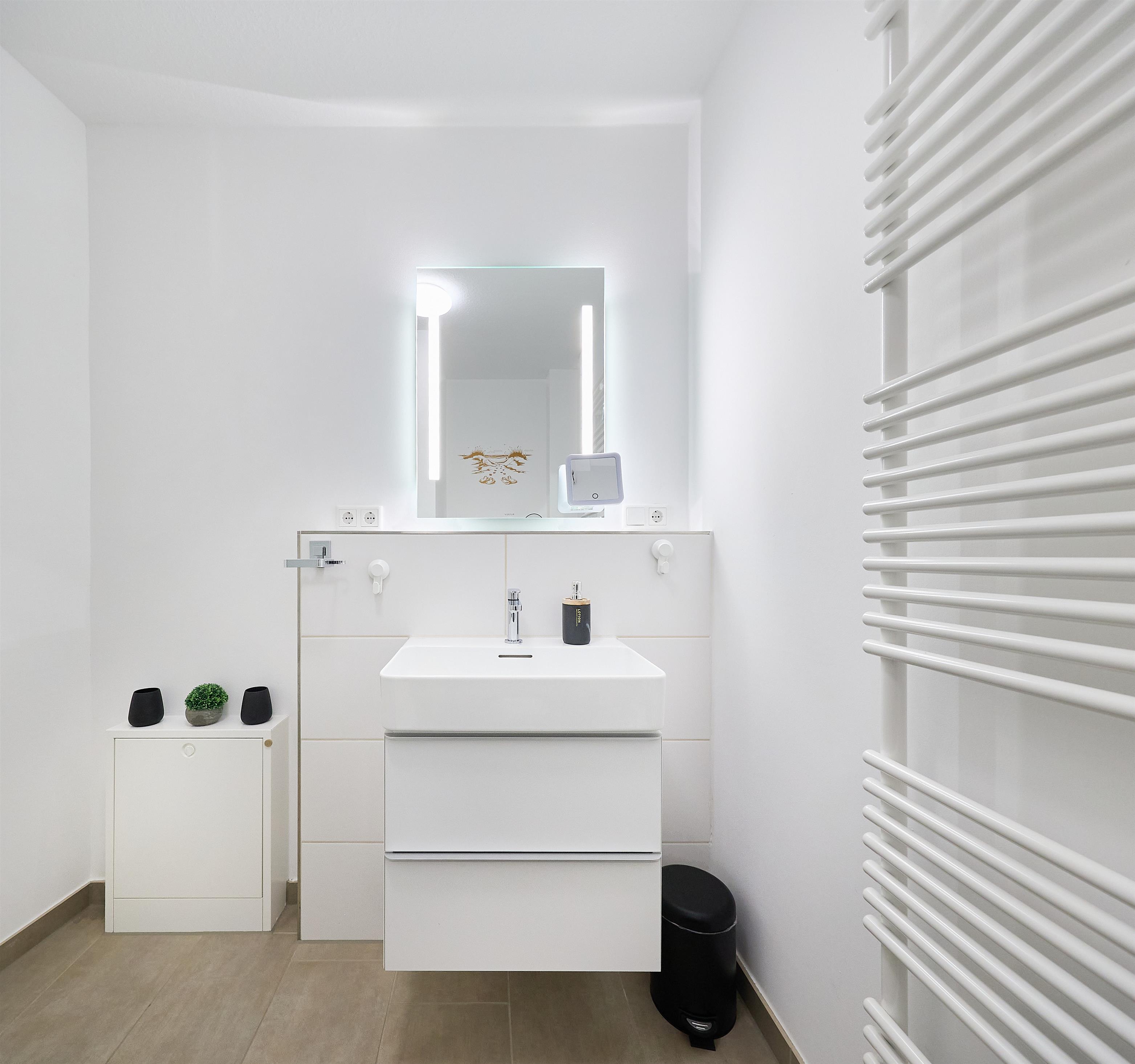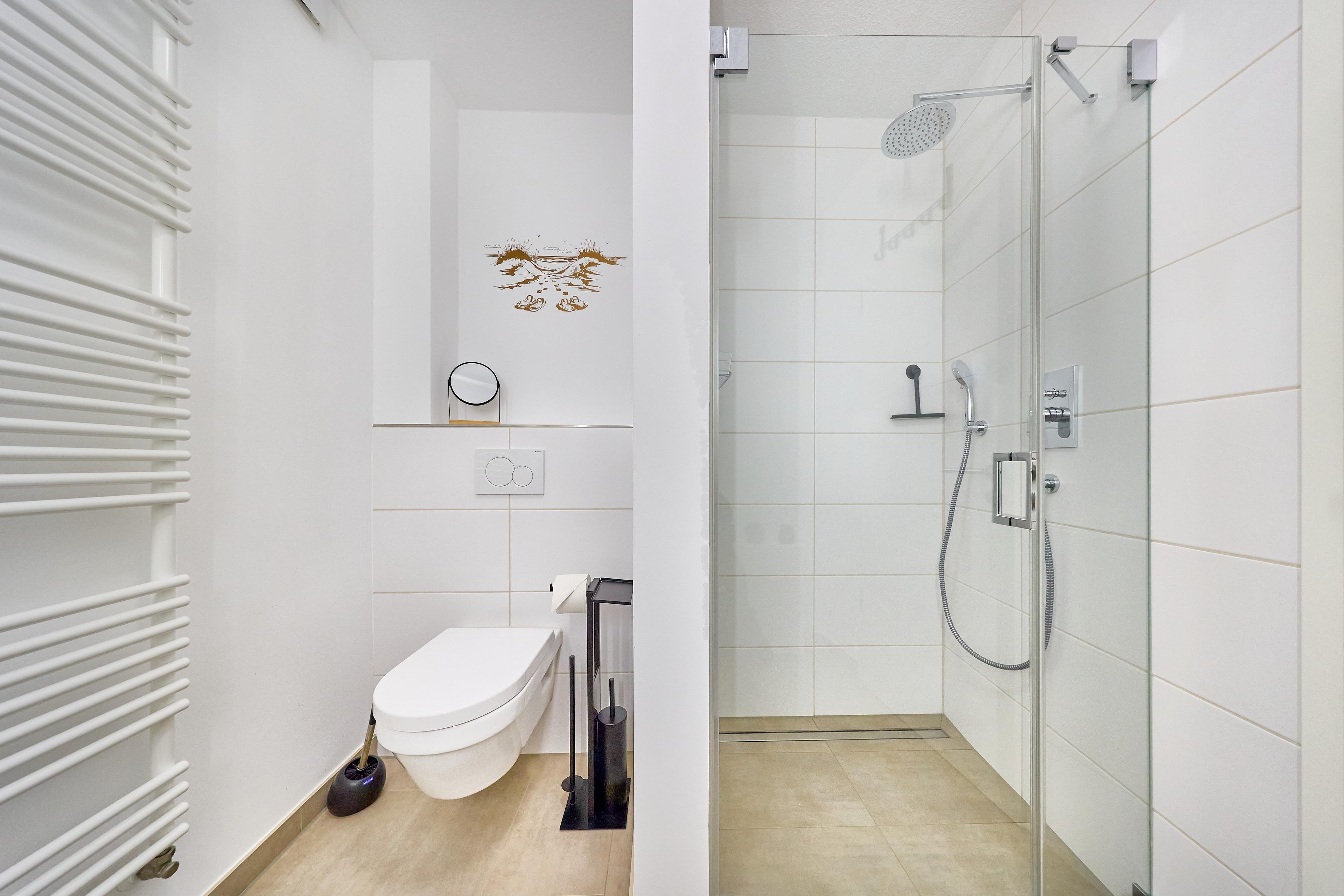 Modernes Duschbad mit WC und Handtuchheizkörper