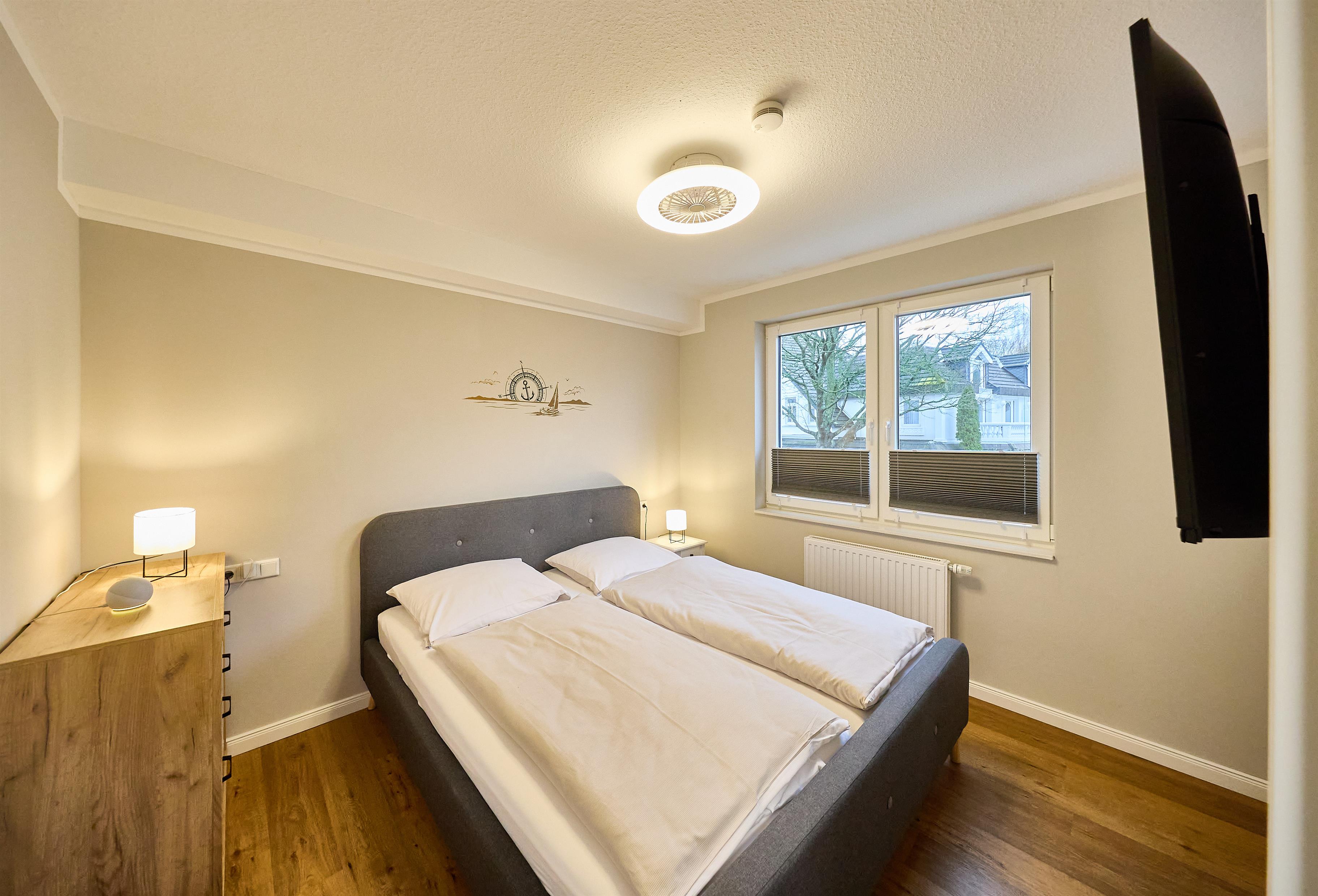 Schlafzimmer mit bequemem Doppelbett und Stauraum