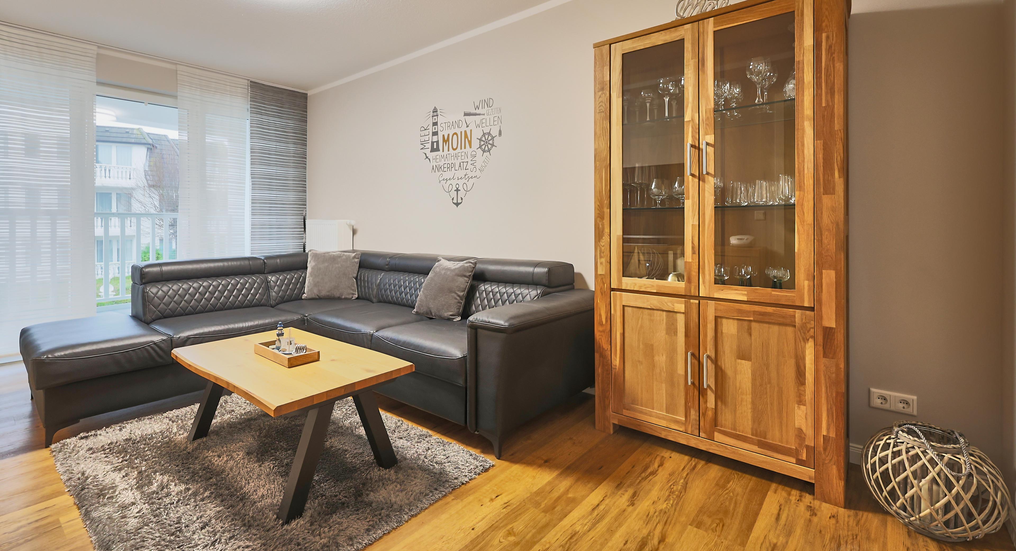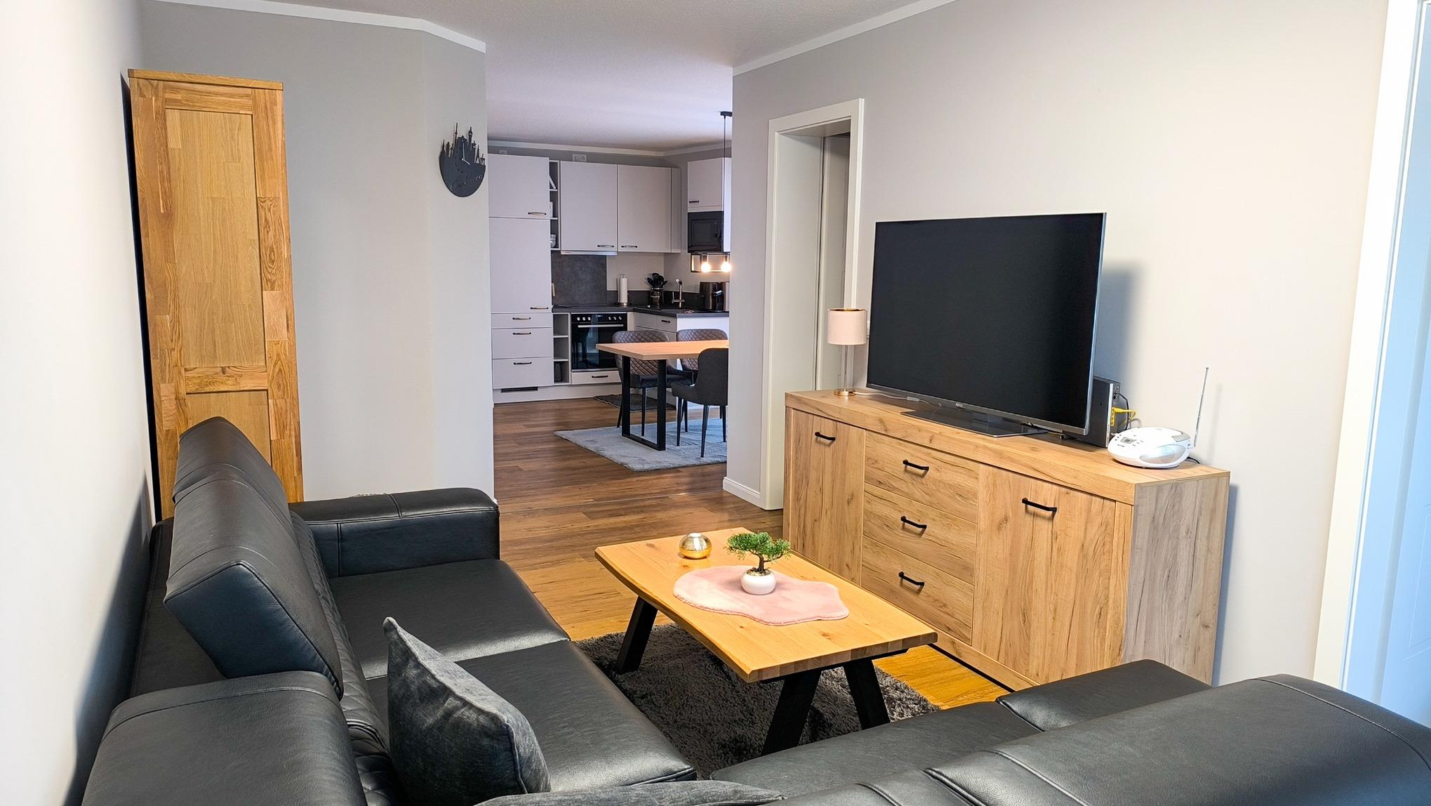 Heller Wohnbereich mit gemütlicher Sitzecke, DAB+ Radio, Flachbild-TV und Essbereich