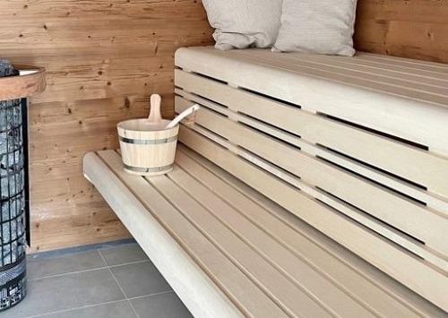 Hauseigene Sauna im Gebäude – nur ein Stockwerk tiefer mit Liegen und Duschen