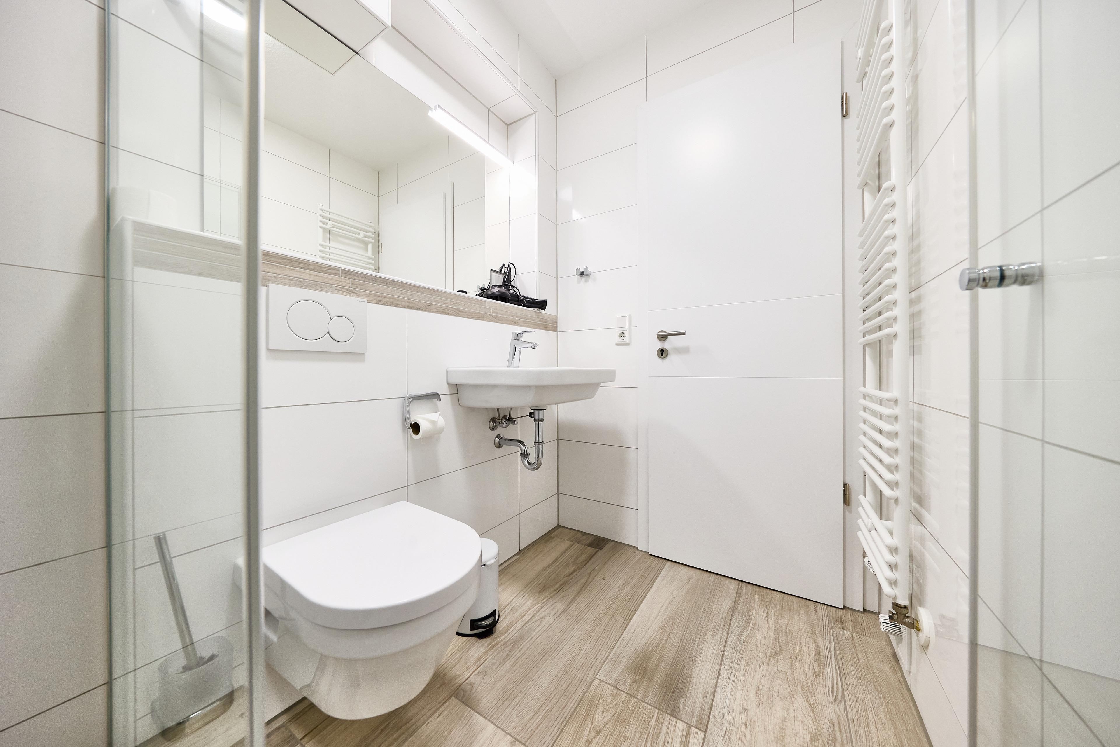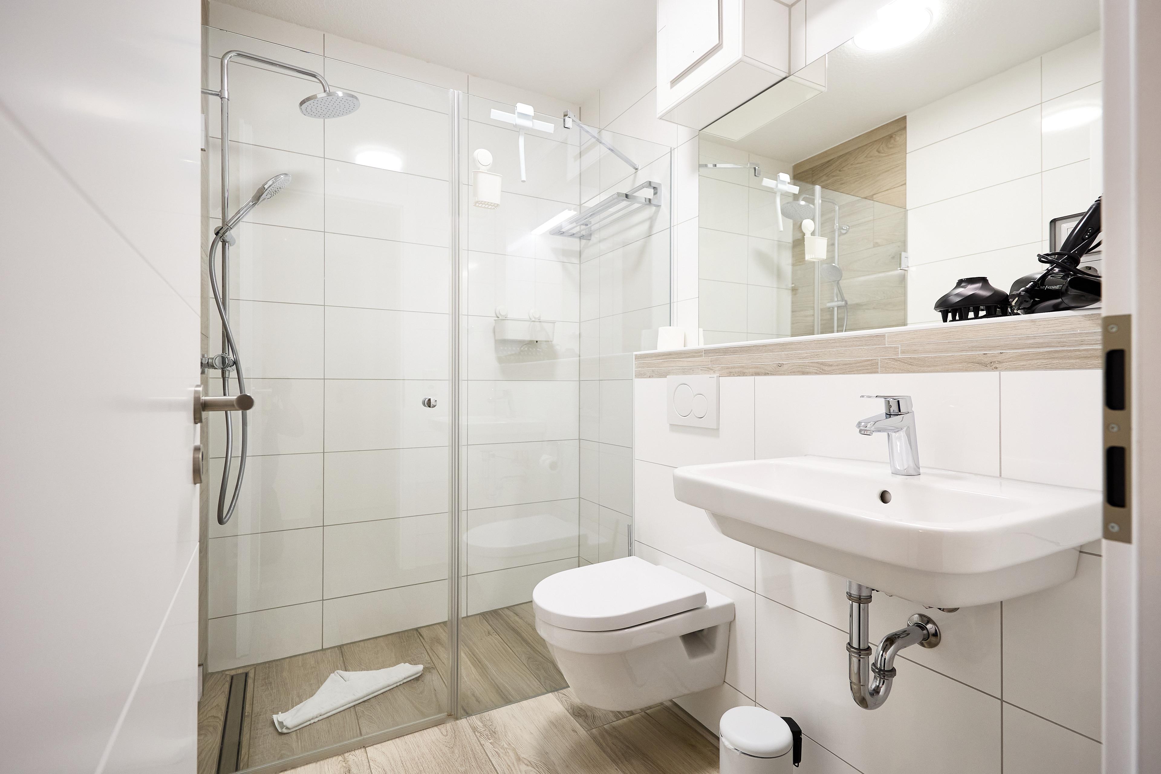 Modernes Duschbad mit WC und Handtuchheizkörper – direkt vom Eingangsbereich aus zugänglich