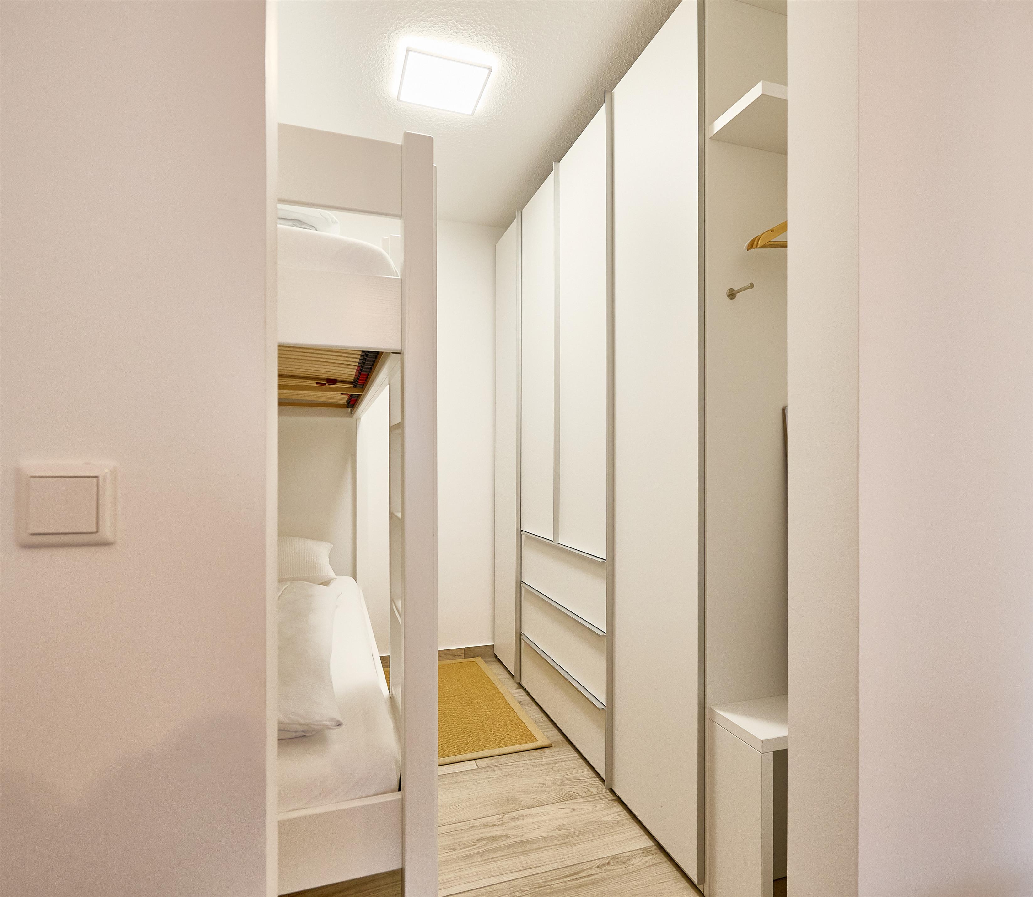 Zweiter, innenliegender Schlafbereich mit hochwertigem Etagenbett, Leselampen, Steckdosen mit USB, Ablagen pro Bett und großem Kleiderschrank – abtrennbar durch eine Schiebetür mit Glaseinsatz