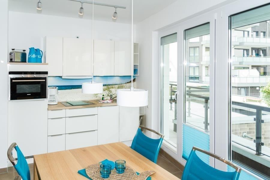 Ein besonderes Highlight der „Möwenkoje“ ist der große, möblierte Hauptbalkon, der einen wunderschönen Blick über die Dächer von Duhnen bietet. Bei klarer Sicht genießen Sie sogar einen Teilblick auf die Nordsee. Die Wohnung verfügt über große Fenster, die den Räumen viel Licht schenken. Im Badezimmer sorgt eine Fußbodenheizung für zusätzlichen Komfort, während der vollkeramische Bodenbelag ein modernes Ambiente schafft. Alle Fenster sind mit abdunkelnden Jalousien und Plissees ausgestattet, und die Schlafzimmerfenster sind zudem abschließbar.