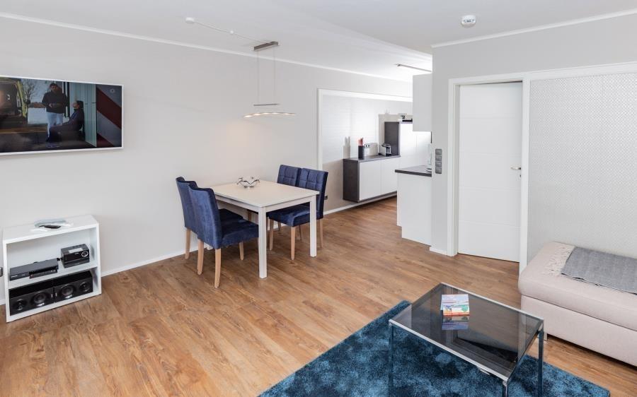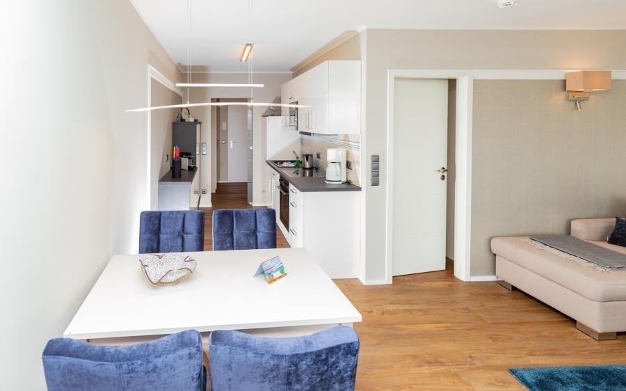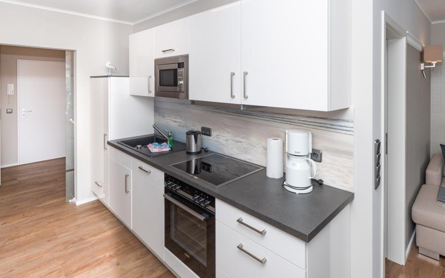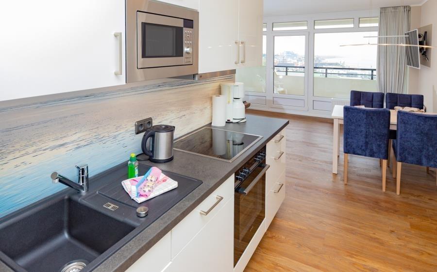 Die moderne Küche ist funktional und stilvoll in den Wohnbereich integriert. Sie bietet alle Voraussetzungen für eine unkomplizierte Selbstverpflegung im Urlaub. Ausgestattet mit Cerankochfeld, Backofen, Mikrowelle, Geschirrspüler sowie einer Nespresso-Kapselmaschine lassen sich sowohl kleine Mahlzeiten als auch komplette Menüs bequem zubereiten. Alternativ genießen Sie die große Auswahl an Restaurants in unmittelbarer Nähe. Frische Brötchen für das Frühstück holen Sie bequem beim Bäcker im Erdgeschoss des Hauses.