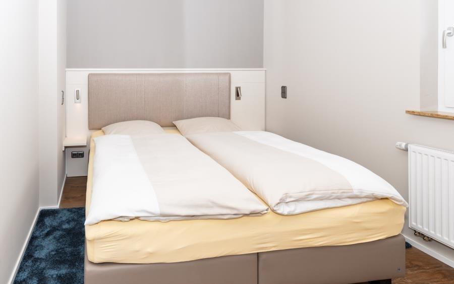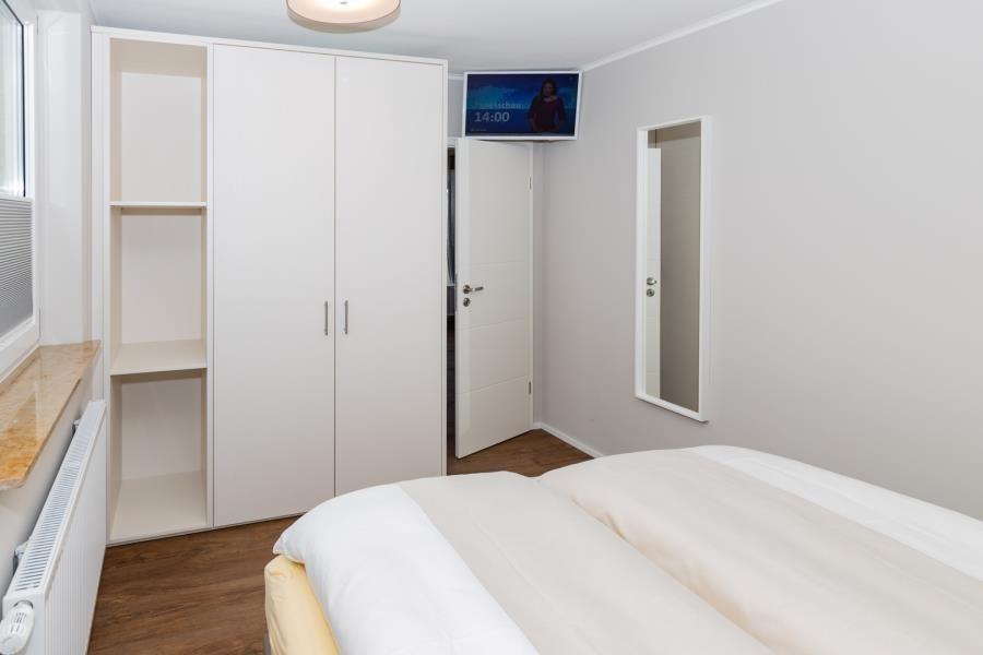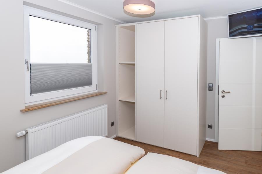 Das Schlafzimmer bietet einen ruhigen Rückzugsort mit angenehmer Atmosphäre. Von hier aus eröffnet sich ein Blick ins grüne Landesinnere mit Wiesen und Waldflächen – ein schöner Kontrast zur Meerseite der Wohnung. Die komfortable Schlafumgebung sorgt für erholsame Nächte, während die Nähe zur Nordsee stets spürbar bleibt. Bei Ihrer Anreise sind die Betten selbstverständlich frisch bezogen, sodass Sie Ihren Urlaub entspannt beginnen können.