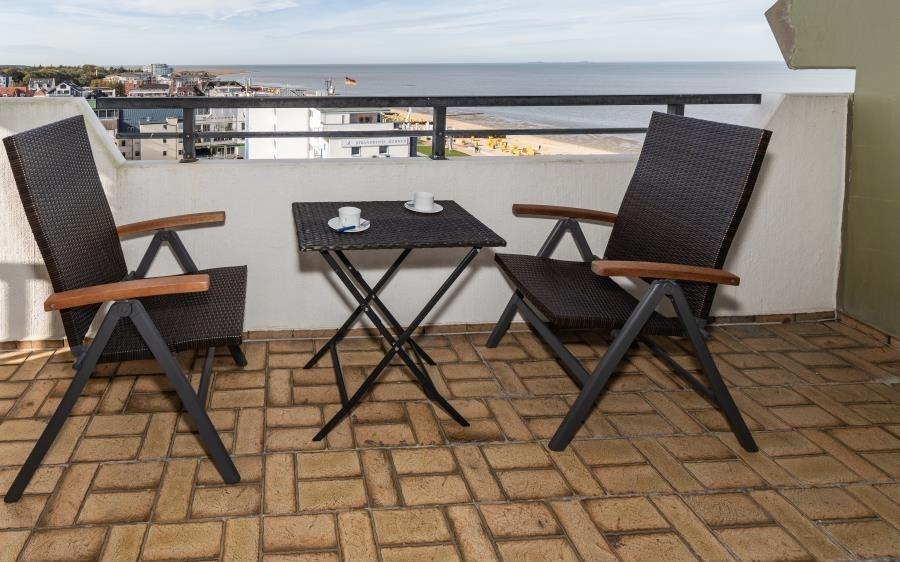 Der Balkon ist zur Nachmittagssonne ausgerichtet und mit passenden Sitzmöbeln ausgestattet. Von hier genießen Sie den weiten Blick Richtung Neuwerk, beobachten den Schiffsverkehr auf der Nordsee und erleben eindrucksvolle Sonnenuntergänge. Ein idealer Ort, um zur Ruhe zu kommen und die besondere Lage des Panoramahauses in vollen Zügen zu genießen.