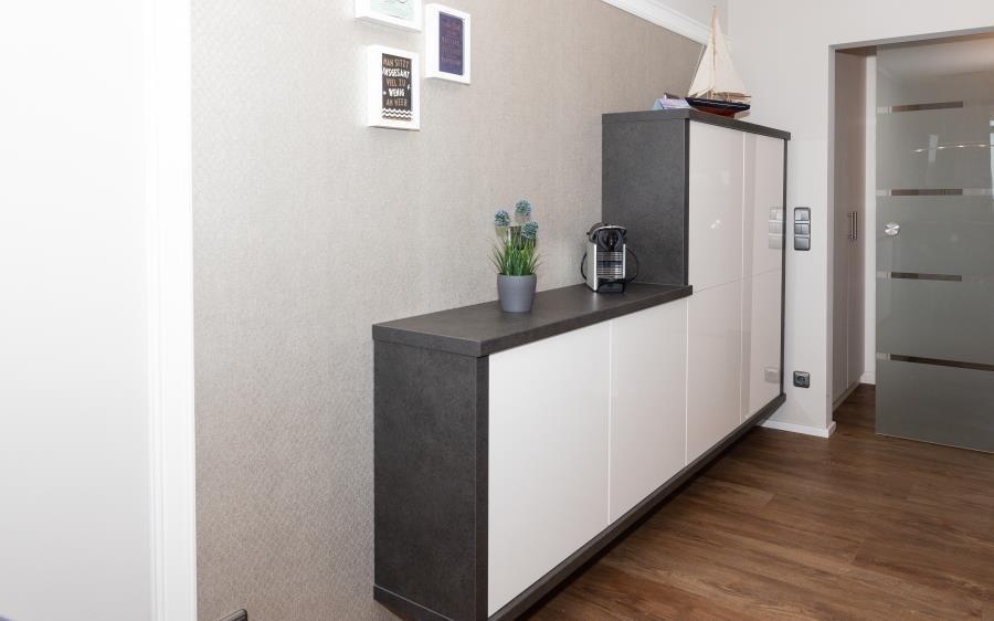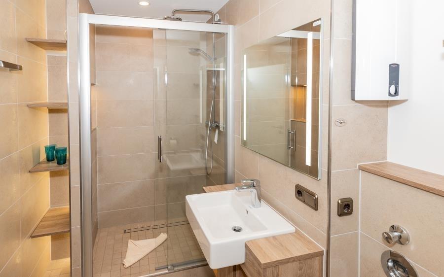 Das moderne Badezimmer ist hochwertig ausgestattet und fügt sich harmonisch in das Gesamtbild der Wohnung ein. Eine großzügige Dusche, stilvolle, individuell beleuchtete Elemente sowie durchdachte Ablageflächen bieten Komfort und Funktionalität zugleich. Hier beginnt und endet der Tag angenehm und entspannt.
