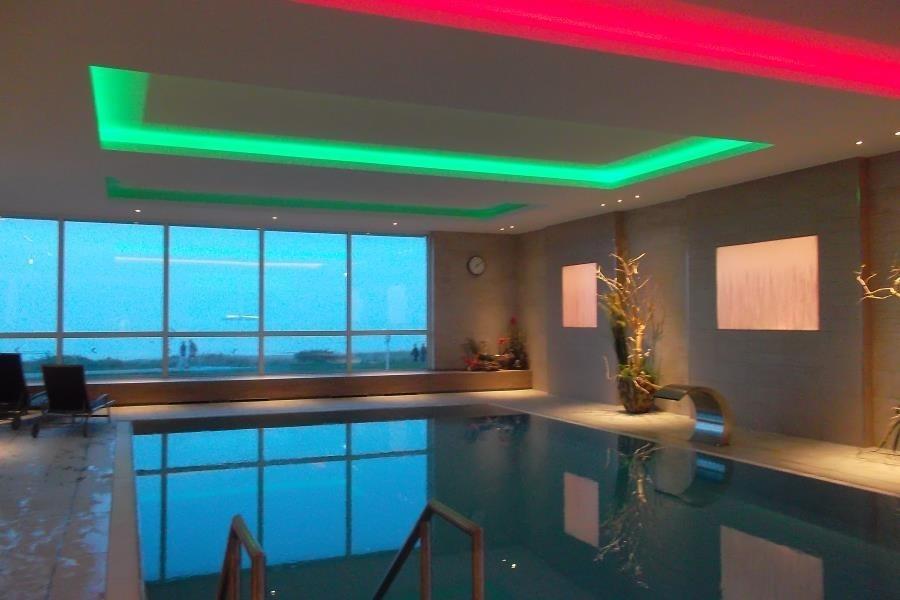 Im 1. Obergeschoss des Panoramahauses steht Ihnen ein großzügiger Wellnessbereich zur Verfügung. Das moderne Hallenbad bietet einen direkten Panoramablick auf die Nordsee und lädt zum entspannten Schwimmen oder zur Nutzung der Gegenstromanlage ein. Ein Wasserfall sorgt für zusätzliche Wohlfühlatmosphäre. Ergänzt wird der Bereich durch eine finnische Sauna sowie Ruheräume, ebenfalls mit Blick auf das Meer. Ein Solarium steht gegen Entgelt zur Verfügung. Die Nutzung von Schwimmbad und Sauna ist – bei Verfügbarkeit – inklusive. Bitte beachten Sie hierzu die Hausordnung sowie die jeweiligen Schließzeiten.