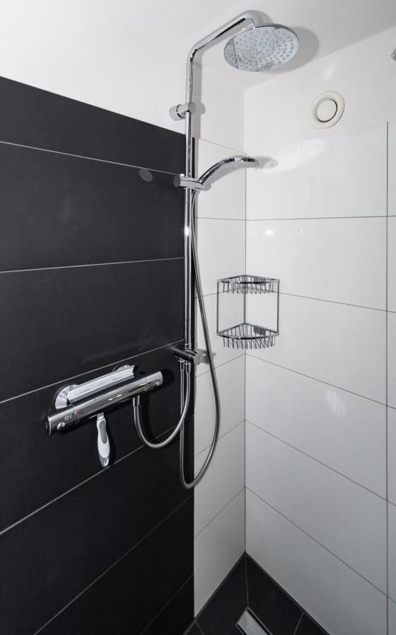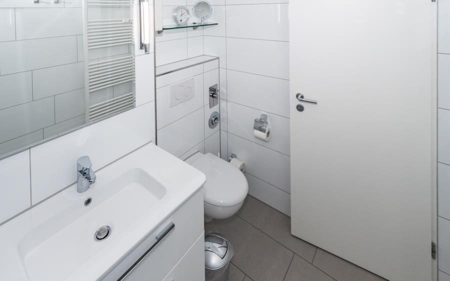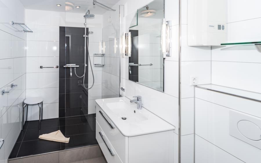 Das moderne Duschbad ist funktional und ästhetisch gestaltet und verfügt über praktische Ablageflächen für Ihre Badutensilien. Alles ist auf Komfort und einfache Nutzung ausgerichtet.