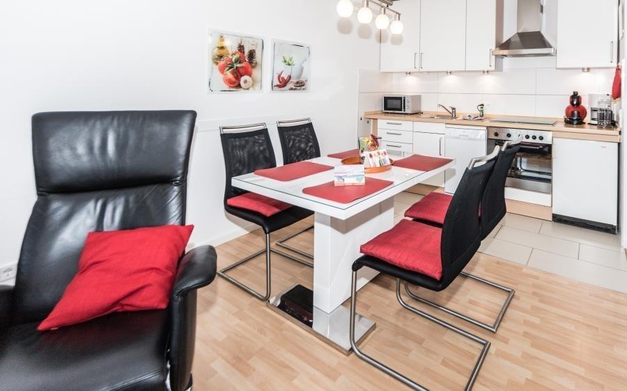 Die komplett eingerichtete Küchenzeile ermöglicht eine unkomplizierte Selbstverpflegung im Urlaub. Hier finden Sie alles, was Sie benötigen – inklusive Geschirrspüler. Wer es besonders bequem mag, holt die Frühstücksbrötchen einfach mit dem Aufzug direkt aus der Bäckerei im Erdgeschoss. Alternativ stehen Ihnen mehrere Restaurants im Haus zur Auswahl.