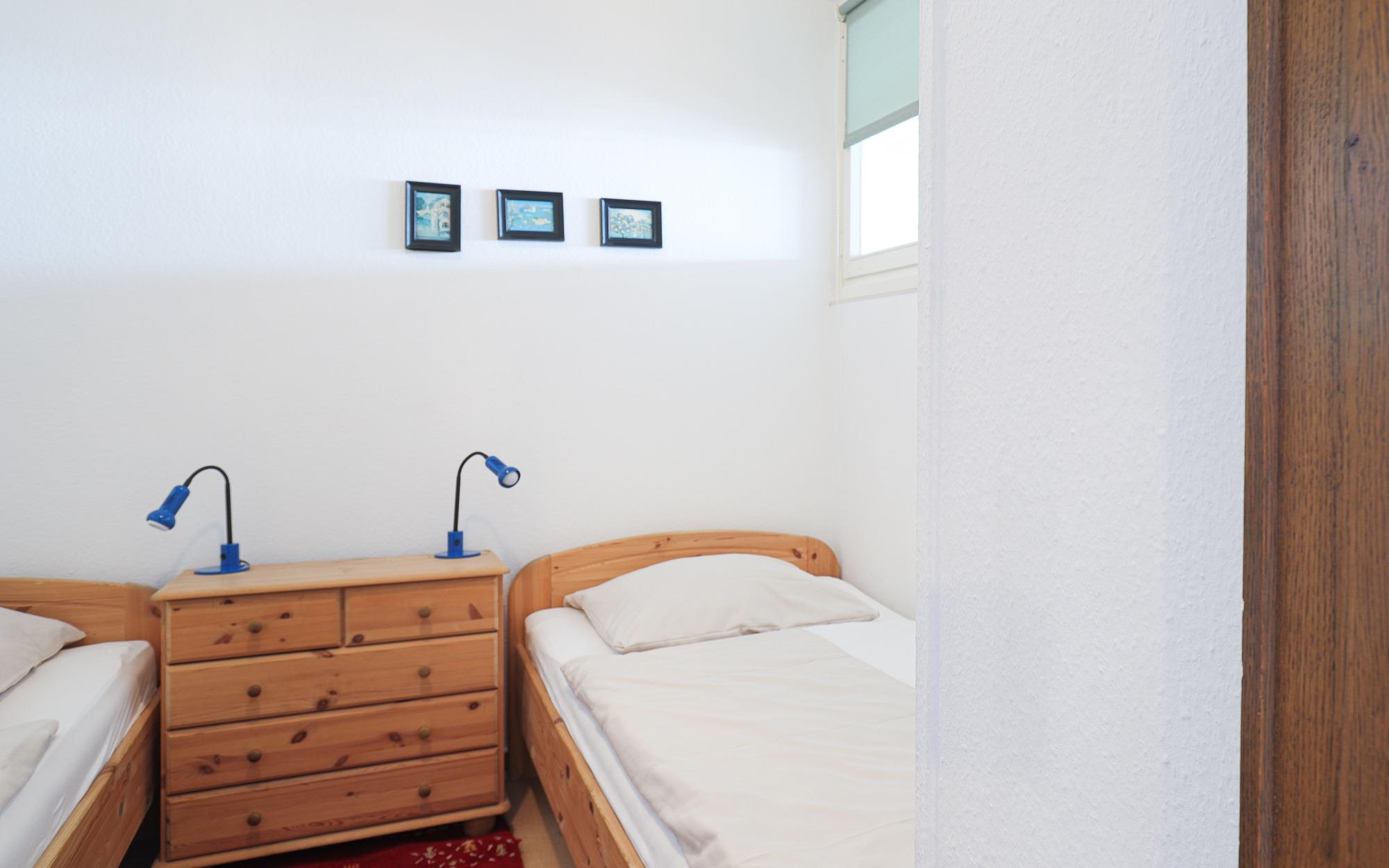 Im separaten Schlafzimmer stehen zwei Einzelbetten (je 90 × 200 cm) zur Verfügung, die eine angenehme Schlafumgebung bieten. Zusätzlich befindet sich im kombinierten Wohn- und Schlafbereich ein Schlafsofa (Liegefläche ca. 160 × 200 cm), das sich für zwei weitere Personen eignet. So ist die Wohnung sowohl für Paare als auch für kleine Familien oder Freunde gut nutzbar.