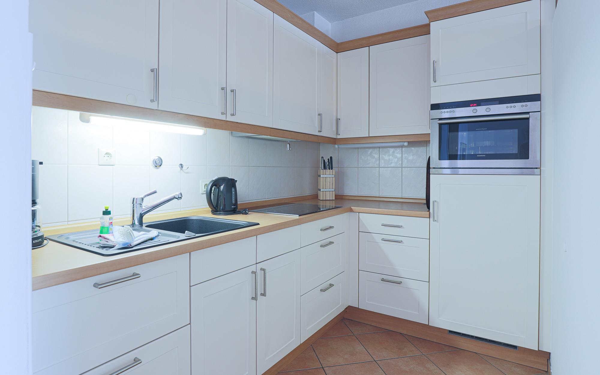 Eine integrierte Küchenzeile ermöglicht die einfache Selbstverpflegung während Ihres Aufenthalts. Frühstück oder kleinere Mahlzeiten lassen sich hier problemlos zubereiten. Alternativ erreichen Sie Restaurants, Cafés und Einkaufsmöglichkeiten direkt im Haus oder in unmittelbarer Umgebung des Panoramahauses.