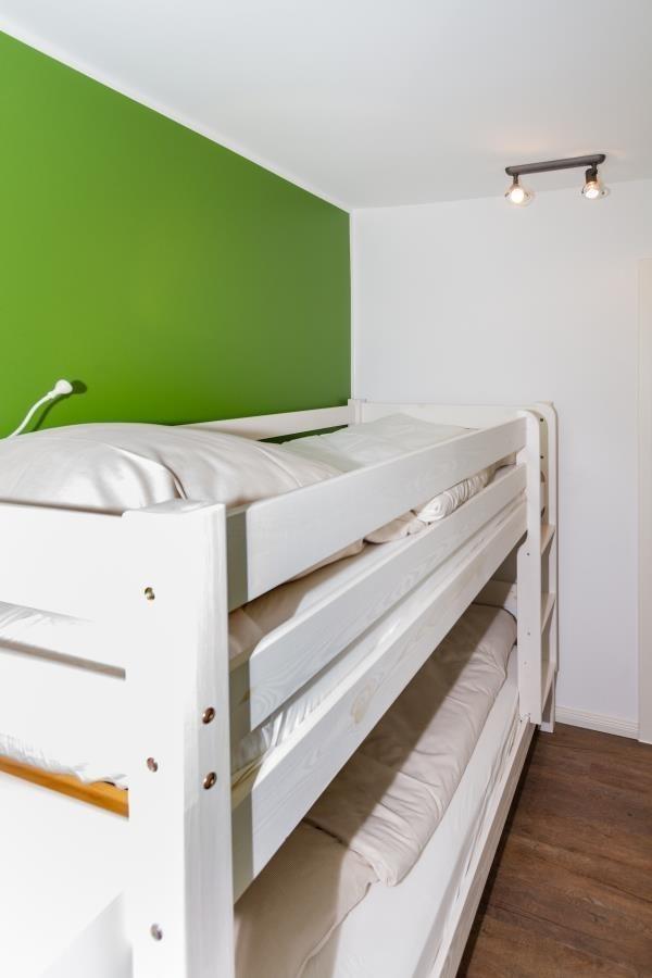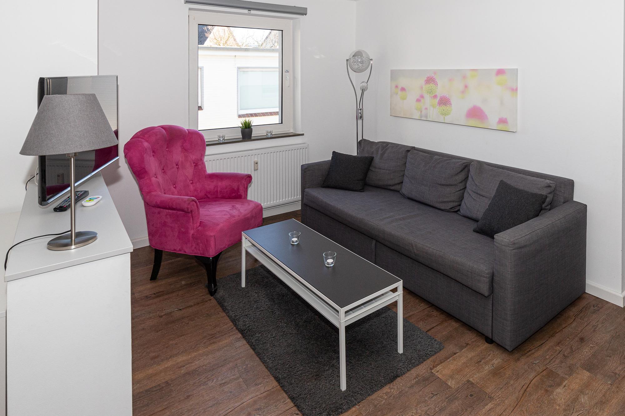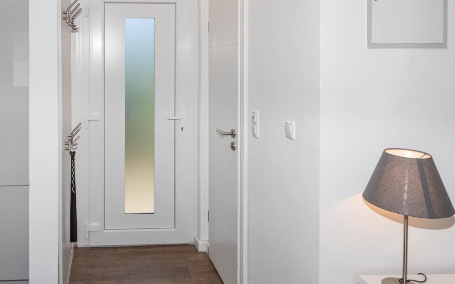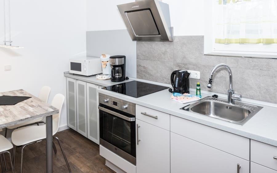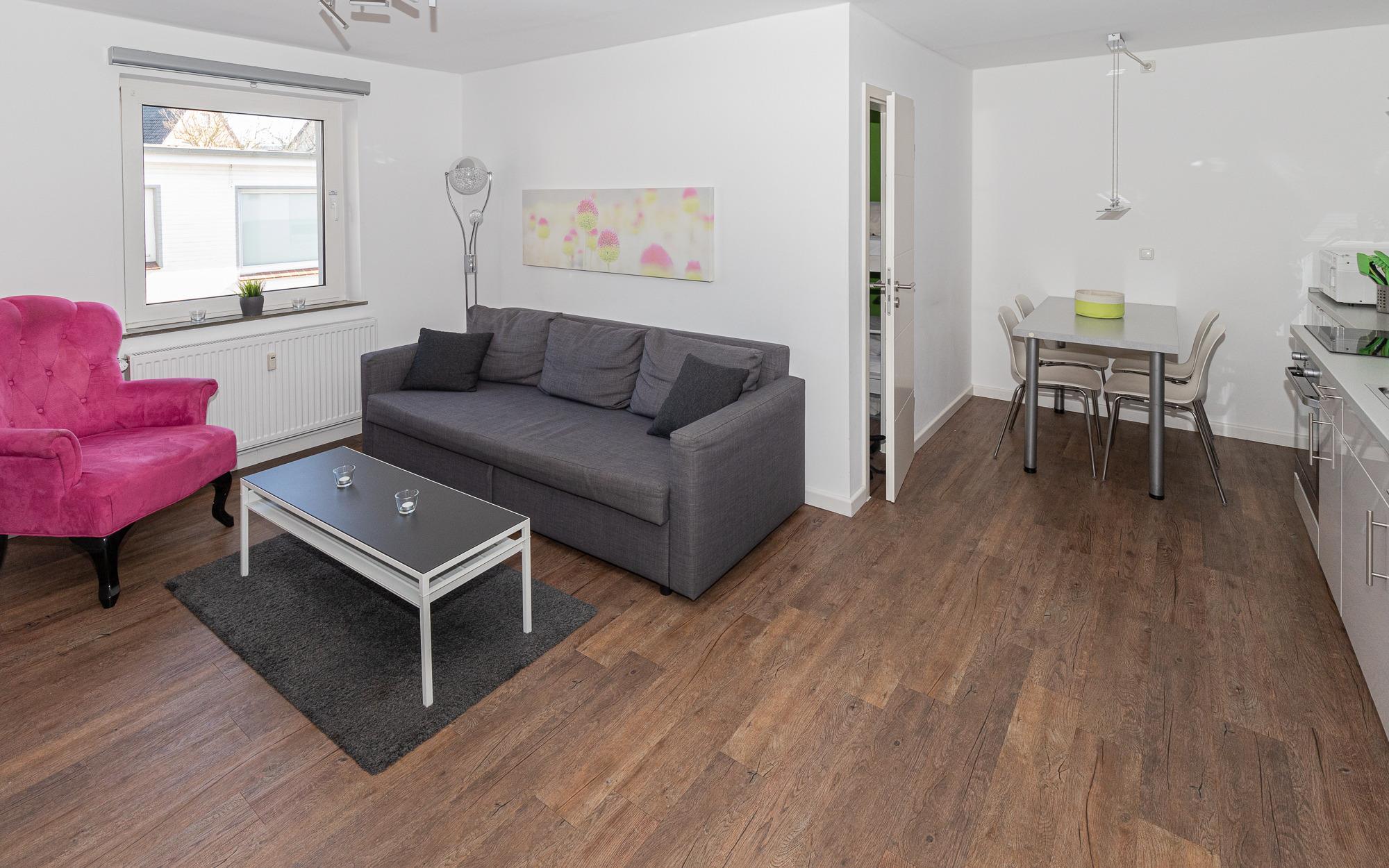 Pier 12 - Ferienwohnung Nr. 5 befindet sich in der ebenerdigen Erweiterung des Haupthauses. Die Wohnung ist für max. 4 Personen vorgesehen. Die Wohnung 5 bietet eine Suite mit einem Boxspring-Komfortdoppelbett, gemütlicher Couch und offener Küche. Vom Bett und/ oder der Couch kann der Urlaubstag auch vor dem modernen Flat Screen TV ausklingen. Die Küche ist mit Herd mit Cerankochfeld und Backofen, Mikrowelle, Toaster, Kaffeemaschine, Wasserkocher und Geschirr ausgestattet; weiterhin gibt es einen schönen Essplatz für bis zu 4 Personen. In einem separaten Schlafraum befindet sich ein -auch erwachsenengeeignetes- Doppelstockbett. Das moderne Tageslichtbad hat eine Dusche und WC. Die Wohnung hat einen direkten Zugang zu einer eigenen kleinen Terrasse mit Terrassenmöbeln und grenzt direkt an den großen und neu angelegten Garten.