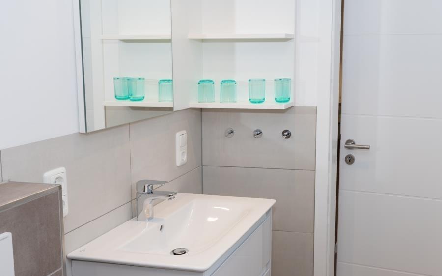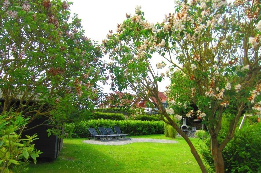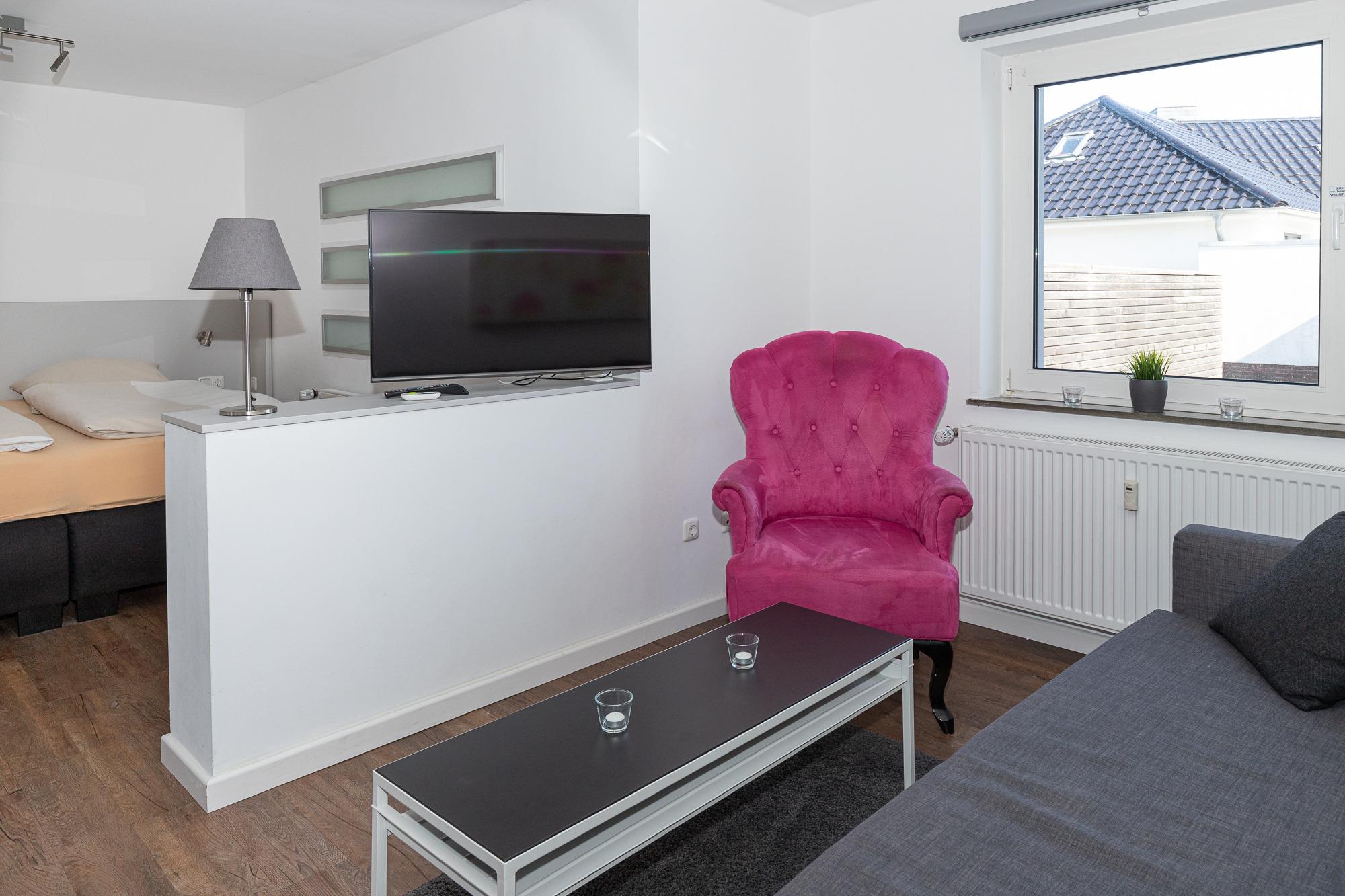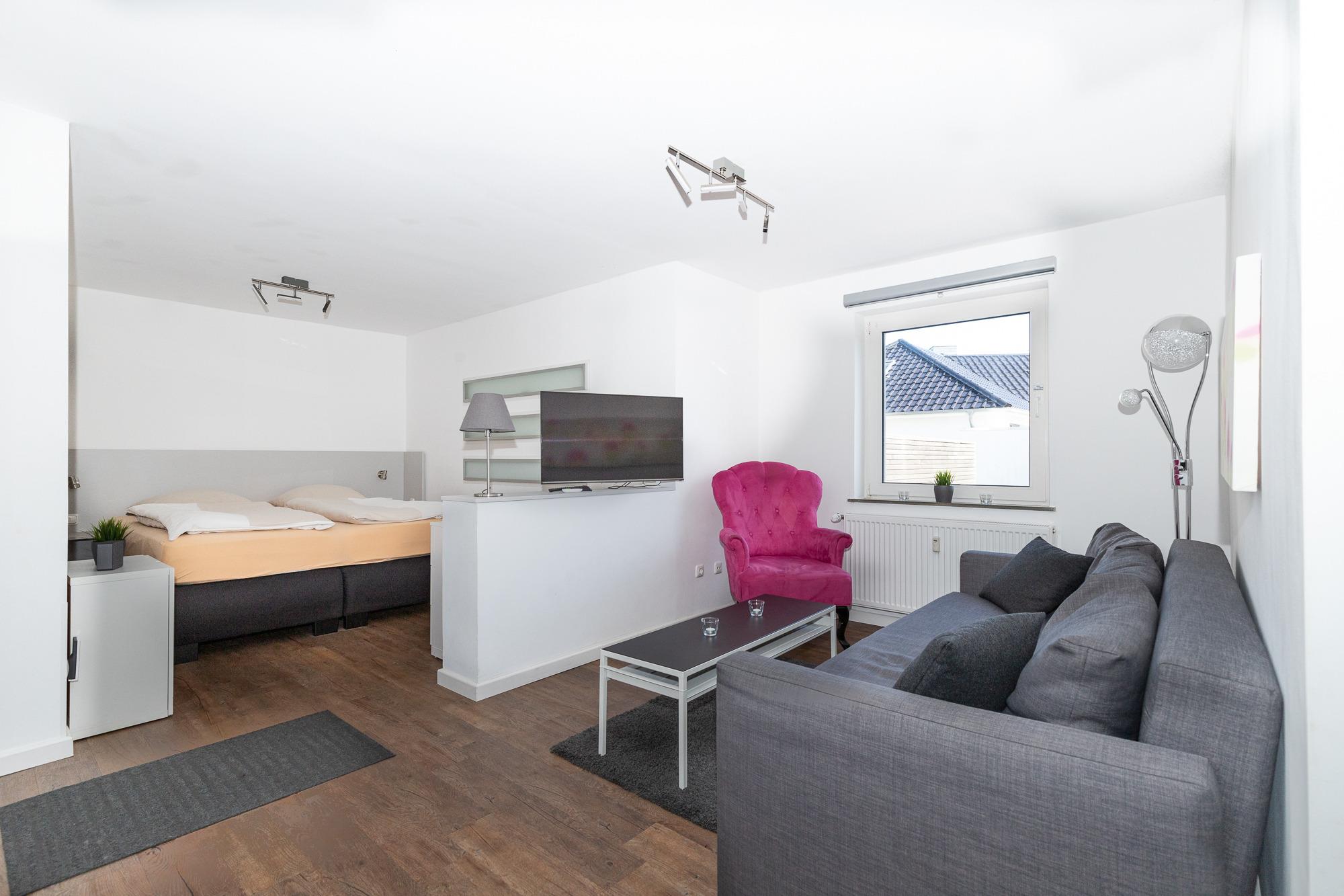 Pier 12 - Ferienwohnung Nr. 5 befindet sich in der ebenerdigen Erweiterung des Haupthauses. Die Wohnung ist für max. 4 Personen vorgesehen. Die Wohnung 5 bietet eine Suite mit einem Boxspring-Komfortdoppelbett, gemütlicher Couch und offener Küche. Vom Bett und/ oder der Couch kann der Urlaubstag auch vor dem modernen Flat Screen TV ausklingen. Die Küche ist mit Herd mit Cerankochfeld und Backofen, Mikrowelle, Toaster, Kaffeemaschine, Wasserkocher und Geschirr ausgestattet; weiterhin gibt es einen schönen Essplatz für bis zu 4 Personen. In einem separaten Schlafraum befindet sich ein -auch erwachsenengeeignetes- Doppelstockbett. Das moderne Tageslichtbad hat eine Dusche und WC. Die Wohnung hat einen direkten Zugang zu einer eigenen kleinen Terrasse mit Terrassenmöbeln und grenzt direkt an den großen und neu angelegten Garten.