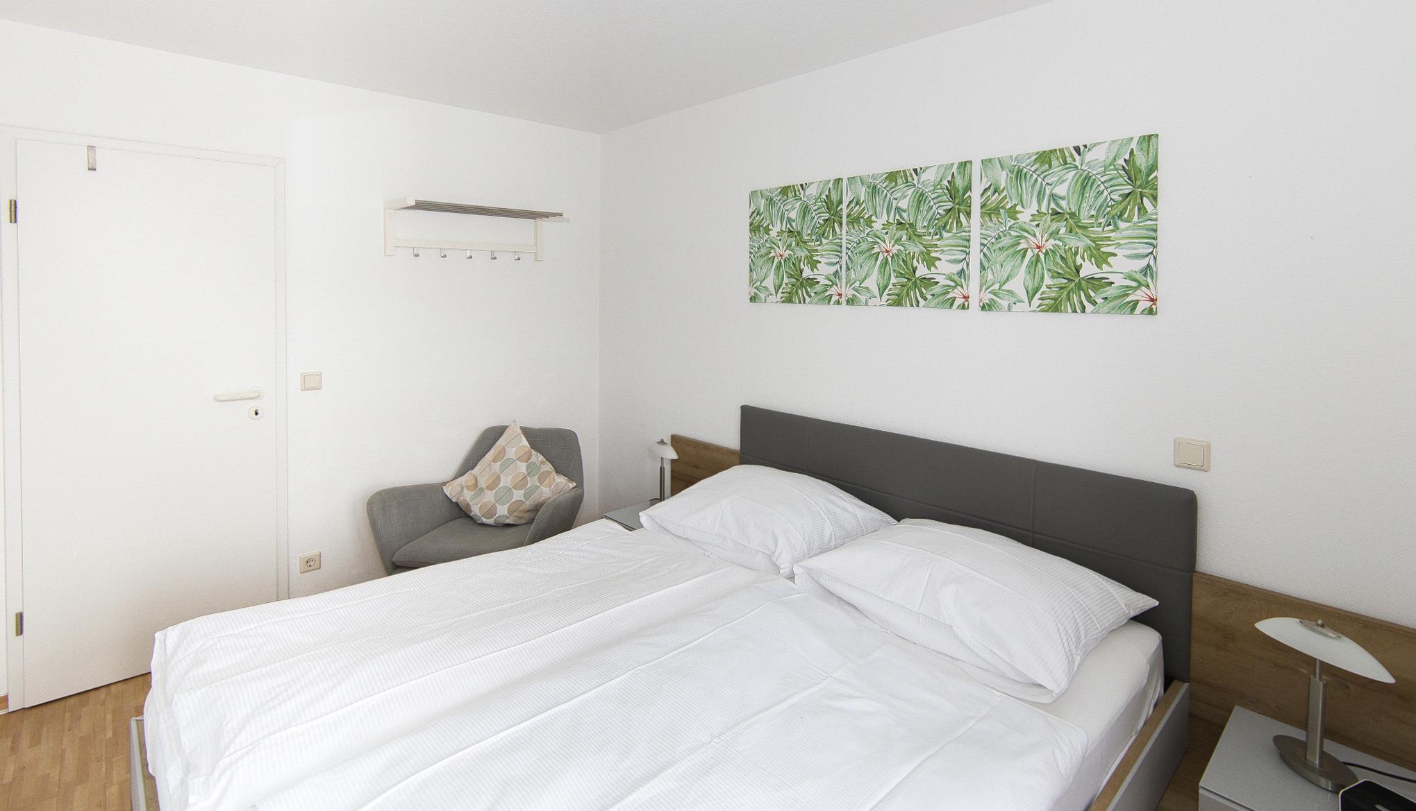 Das Schlafzimmer ist mit einem Doppelbett (bequeme Betthöhe: 55 cm) ausgestattet, um Ihnen erholsame Nächte zu garantieren. Handtücher, Kinderbett und Hochstuhl können auf Wunsch gegen eine kleine Gebühr bereitgestellt werden. Ein PKW-Stellplatz befindet sich direkt vor dem barrierefreien Weg zum Eingang. Der Zugang zum Haus und zum Aufzug ist ebenfalls barrierefrei. Der wohnungseigene Keller steht Ihnen zur Verfügung, um Koffer, Kinderwagen, kleine Kinderfahrräder, Fahrradanhänger o.ä. zu lagern.