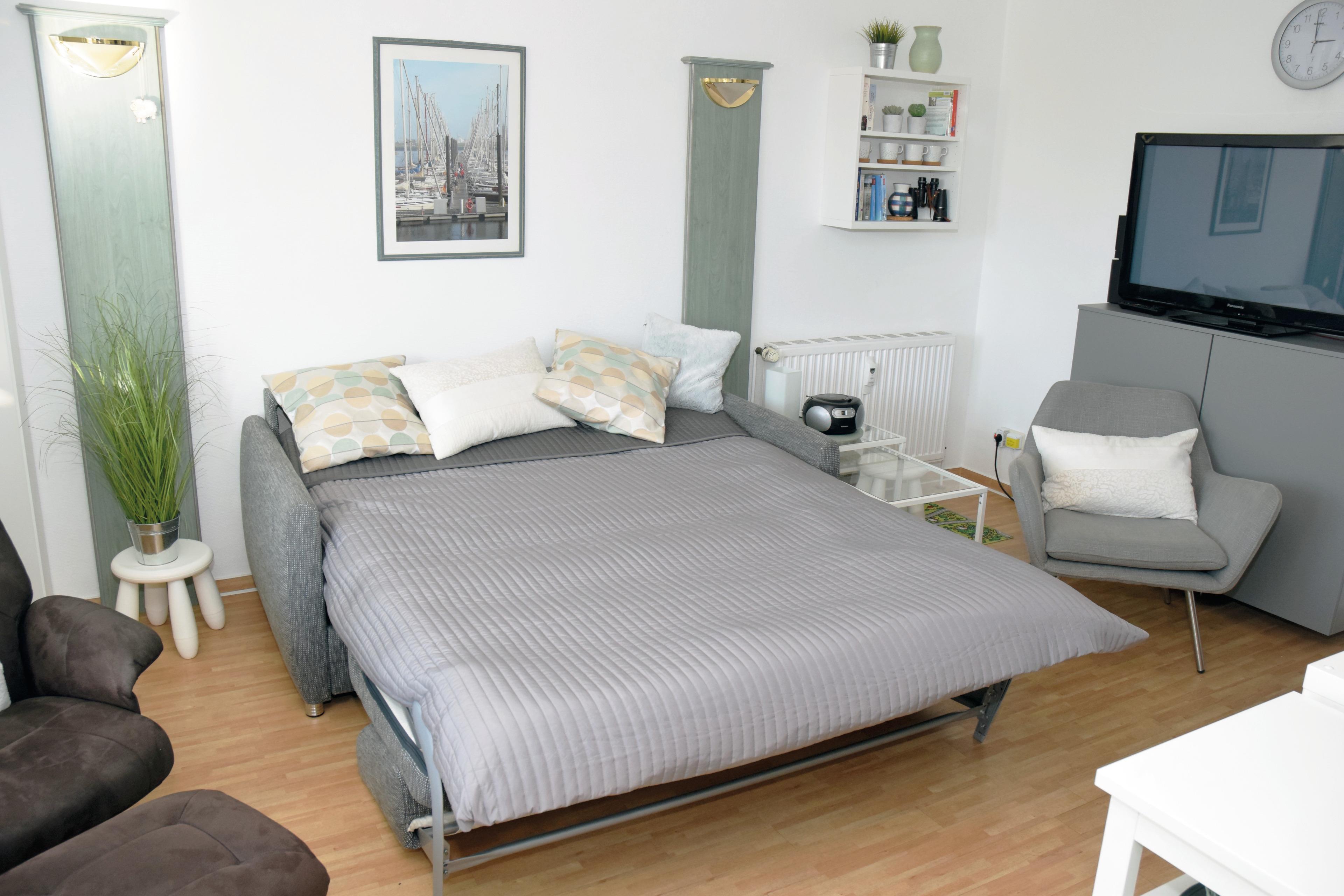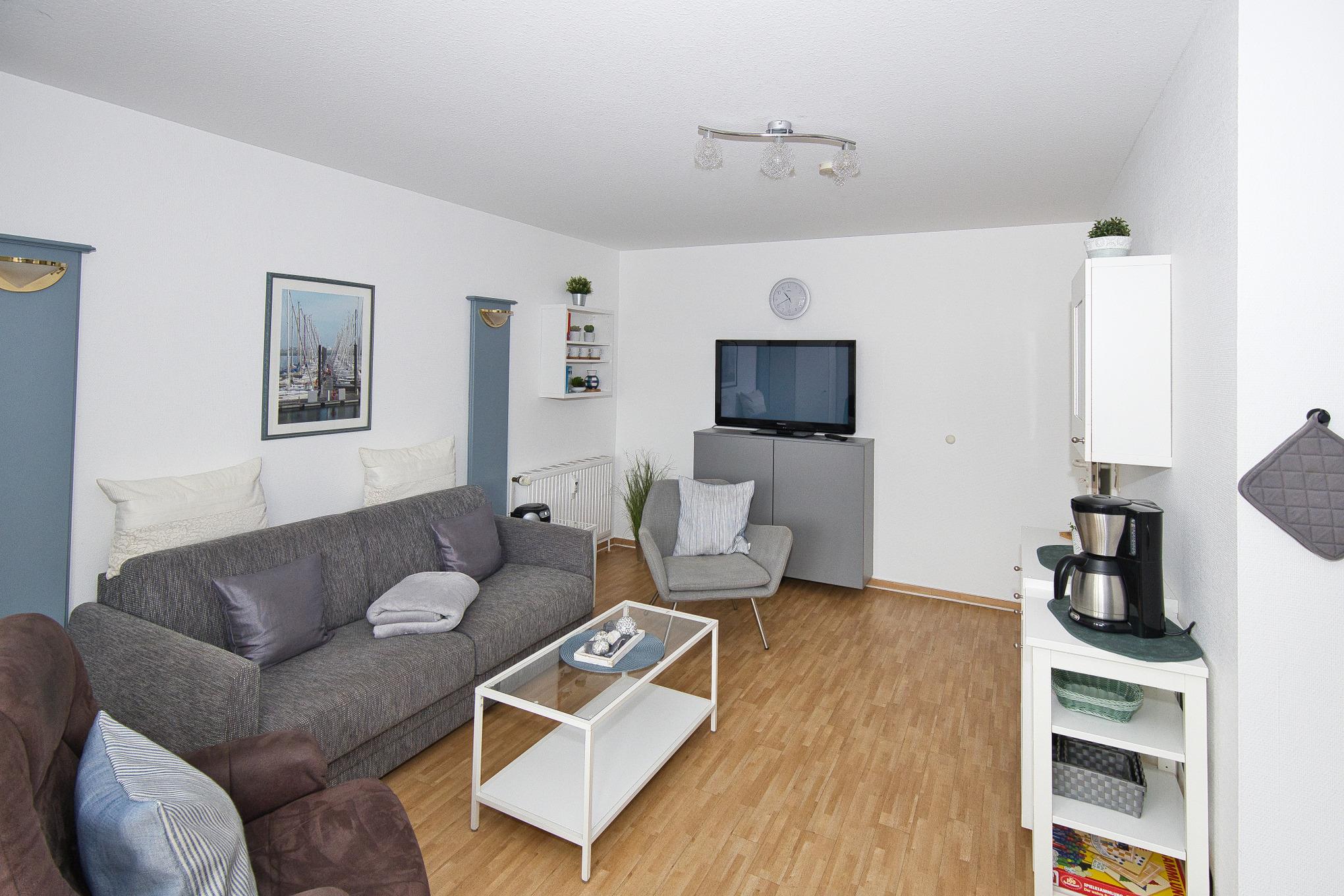 Diese lichtdurchflutete 2-Zimmer-Wohnung mit West-Balkon und gemütlichem Fenstersitzplatz erstreckt sich über großzügige 44 m² und ist für 2-4 Personen eingerichtet. Der gemütliche Wohnbereich bietet Platz für bis zu 4 Personen, wobei die optimale Belegung für 2 Personen ist. Sollten Sie jedoch mit bis zu 4 Personen reisen, verwandelt sich das Sofa in ein komfortables Schlafsofa. Im Wohnbereich finden Sie ausreichend Stauraum für die persönlichen Dinge des 3. und 4. Gastes.