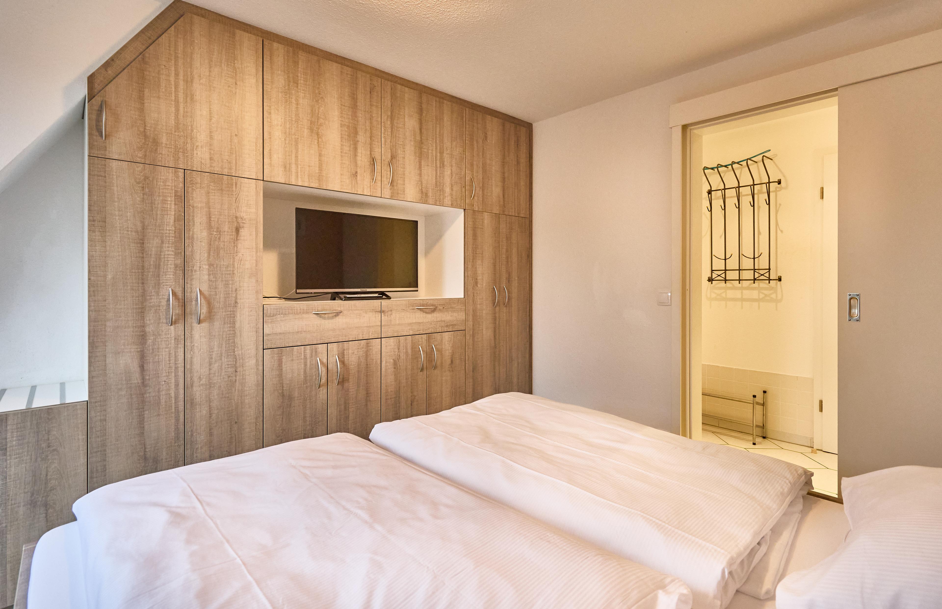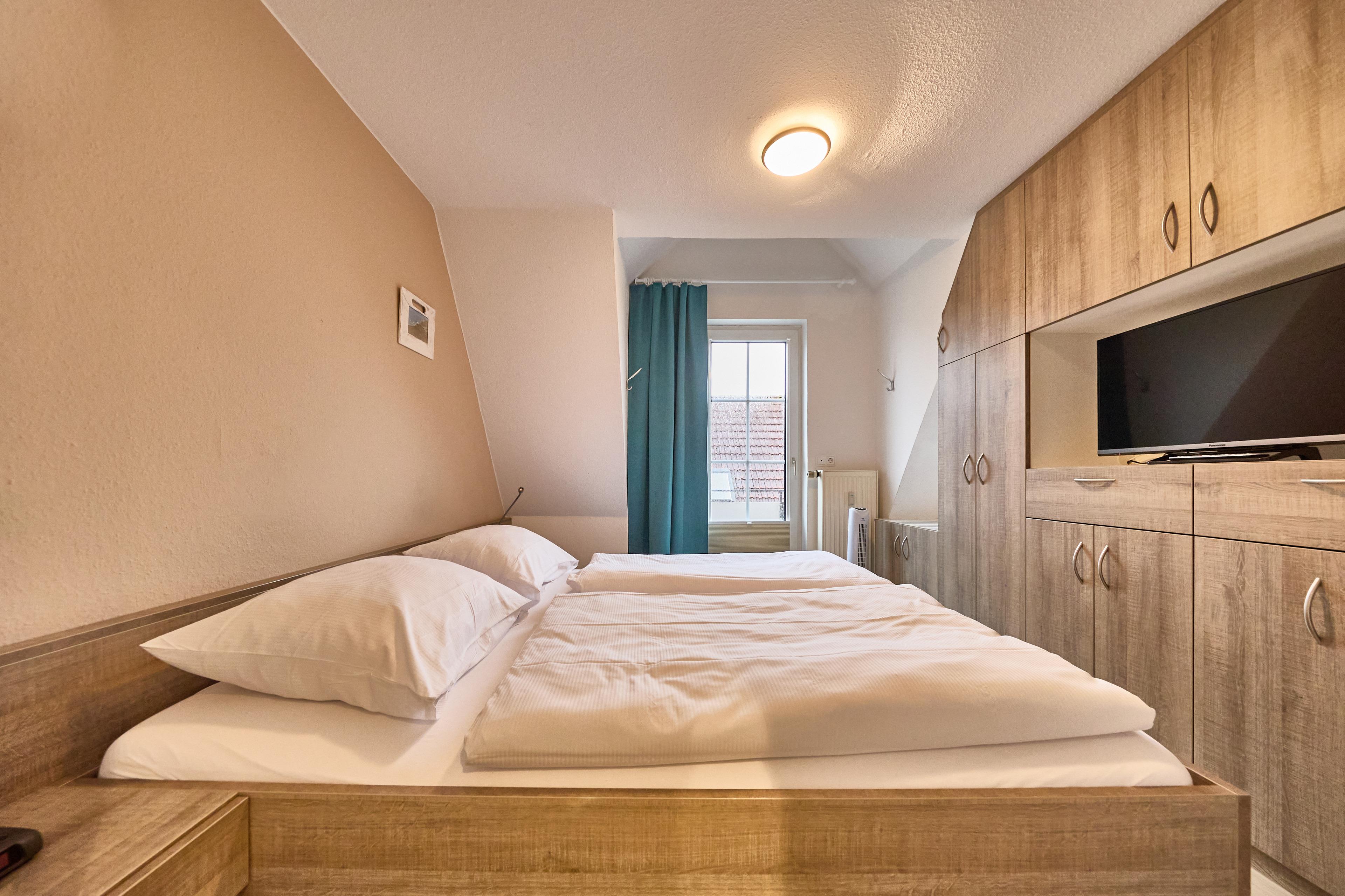 Das sehr komfortable Schlafzimmer (Tischler-Maßeinbau) ist mit einem Doppelbett und einem großem Kleiderschrank, einem 2. TV und weiteren Annehmlichkeiten eingerichtet. Von hier aus kommen Sie auch auf einen kleinen Balkon, von dem man eine wunderschönen Neuwerkblick genießen kann. An allen Fenstern sind zusätzlich Plissees montiert.