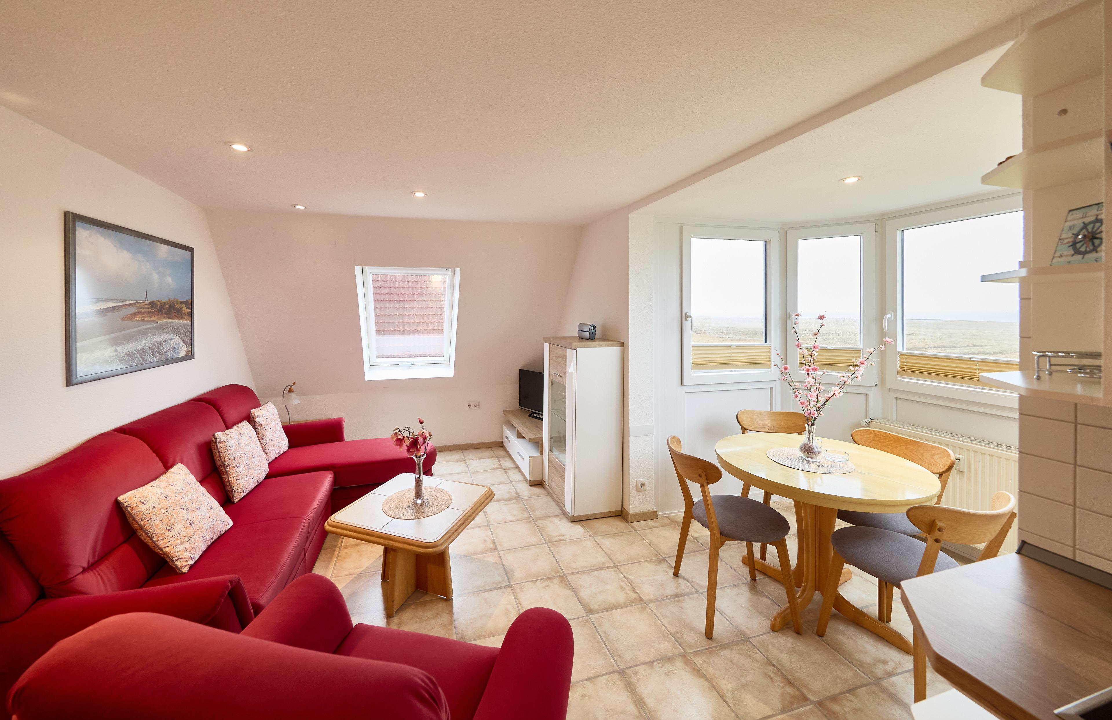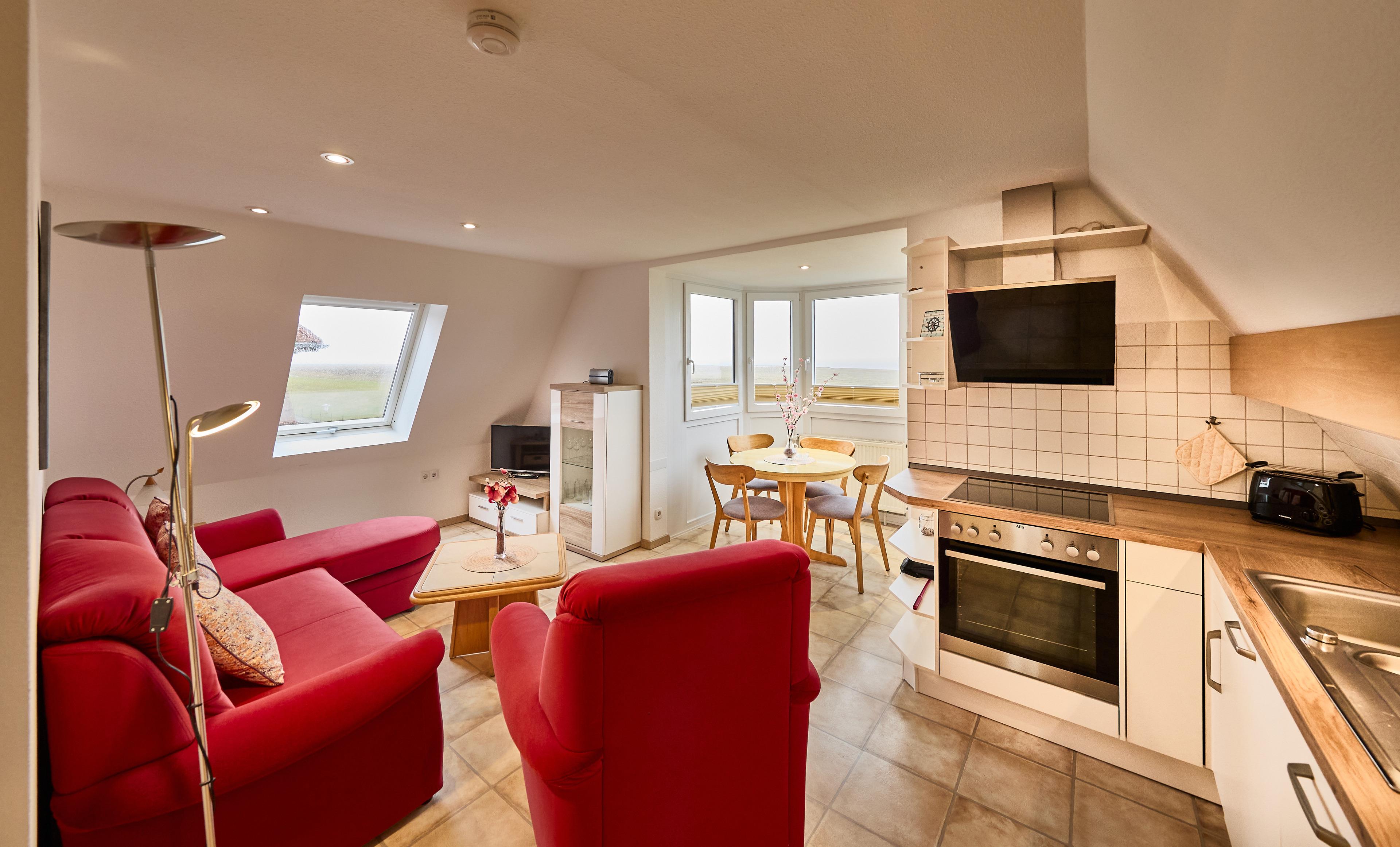 Robbenplate Duhnen - Bei dem Ferienquartier, FeWo 20 im 2.OG der Robbenplate handelt es sich um eine gemütlich eingerichtete 2-Raum Ferienwohnung bestehend aus einem Wohn- (mit Flachbild-TV) und Essbereich, ausgestattet mit einer Einbauküche und der unverbauten Seesicht vom Essbereich. Ein zusätzliches Dachfenster macht diese Wohnung schön hell und bietet gefühlsmäßig einfach mehr Seesicht. Einfach schön.