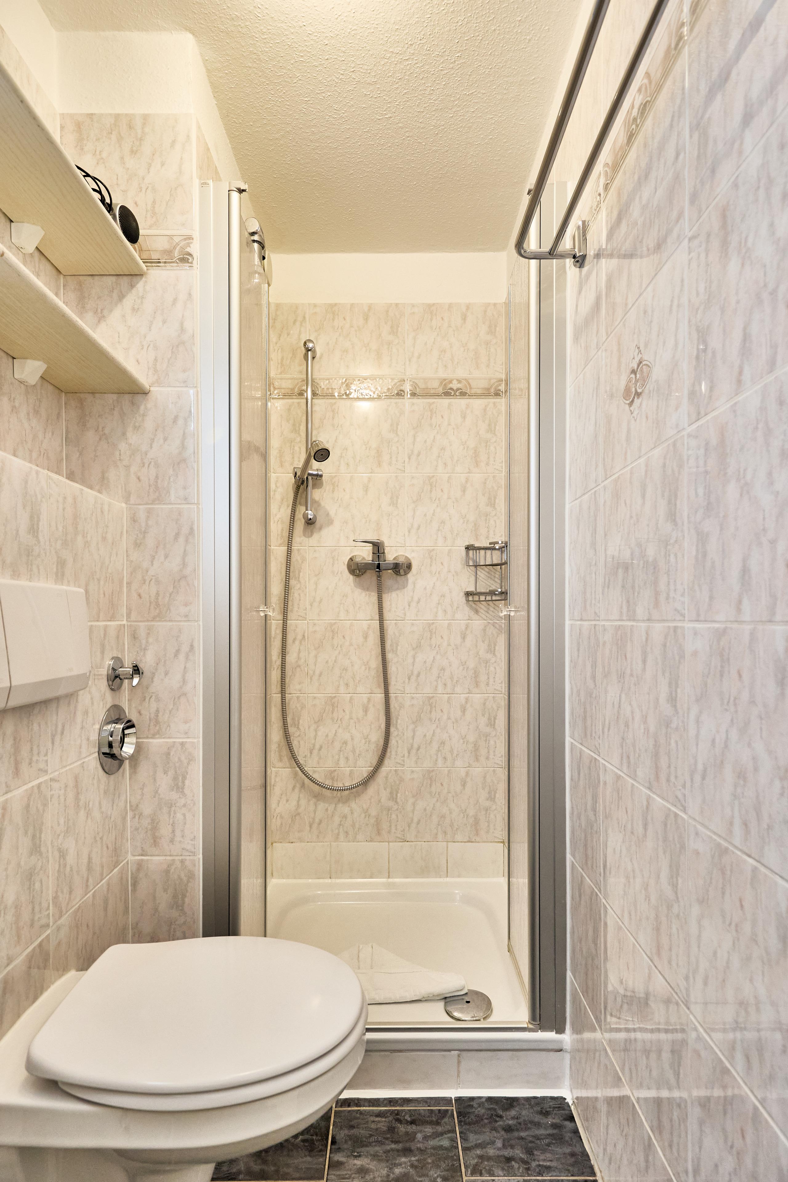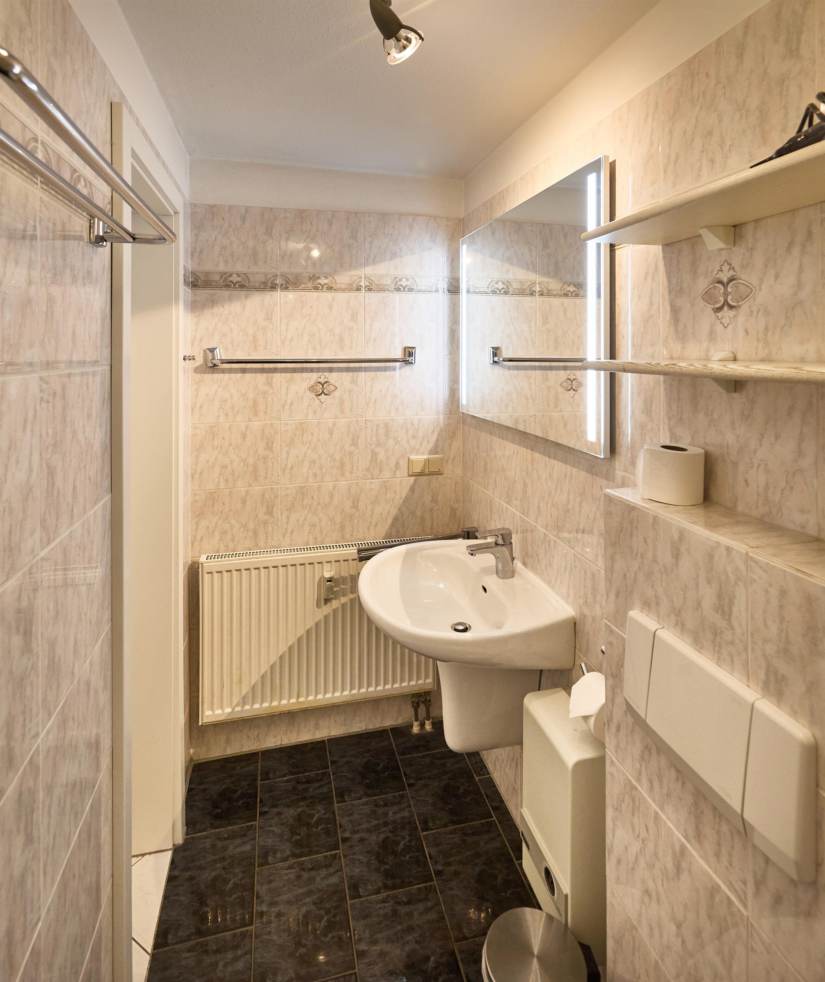Das innenliegende Duschbad mit WC wurde Anfang 2026 komplett neu modernisiert. Es bietet eine schöne Beleuchtung und Ablagen. So kann der Morgen starten.