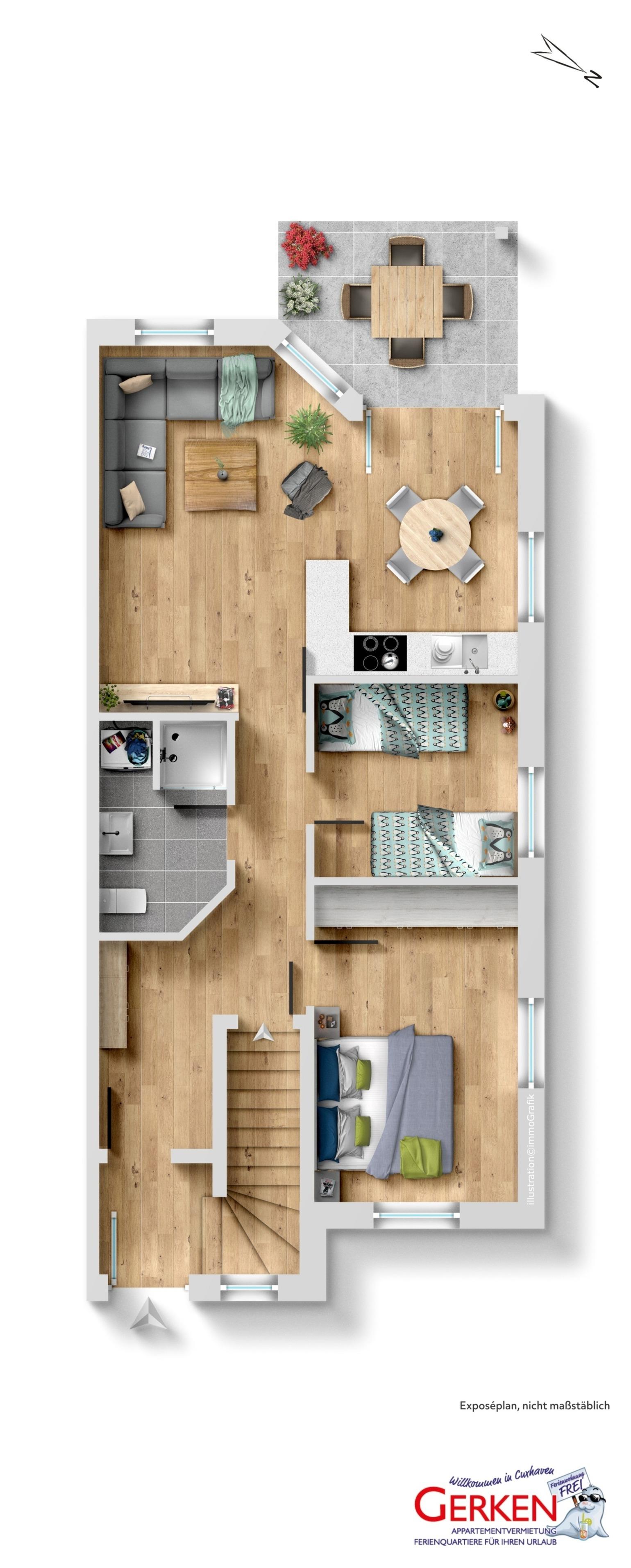 Die ebenerdige Ferienwohnung befindet sich im Erdgeschoss und bietet eine überdachte Süd-West-Terrasse mit direktem Zugang zum Garten, wo ein Strandkorb für Sie bereitsteht. Dank der stufenlosen Bauweise ist die Wohnung problemlos erreichbar und auch für gehbehinderte Gäste geeignet. Zu bedenken ist, dass die Tiefgarage zum Gehweg und den Eingängen der Wohnung nicht über einen Fahrstuhl verfügt.