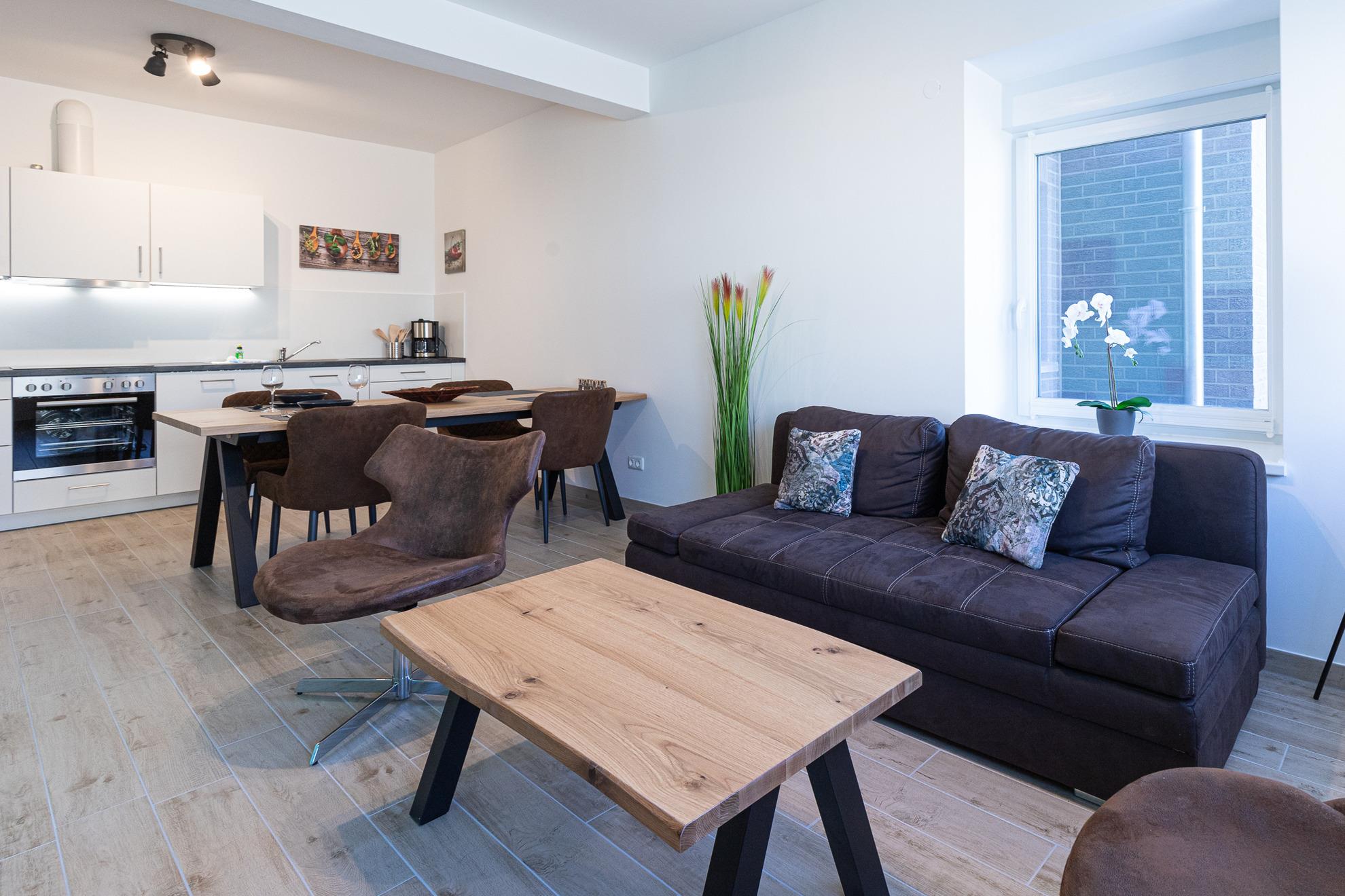 Sahlenburger Weg 17 für bis zu 4 Personen. Fußläufig zum Ortskern ist die barrierefreie, neu sanierte Wohnung ebenerdig gelegen. Sie wohnen in hellen Räumen in modernem Ambiente. Die voll ausgestattete Küche verfügt über Herd und Backofen, Kühlschrank mit Gefrierfach, Spülmaschine, Mikrowelle, Toaster, Wasserkocher und Kaffeemaschine. Das Badezimmer bietet Ihnen mit barrierefreier Dusche und Bidet allen notwendigen Komfort. Ein Schlafzimmer ist mit Doppelbett, das zweite Schlafzimmer mit einem Etagenbett funktional eingerichtet. Eine Waschmaschine finden Sie im Flur zum Fahrradraum, über den Sie auf die möblierte Terrasse gelangen. Wenn Gräser und Lavendel blühen ist es ein wohltuender Ort der Entspannung. Alle Fenster verfügen über Plissees, Rollläden und Fliegengitter. Auch können Sie einen kleinen Abstellraum, der von der Terrasse aus für Sie erreichbar ist, für Fahrrad oder Bollerwagen bzw. Kinderwagen nutzen. [nbsp]Die Fußbodenheizung bietet behagliche Wärme. WLAN ist kostenfrei. Erstbezug 2021.