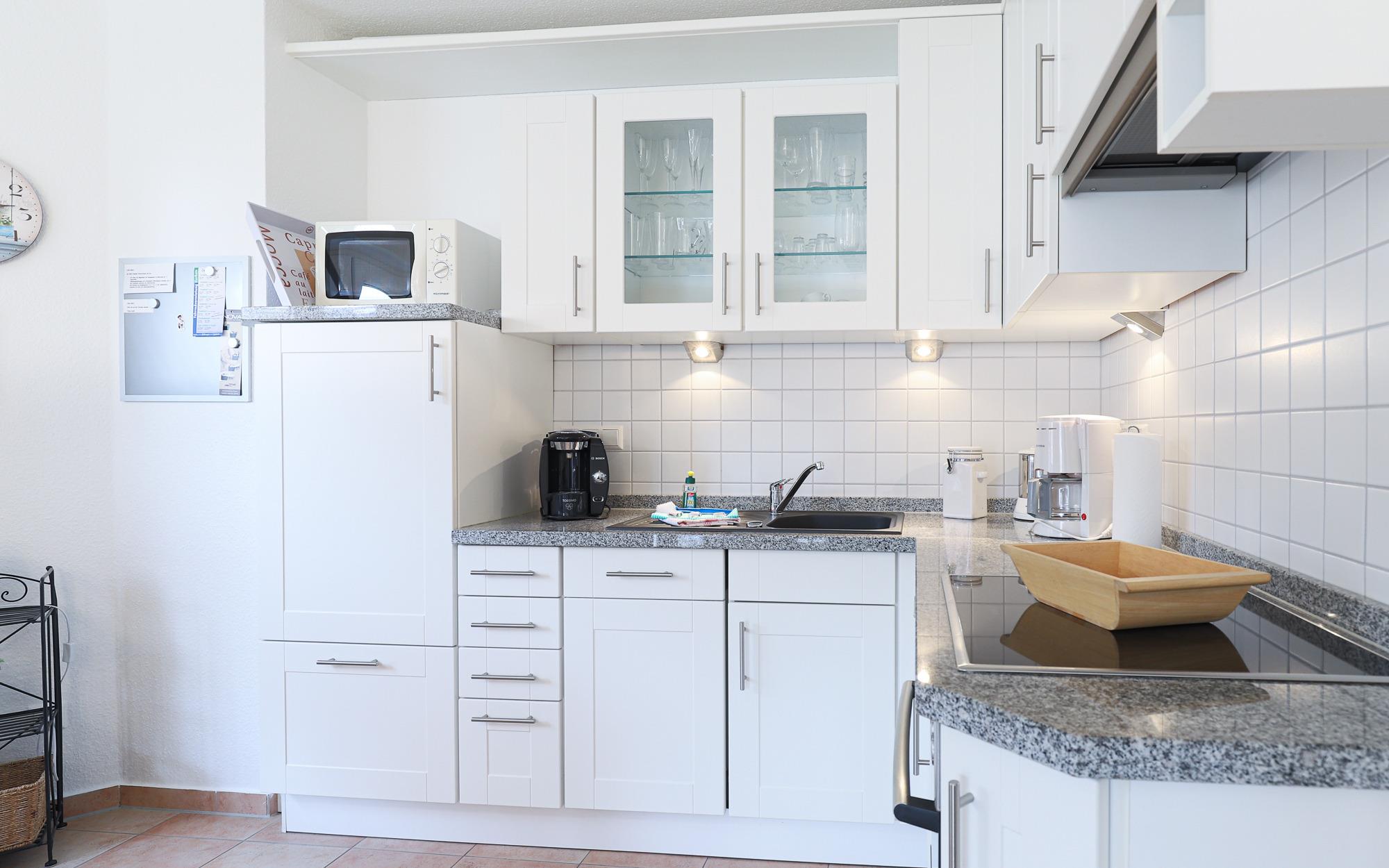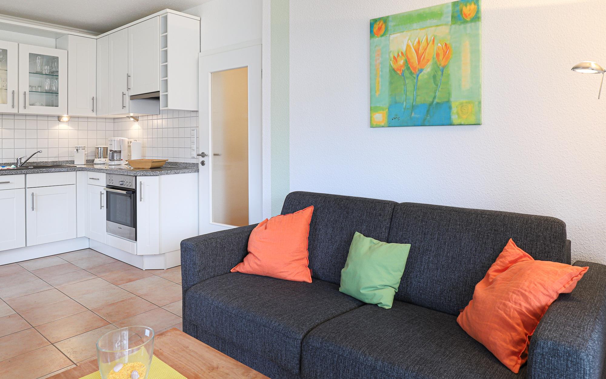 Diese sehr hochwertige Ferienwohnung (Wohn- und Essbereich, Flur und Bad komplett allergikerfreundlich) ist mit einem gemütlichen Schlafzimmer mit großem Kleiderschrank, einem Duschbad (Dusche/WC), einem Abstellraum (plus einem Kellerraum für Ihre Koffer) aufgeteilt. Im Wohn- und Essbereich mit einer sehr gut ausgestatteten Einbauküche (zusätzlich zur Kaffeemaschine eine Tassimo Kapselmaschine) und Zugang zur Terrasse können Sie den Tag genießen. Hier befindet sich auch die Schlafcouch für eine 3. Person. Ein zusätzlicher Strandkorb auf der Terrasse lädt zum gemütlichen Entspannen ein.