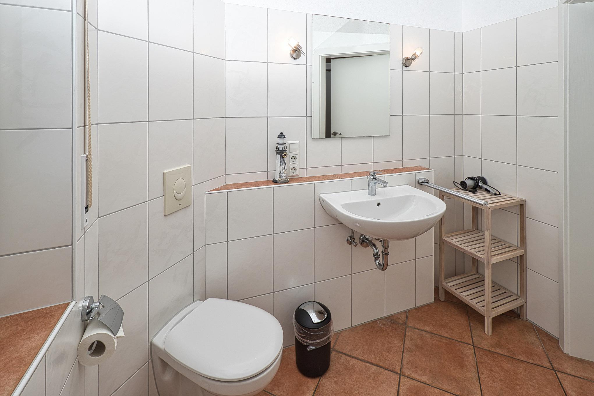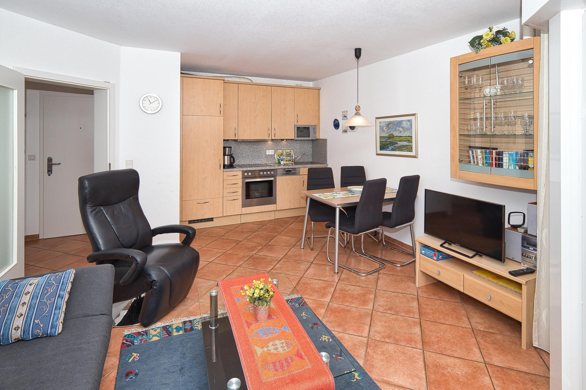 Strandburg, Whg. 4, 2-Raum, ca. 46m², Erdgeschoss, barrierefreie Wohnung mit Terrasse, bis zu 3 Personen, einfach Urlauben. Diese sehr schöne Ferienwohnung (komplett allergikerfreundlich) ist mit einem gemütlichen Schlafzimmer mit großem Kleiderschrank, einem Duschbad (Dusche/WC), einem Abstellraum (für Ihre Koffer) aufgeteilt. Im Wohn- und Essbereich mit einer sehr gut ausgestatteten Einbauküche und Zugang zur Terrasse können Sie den Tag genießen.